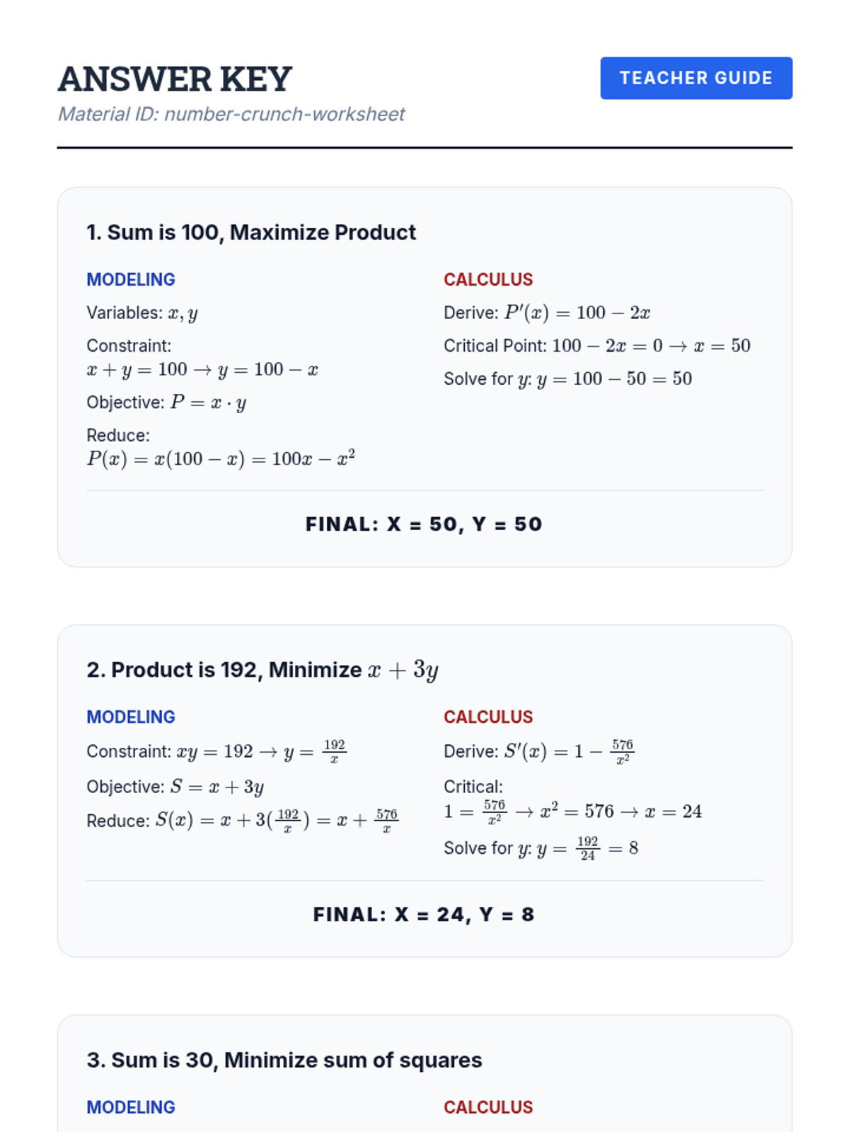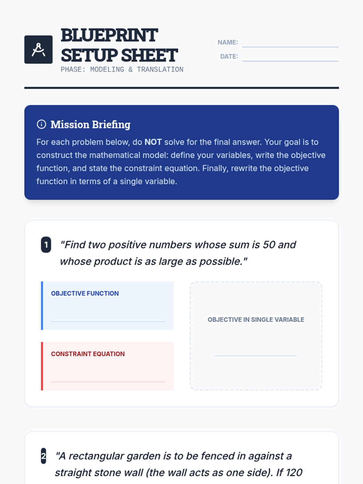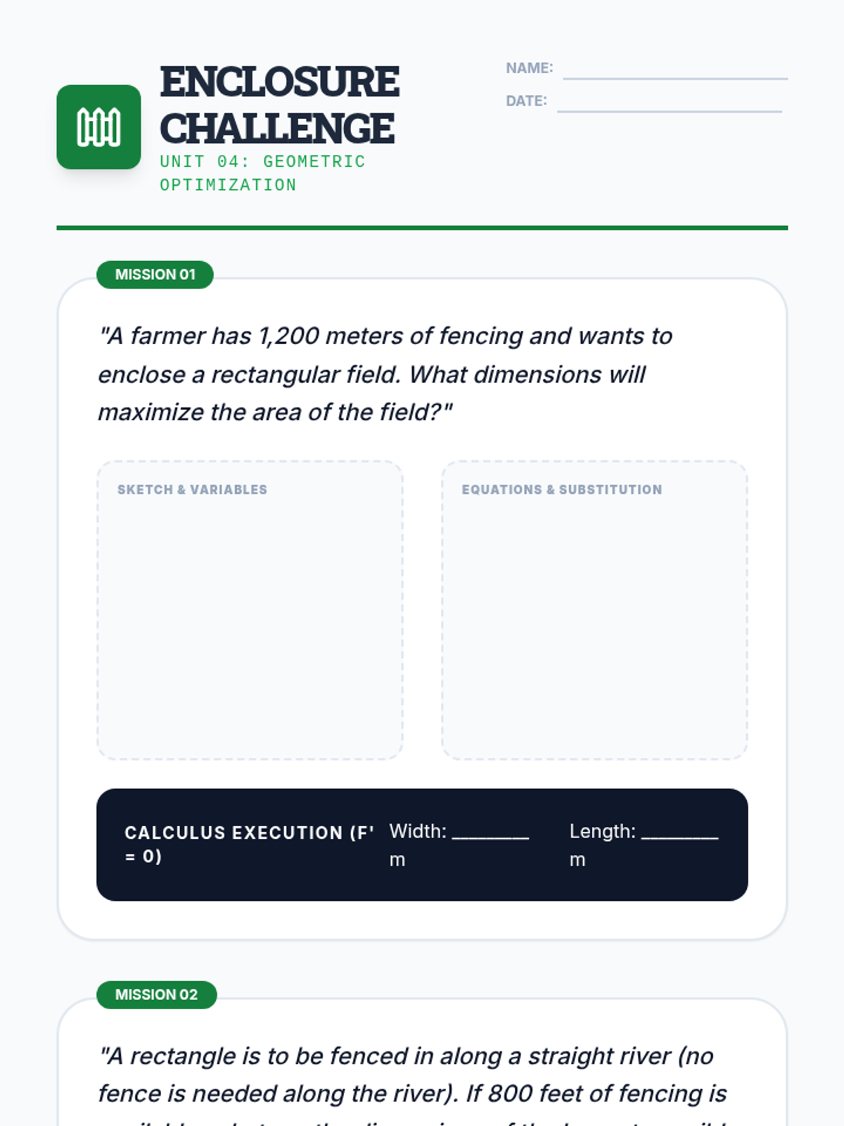 A comprehensive workshop series on optimization in calculus. Students master the Extreme Value Theorem, learn to translate complex word problems into mathematical models, and apply differentiation to find optimal outcomes in number theory and geometric contexts.