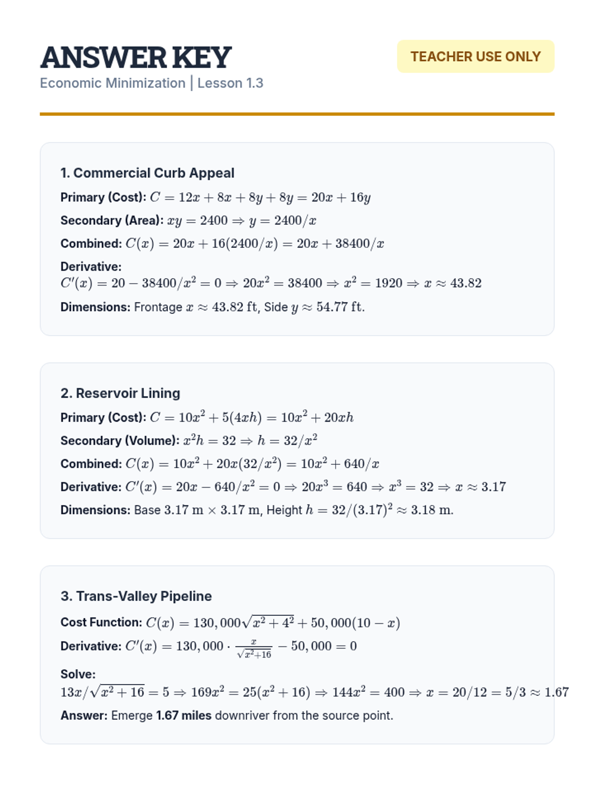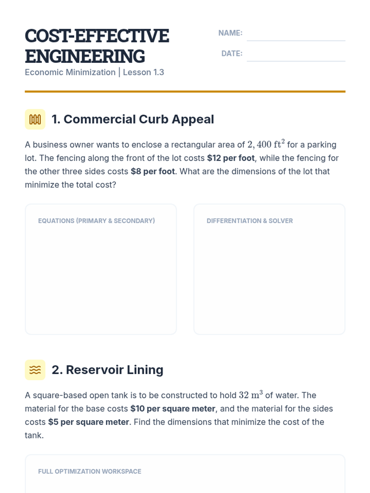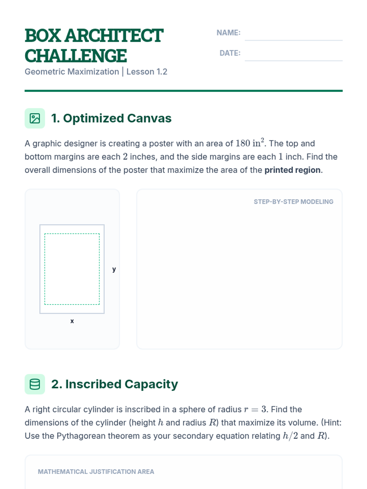 This sequence bridges the gap between theoretical calculus operations and applied problem-solving by focusing on optimization in real-world contexts. Students begin by mastering the 'modeling process'—translating verbal constraints into mathematical objective functions. Over five lessons, they progress from simple geometric maximization to complex economic minimization and physical efficiency problems. By the end, students will demonstrate proficiency in using the First and Second Derivative Tests to justify absolute extrema in manufacturing and design scenarios.