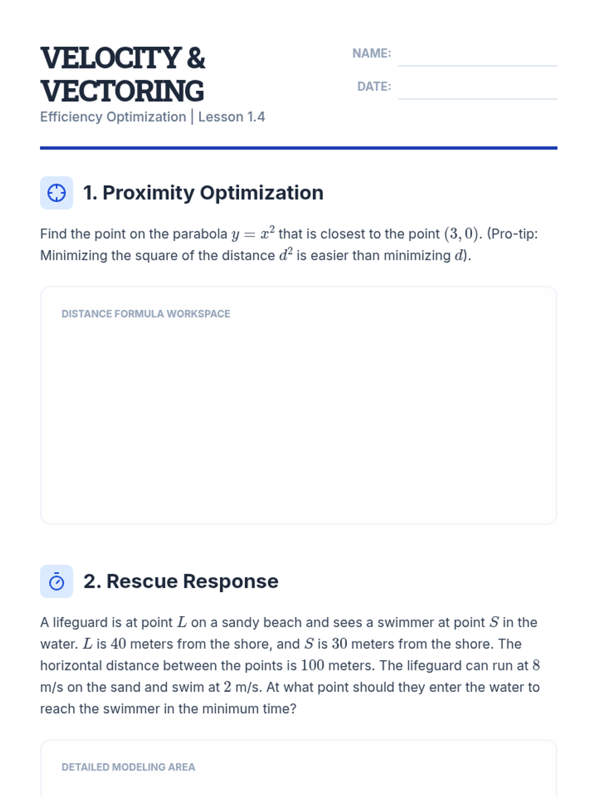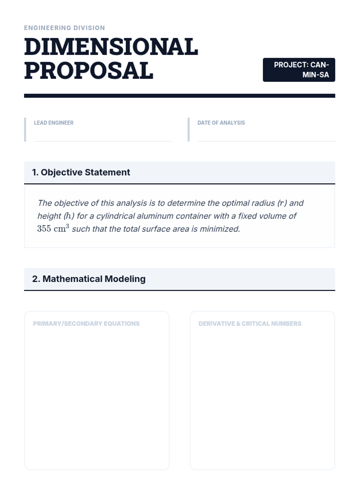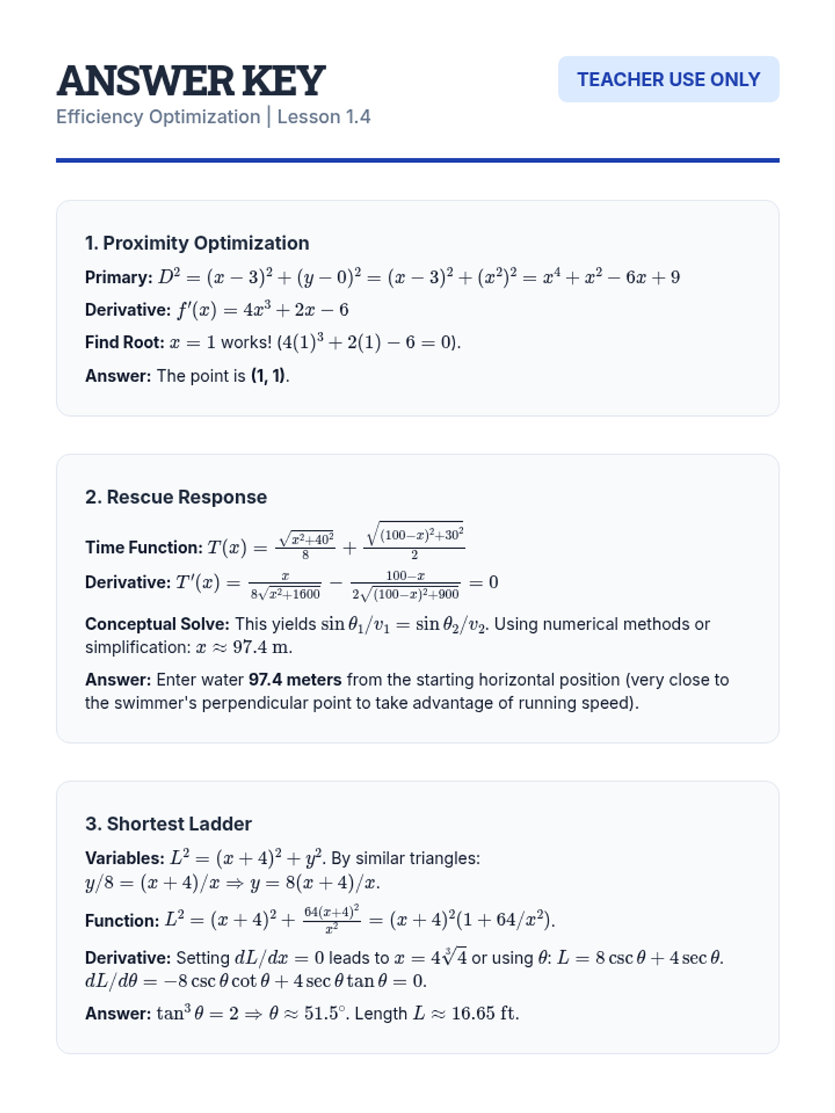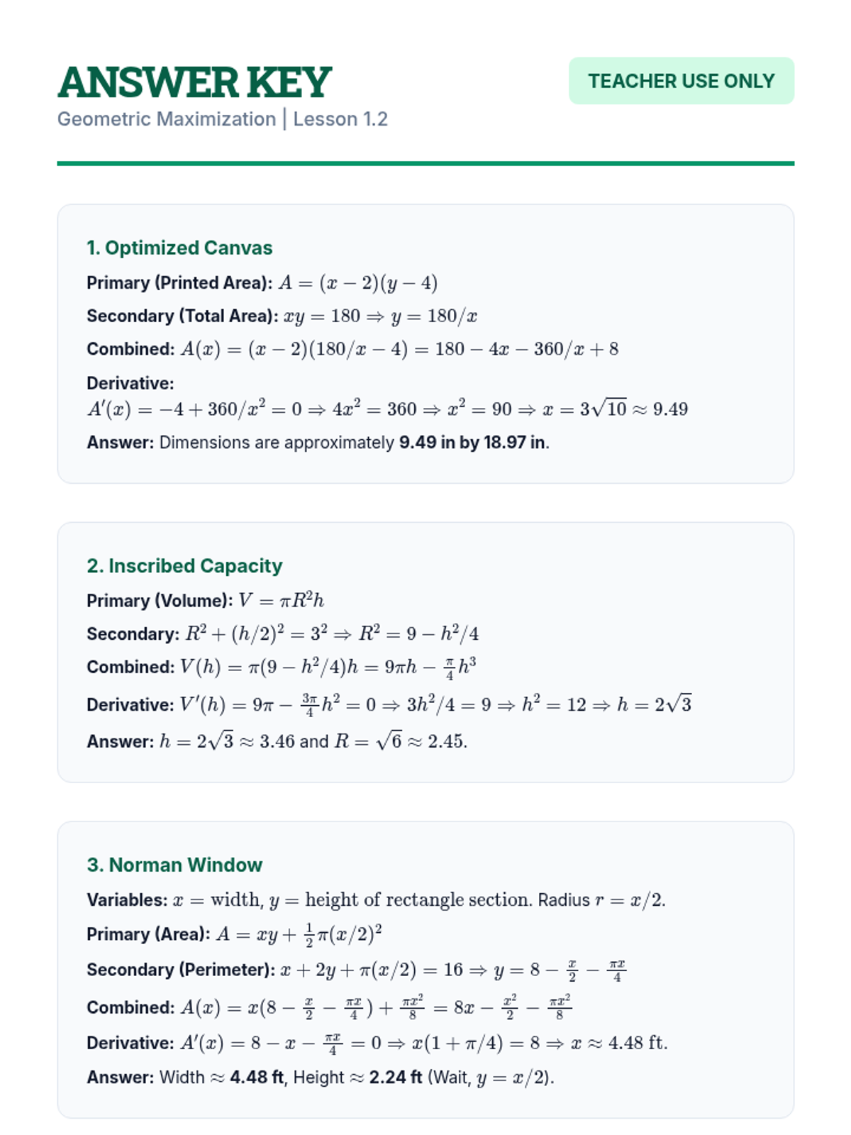 This sequence bridges the gap between theoretical calculus operations and applied problem-solving by focusing on optimization in real-world contexts. Students begin by mastering the 'modeling process'—translating verbal constraints into mathematical objective functions. Over five lessons, they progress from simple geometric maximization to complex economic minimization and physical efficiency problems. By the end, students will demonstrate proficiency in using the First and Second Derivative Tests to justify absolute extrema in manufacturing and design scenarios.