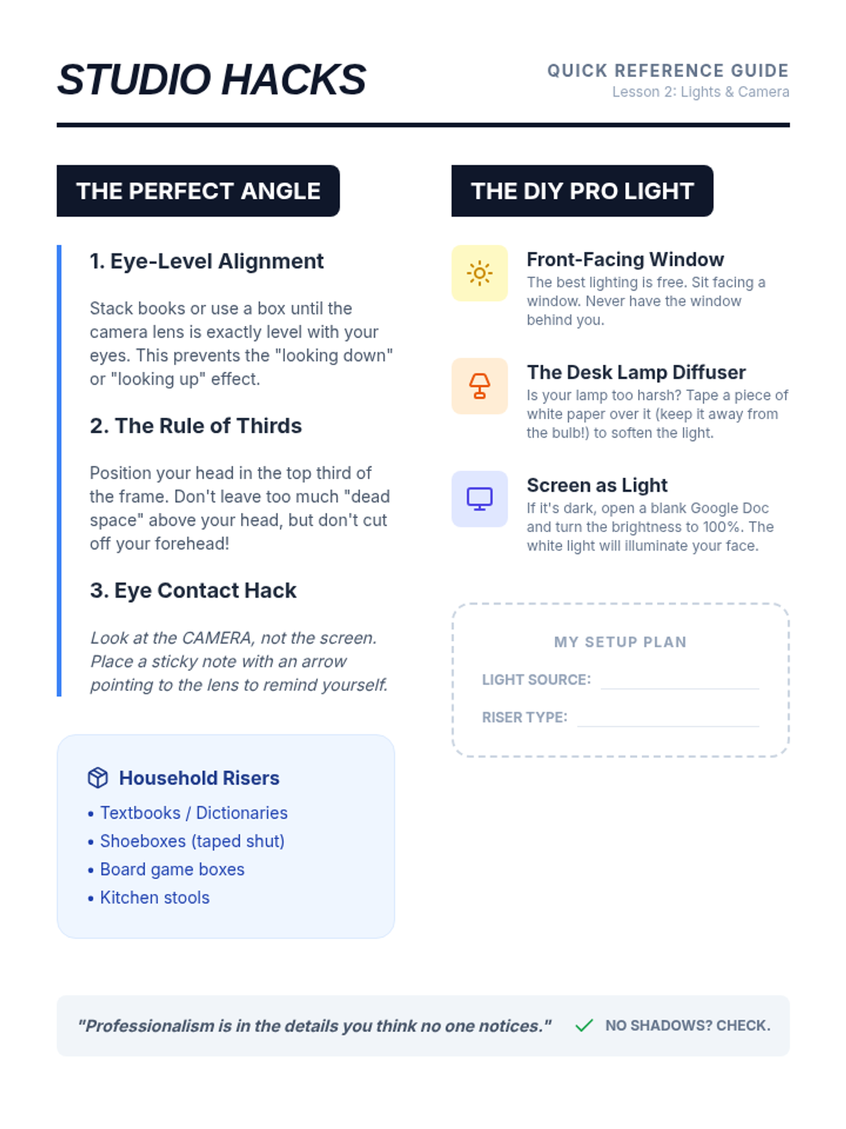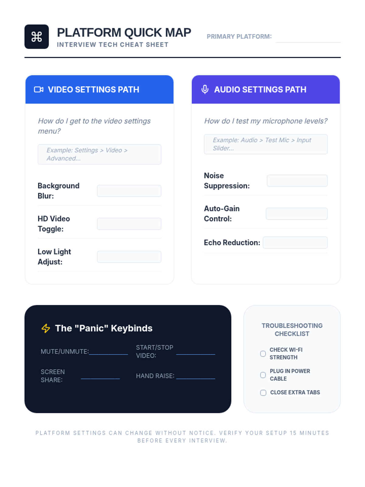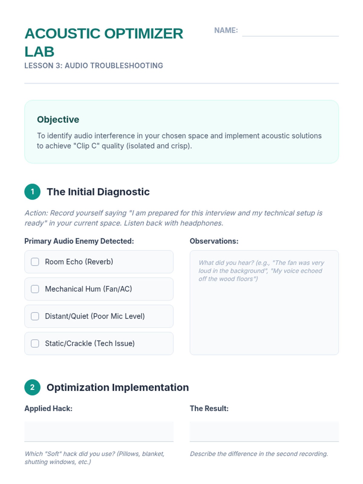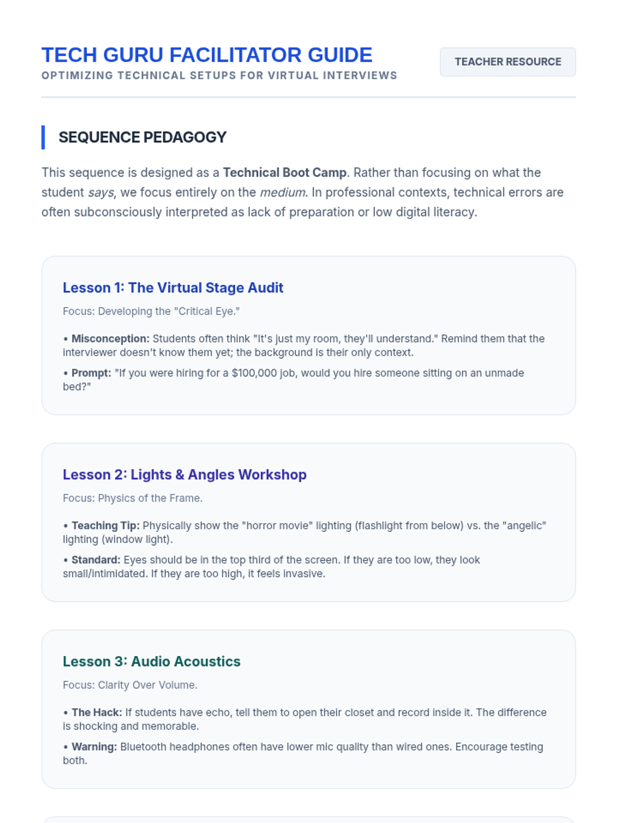 A 5-lesson sequence for 10th-grade students on optimizing their physical and technical environment for virtual interviews, covering lighting, camera angles, audio quality, and platform settings.