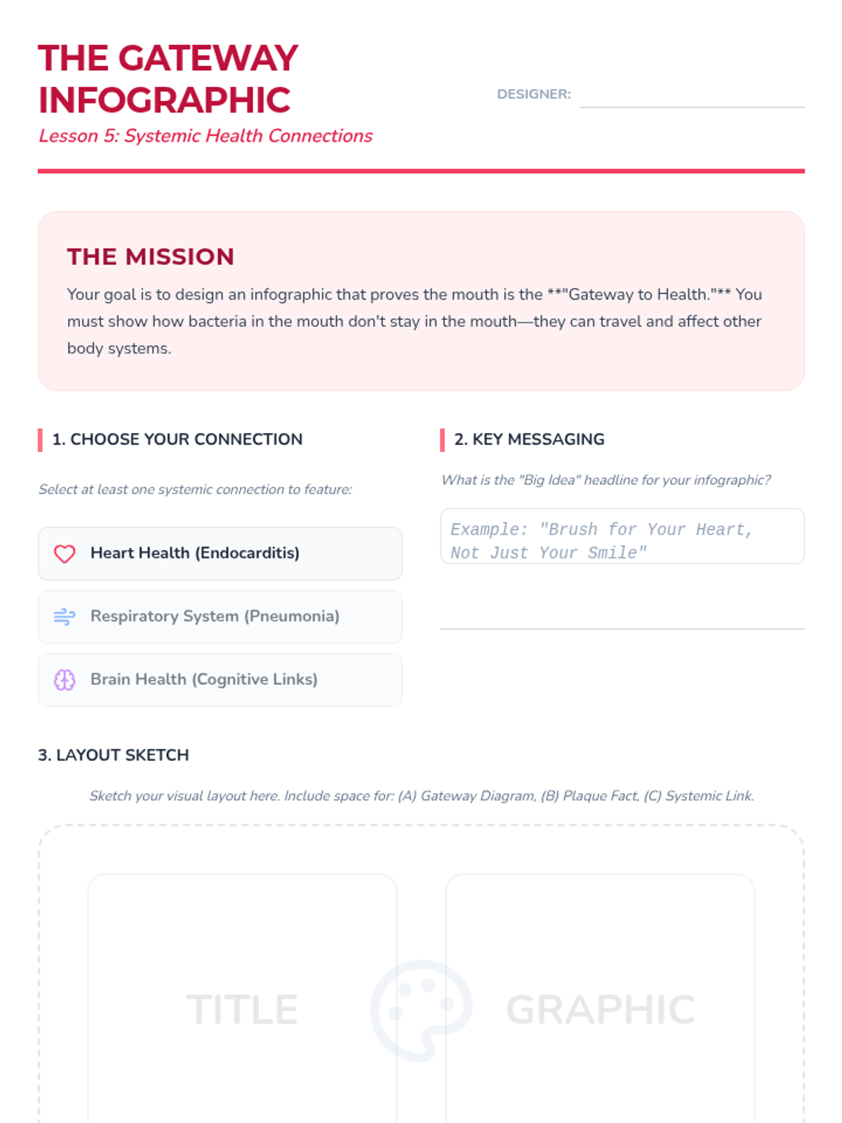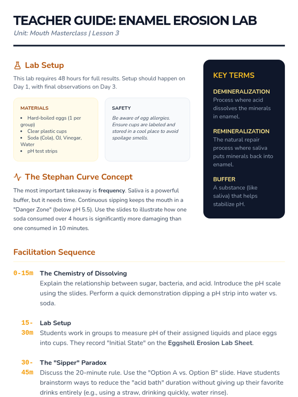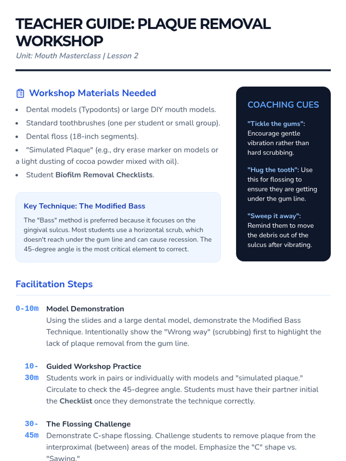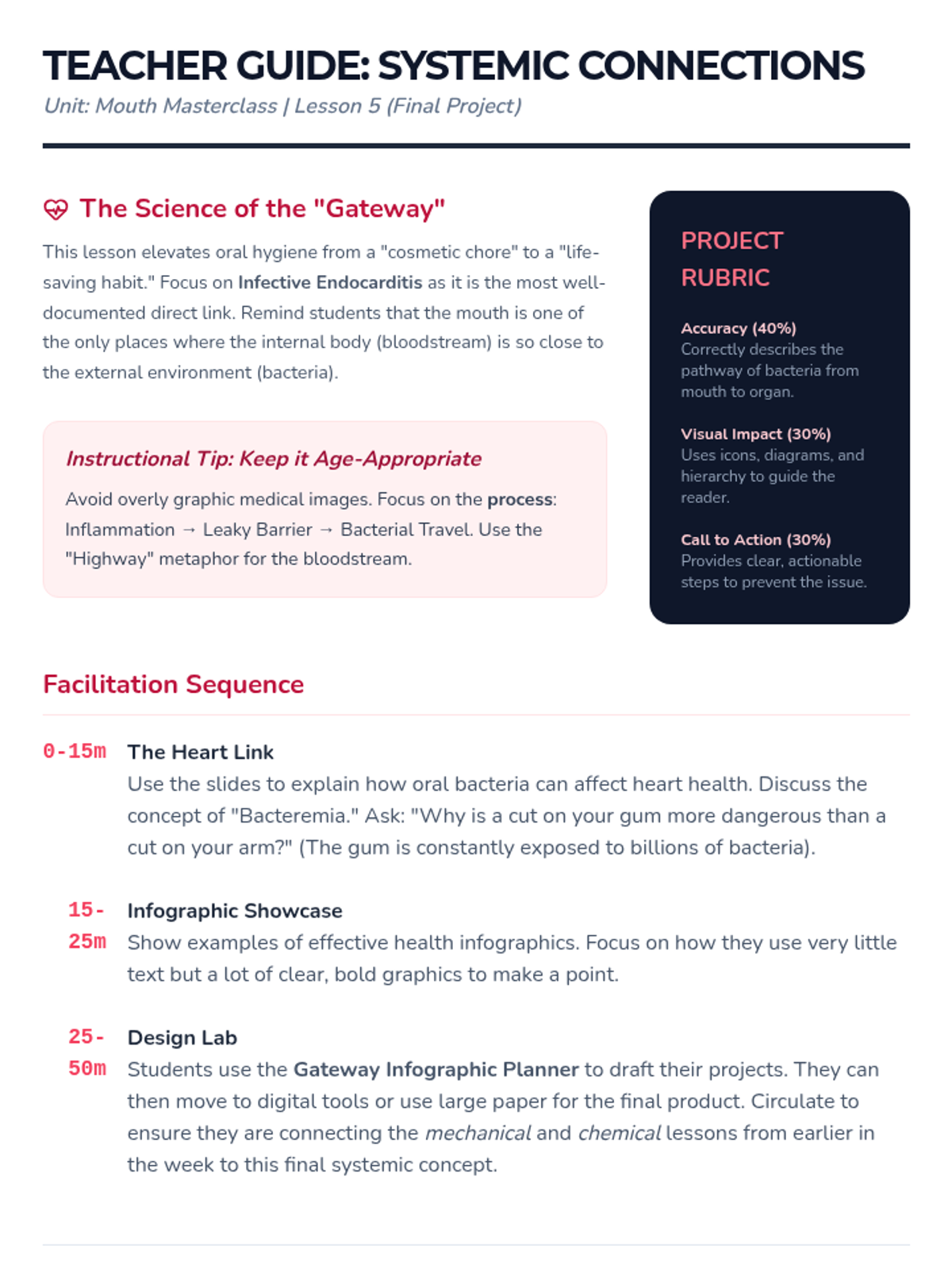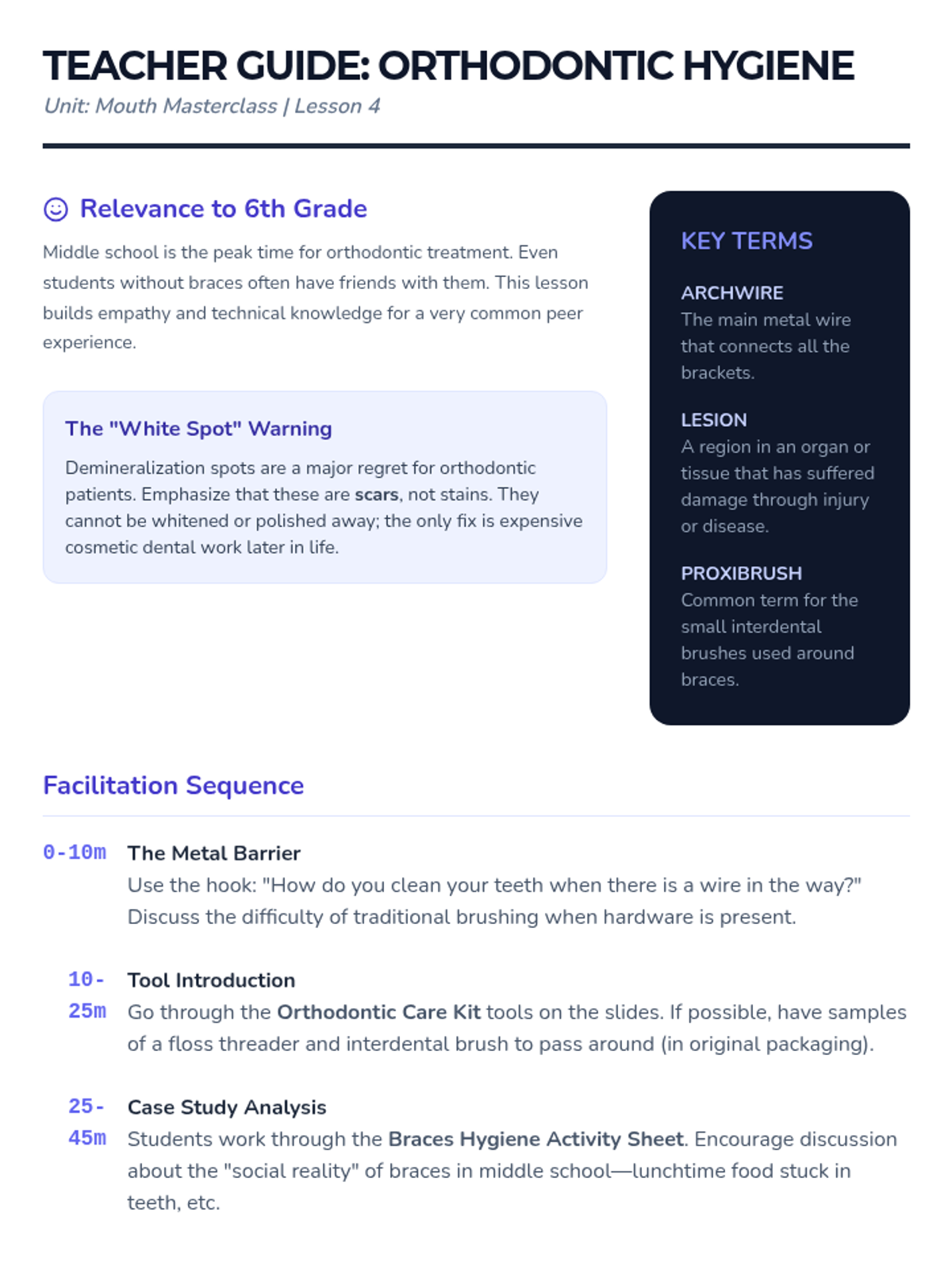 A comprehensive 6th-grade health sequence exploring oral anatomy, plaque removal techniques, the chemistry of enamel erosion, orthodontic care, and the systemic links between oral health and overall body wellness.