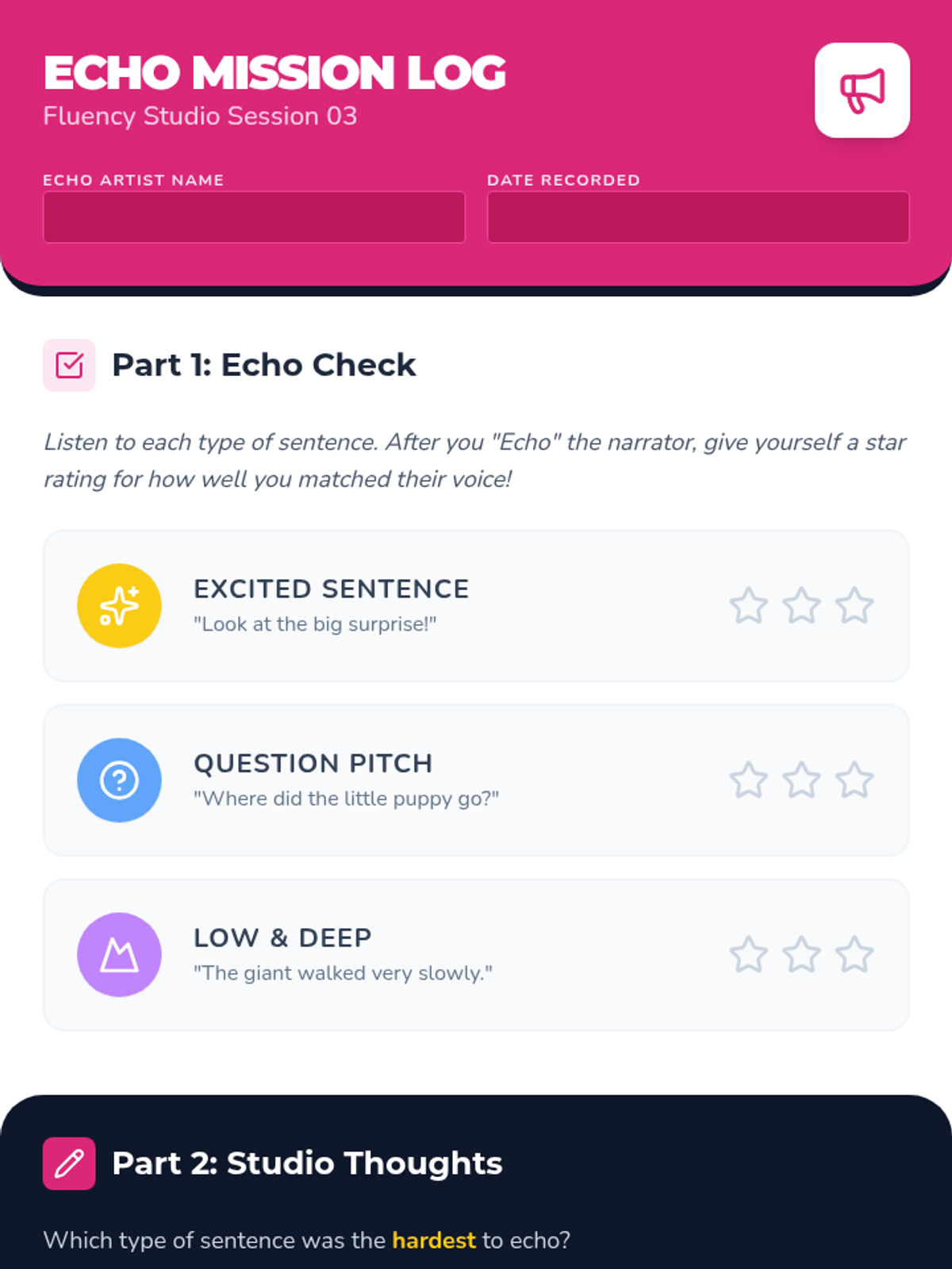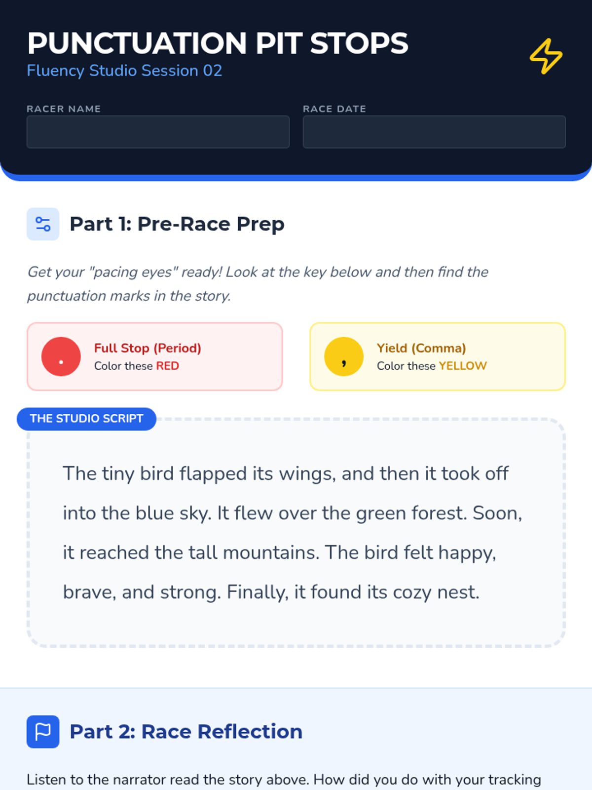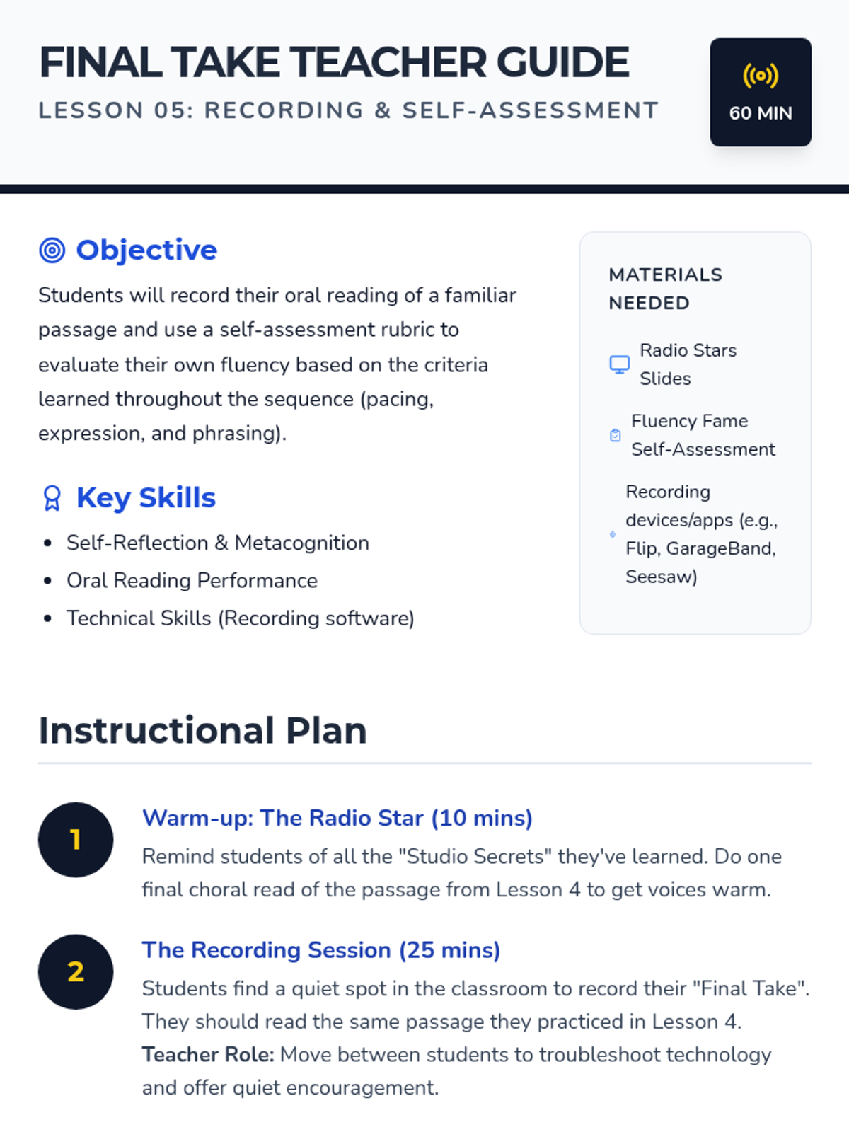 A 2nd Grade ELA sequence focused on developing oral reading fluency through audio models, mimicry, and self-assessment in a 'recording studio' themed environment.