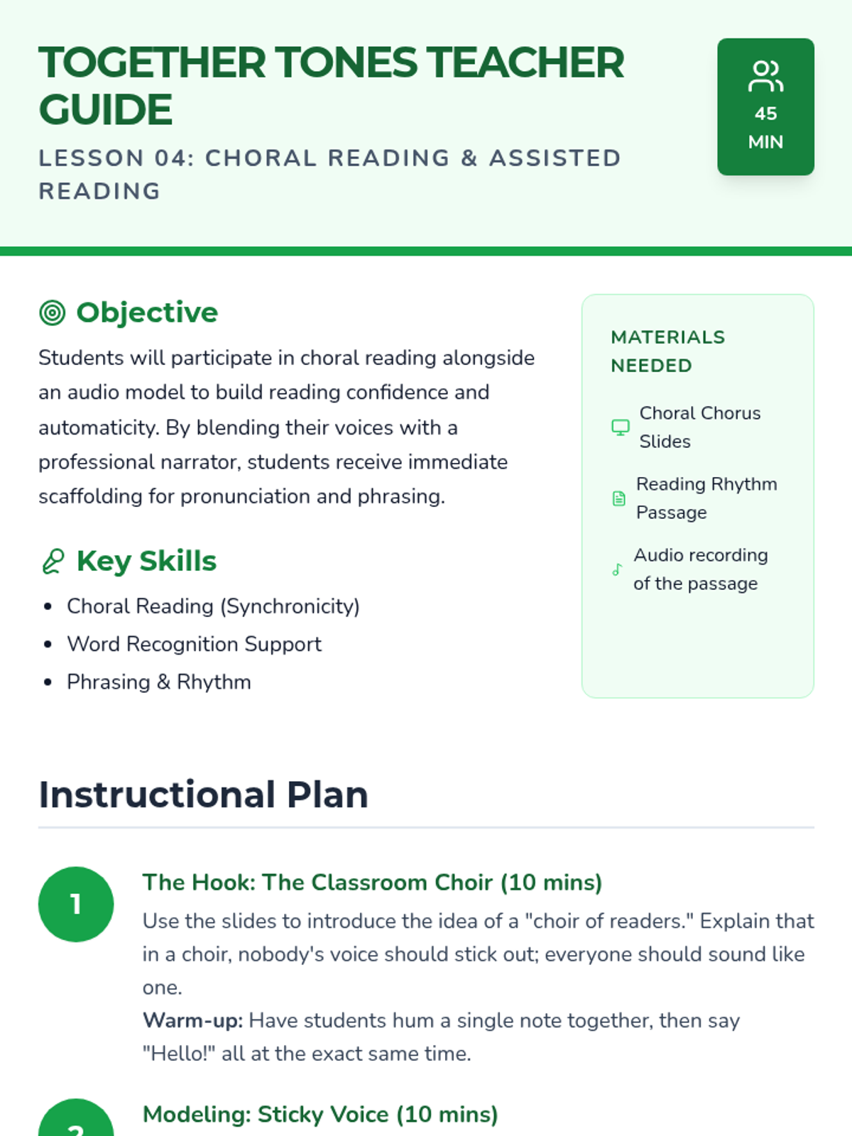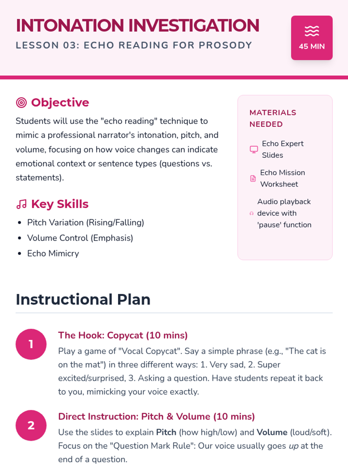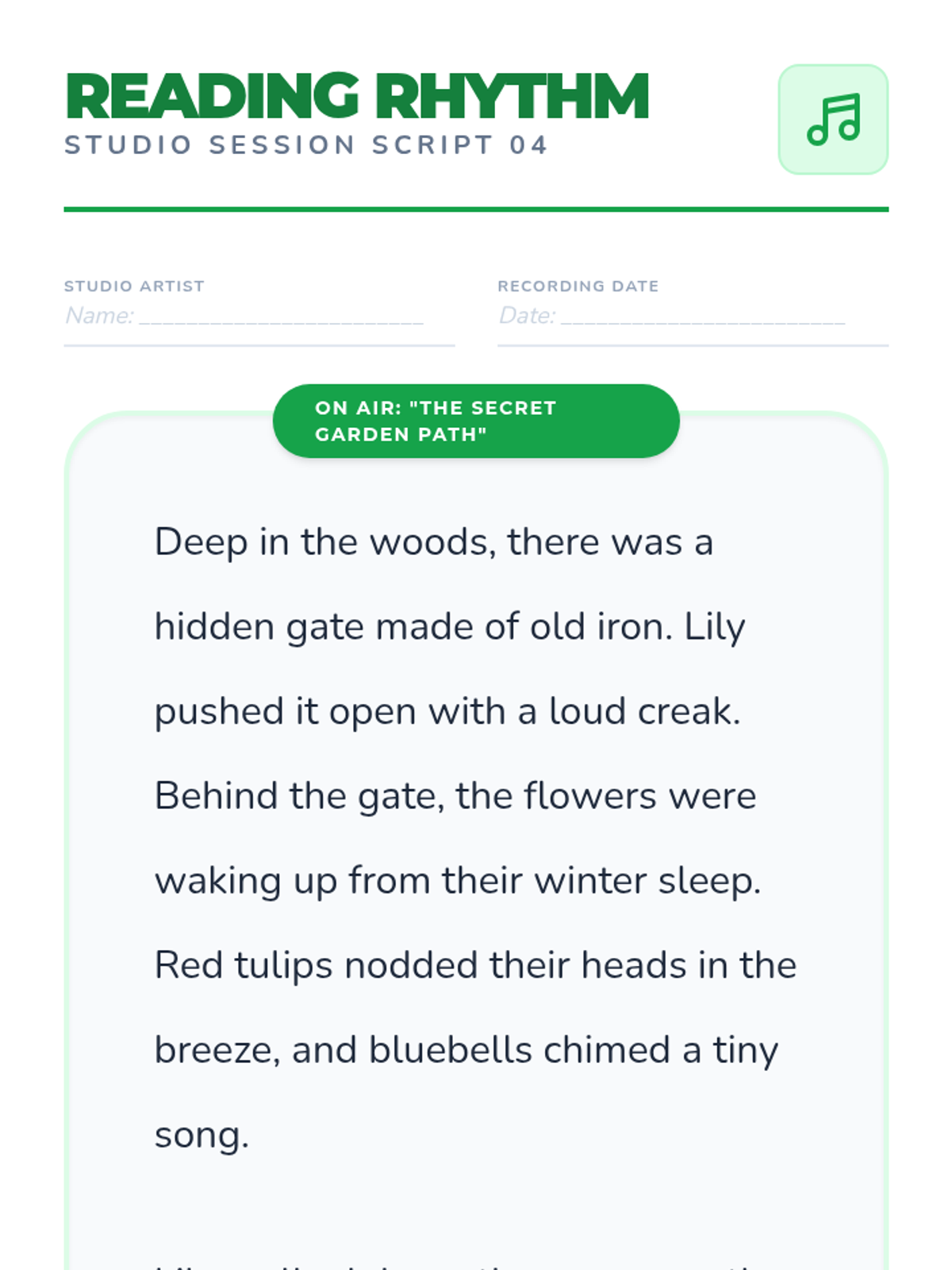 A 2nd Grade ELA sequence focused on developing oral reading fluency through audio models, mimicry, and self-assessment in a 'recording studio' themed environment.