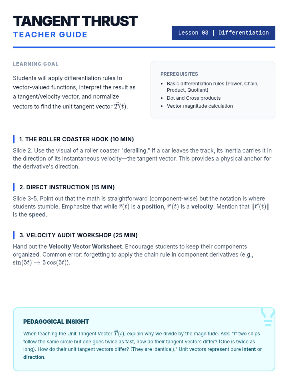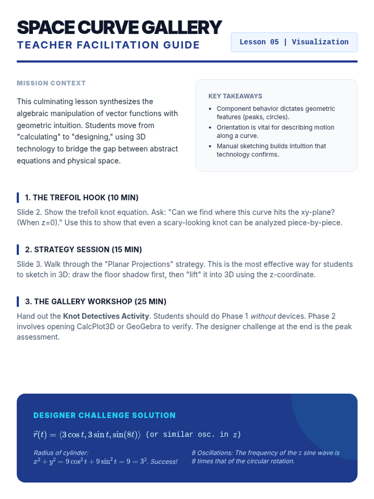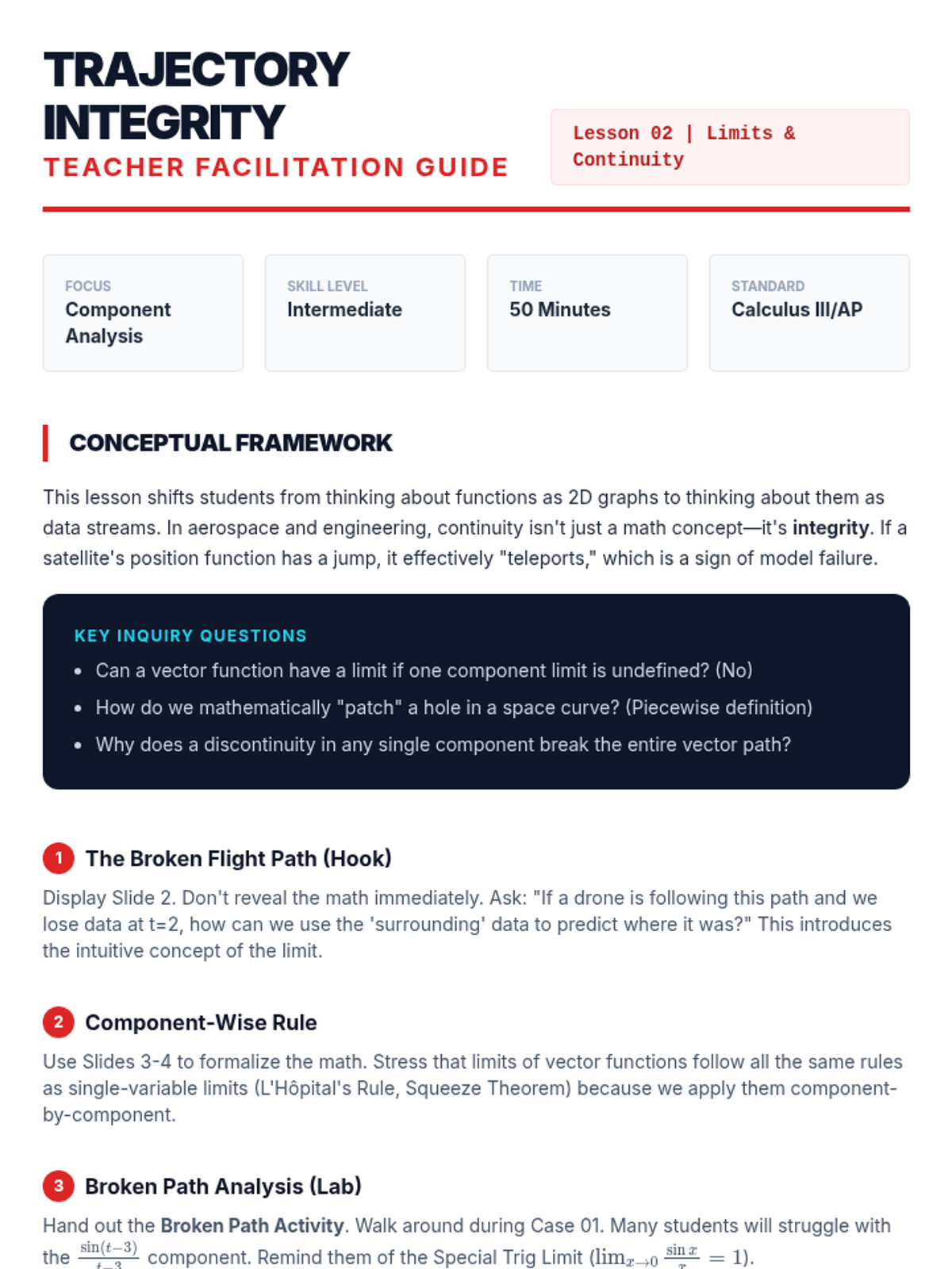 This foundational sequence introduces 12th-grade calculus students to vector-valued functions, bridging parametric equations with 3D vector analysis through the lens of aerospace navigation. Students explore domains, limits, continuity, differentiation, and integration to model and visualize complex space curves.