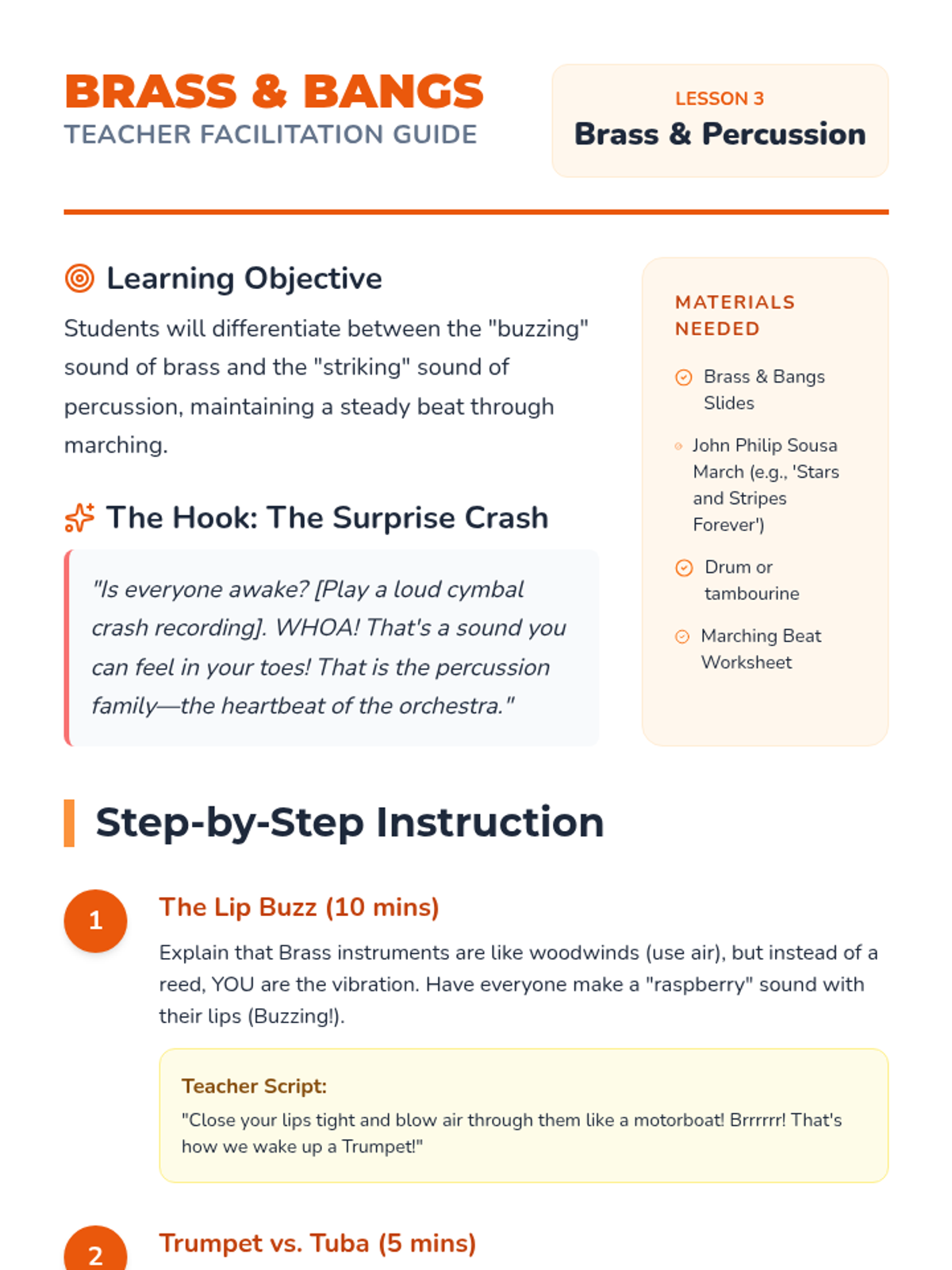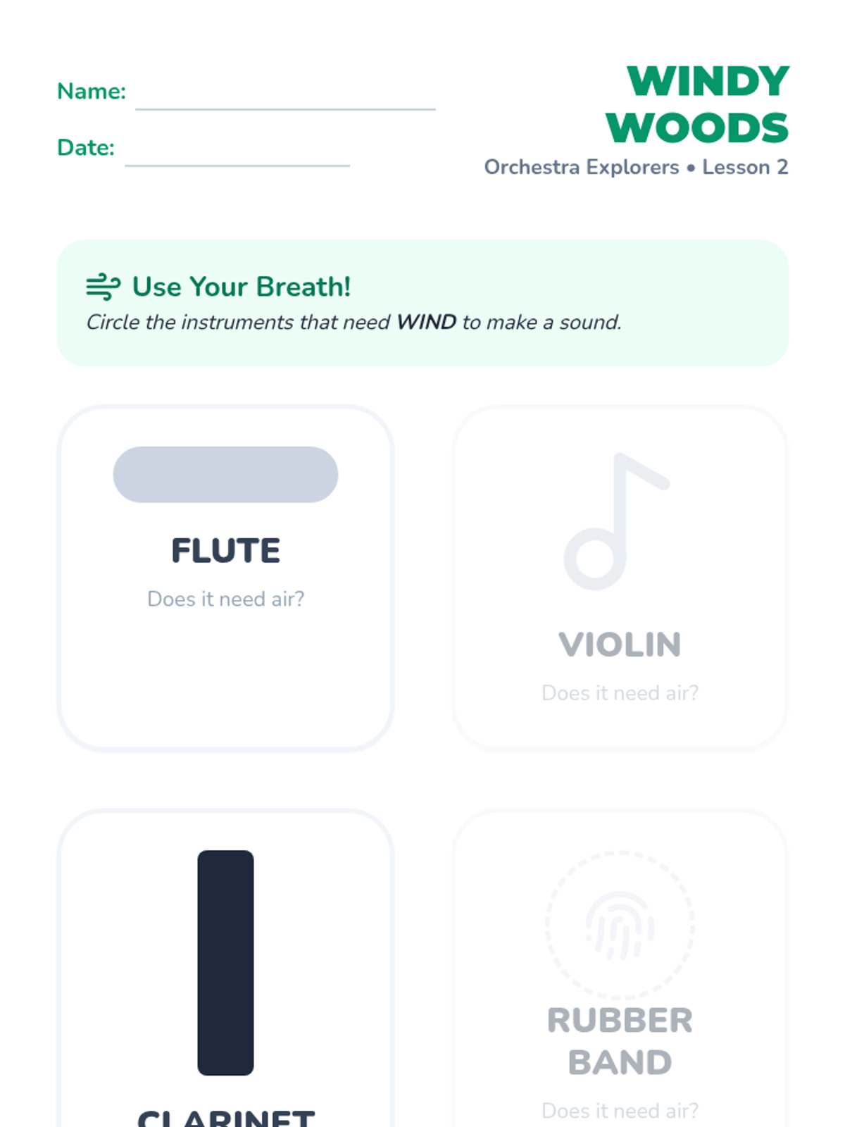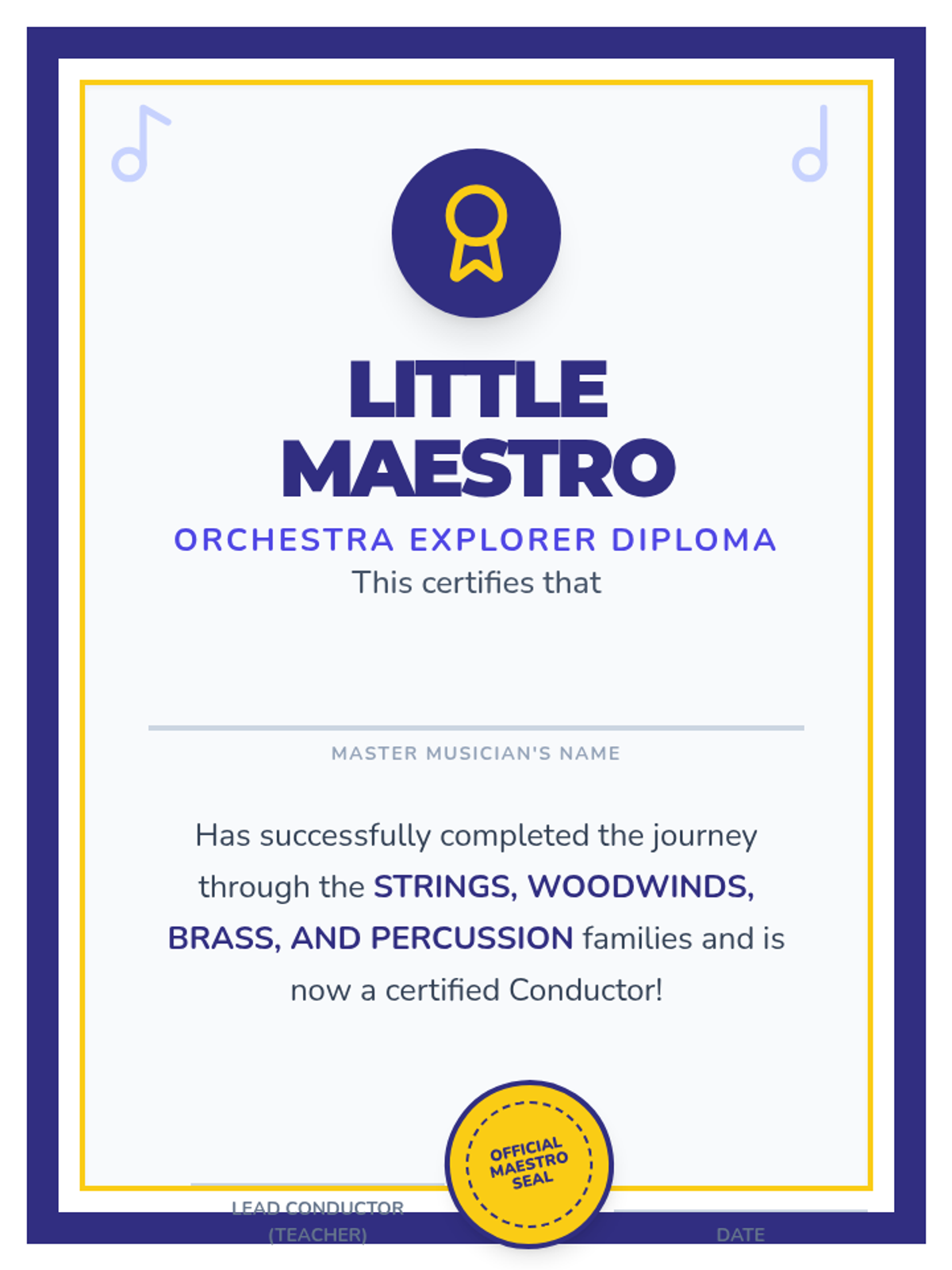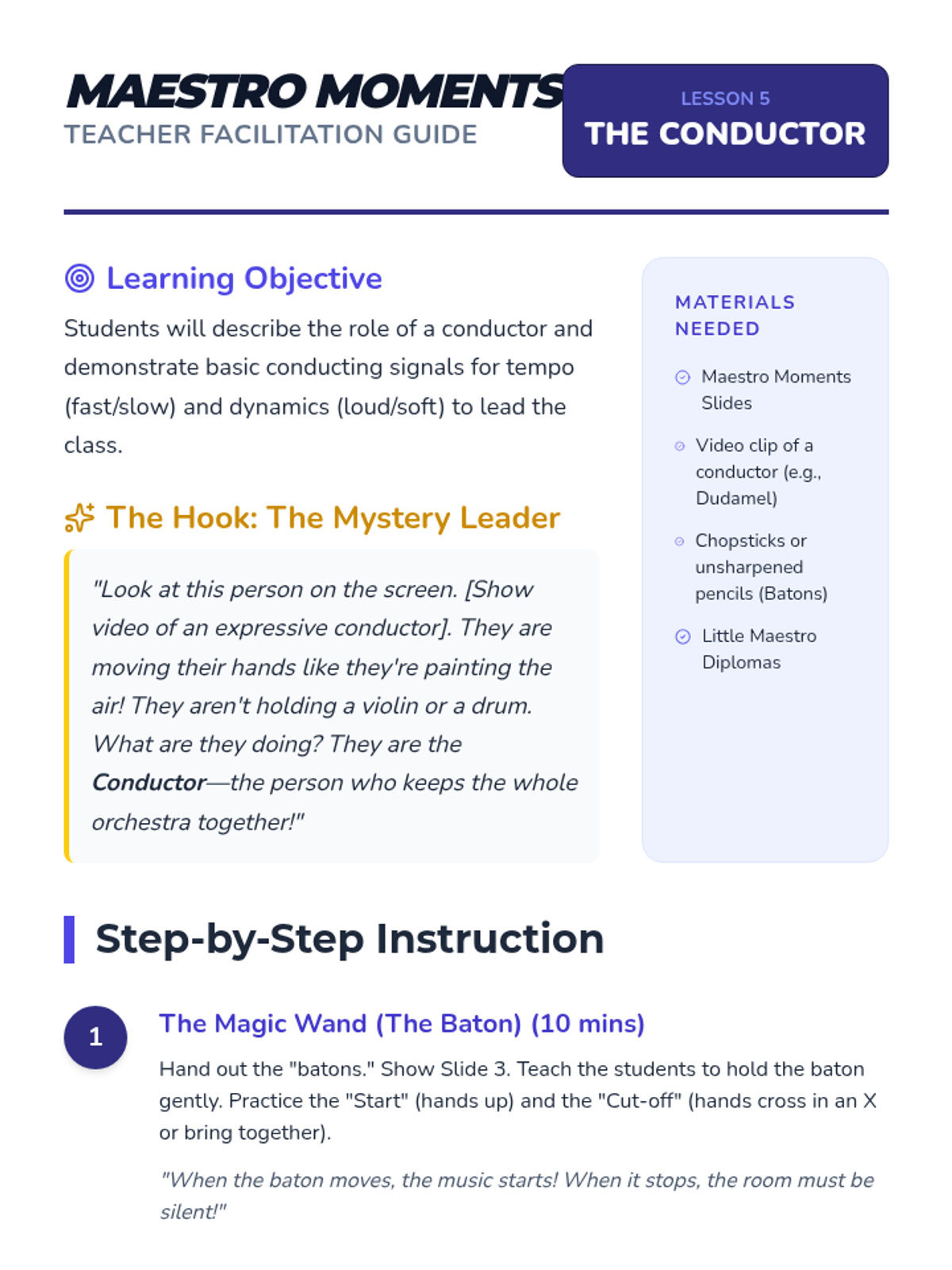 A musical journey for Kindergarteners to discover the four families of the orchestra, explore dynamics, and experience the role of the conductor through active listening and movement.