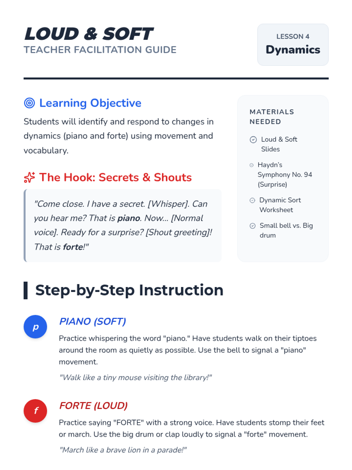 A Kindergarten music sequence focused on stage presence, performance routine, and building confidence through role-play and preparation. Students learn the full cycle of a performance, from walking on stage to the final bow.