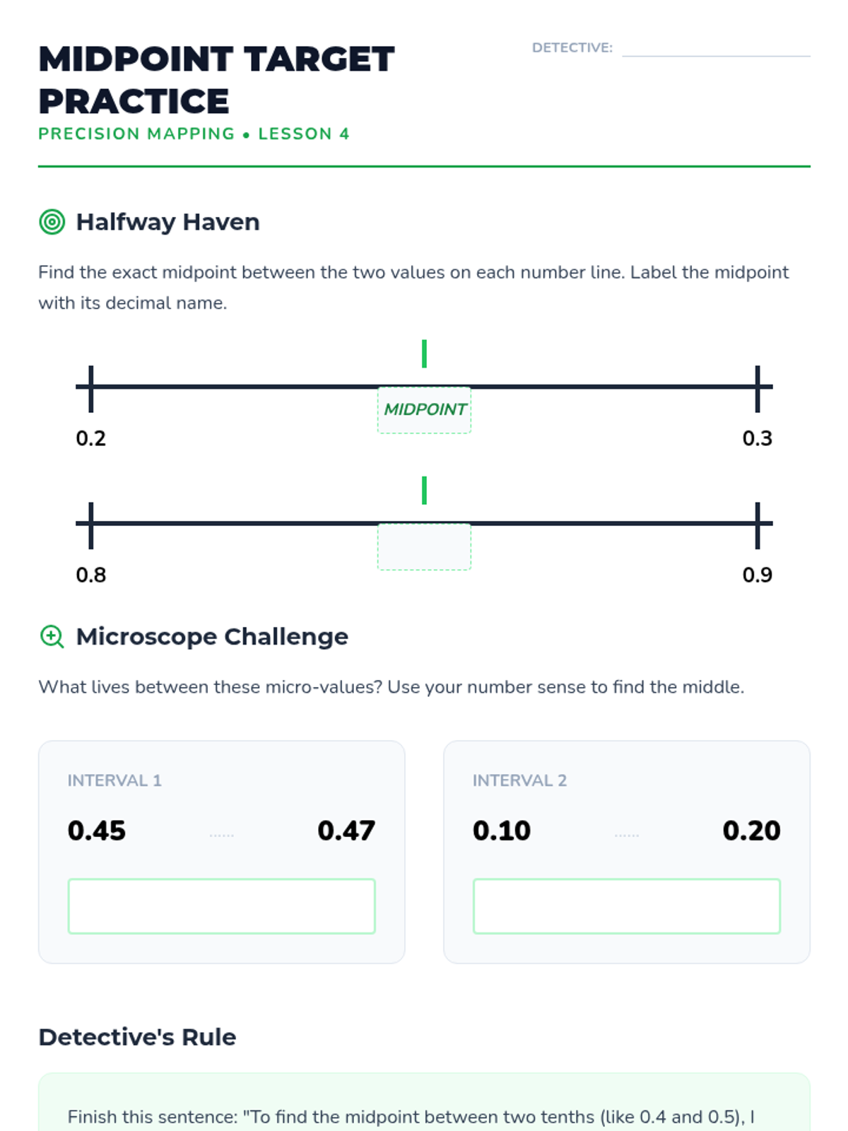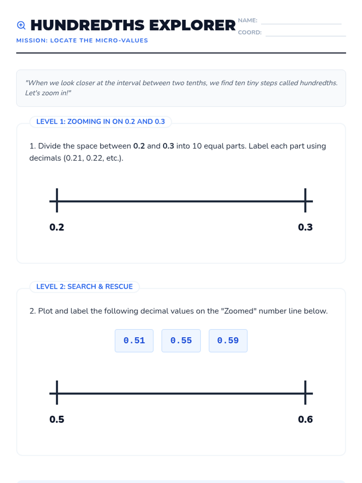 A comprehensive 6th-grade math unit that uses the number line as a primary tool for understanding the magnitude, ordering, and comparison of decimals. Students transition from visualizing tenths to 'zooming in' on hundredths and calculating midpoints.