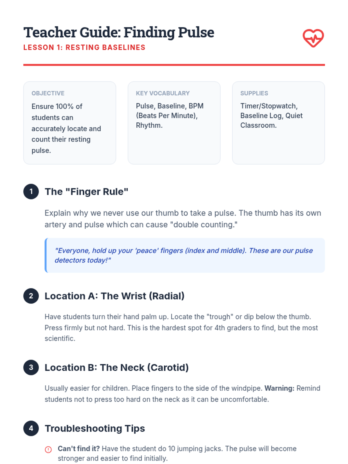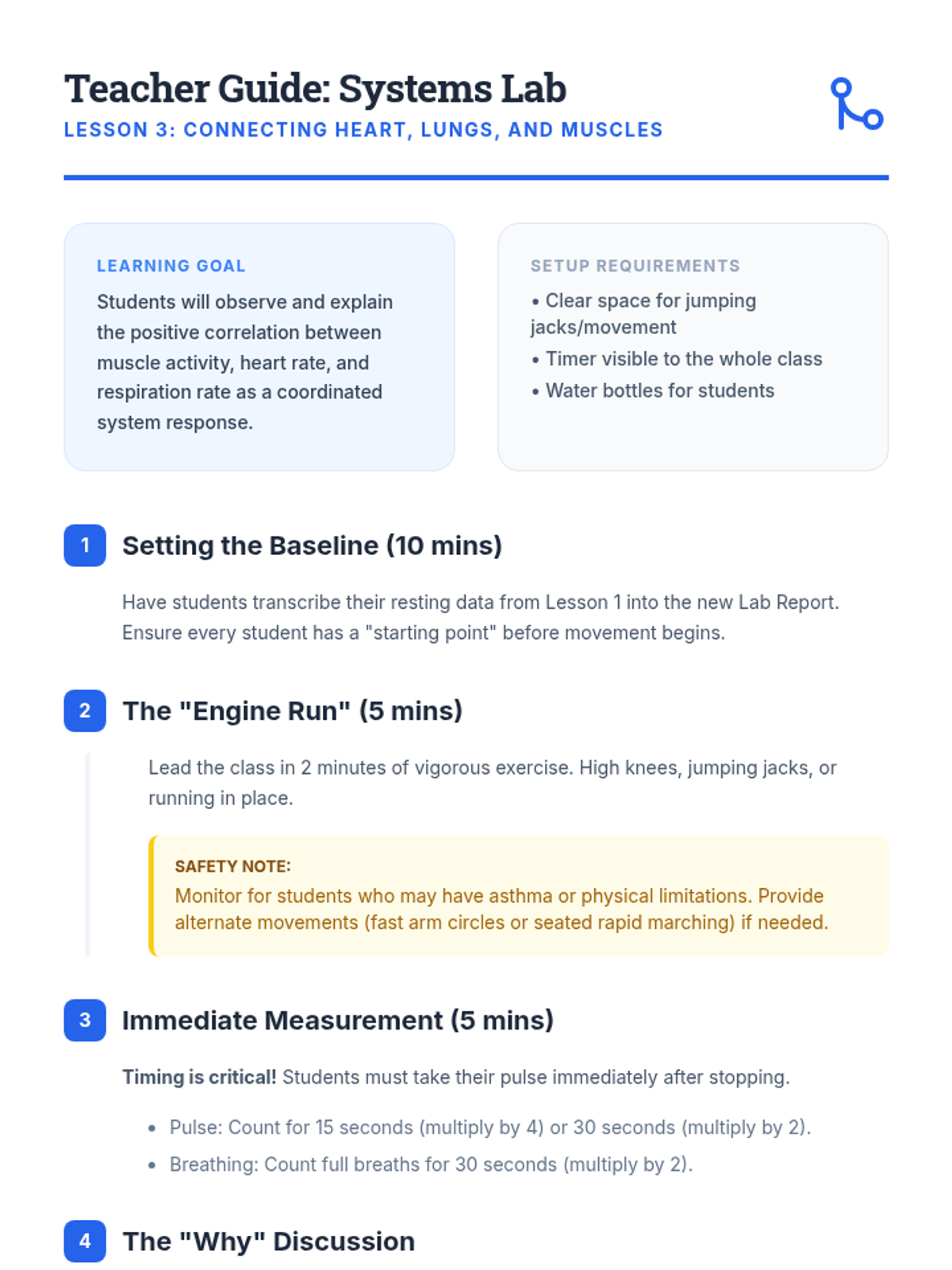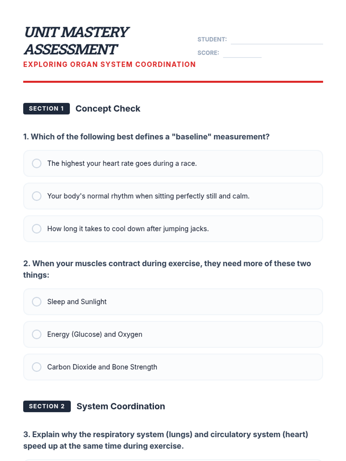 A 5-lesson unit for 4th graders exploring how the circulatory, respiratory, and muscular systems coordinate during exercise to maintain homeostasis. Students progress from measuring resting baselines to analyzing recovery times and creating systems models.