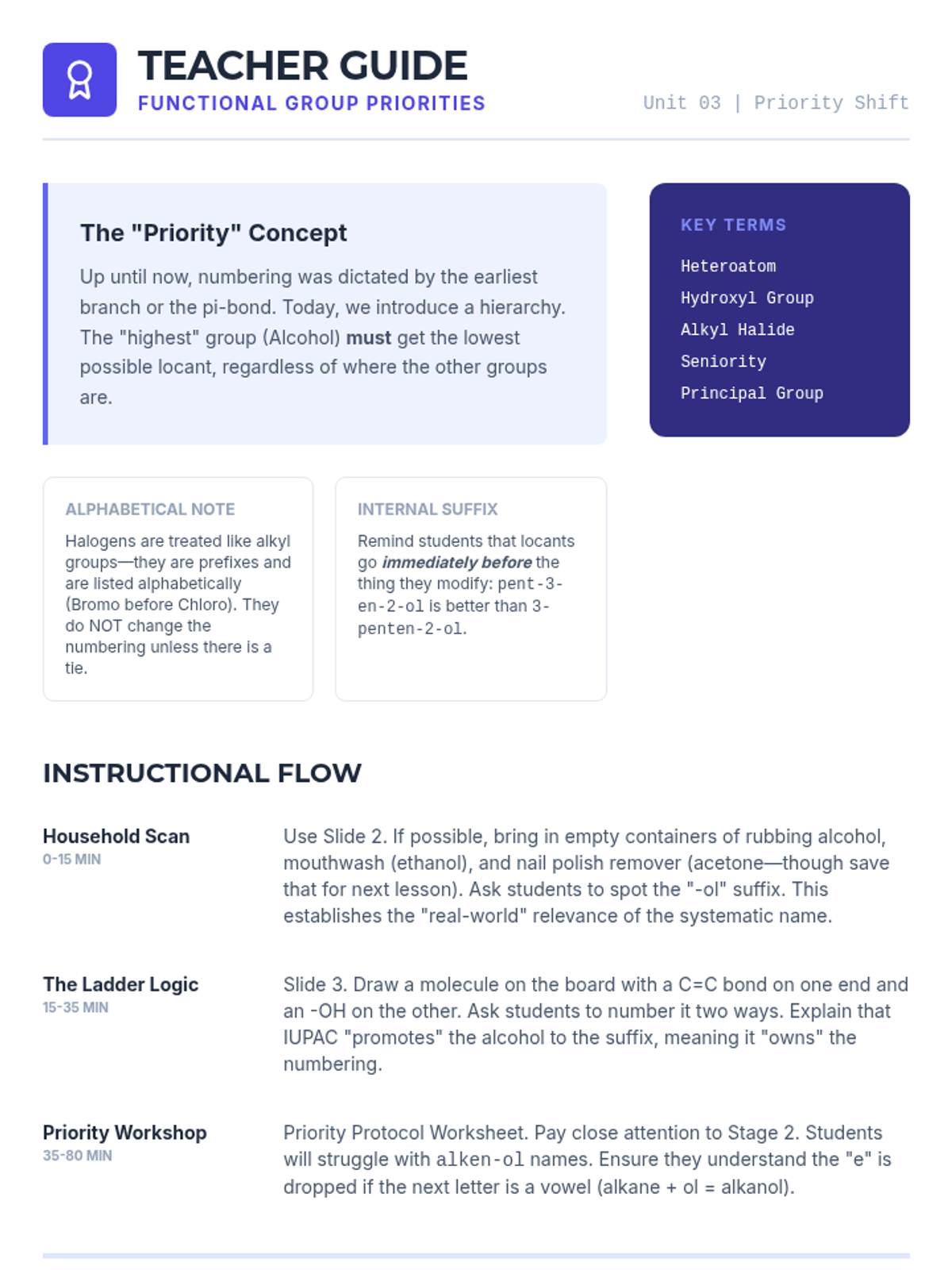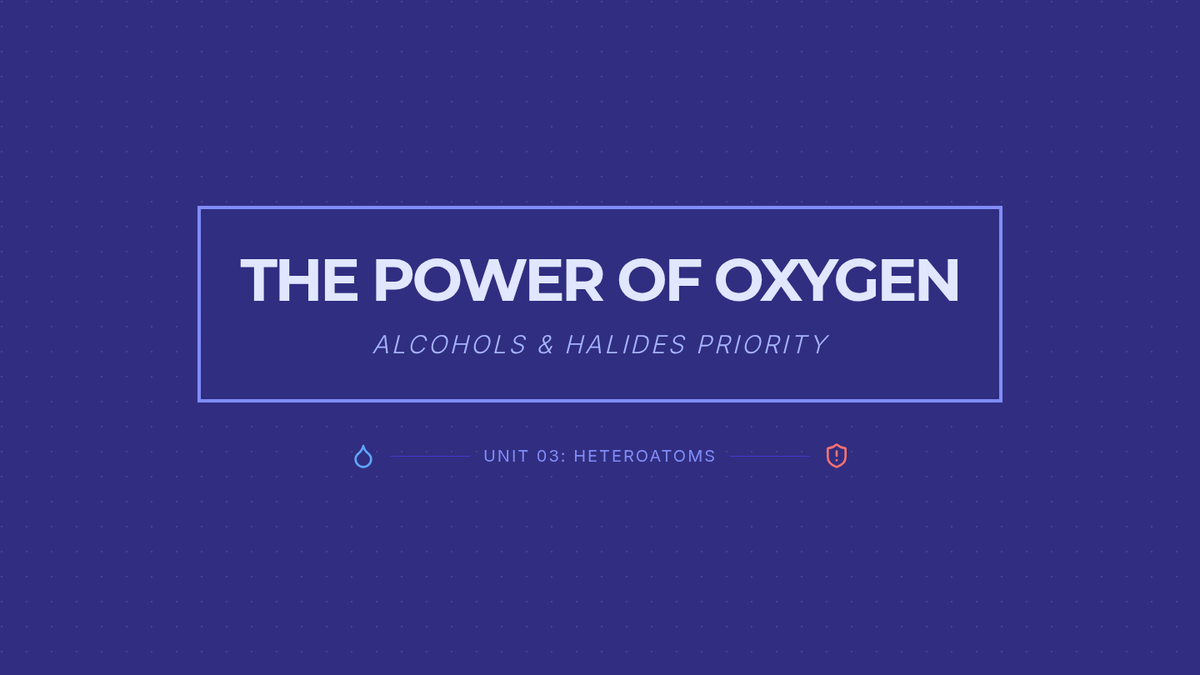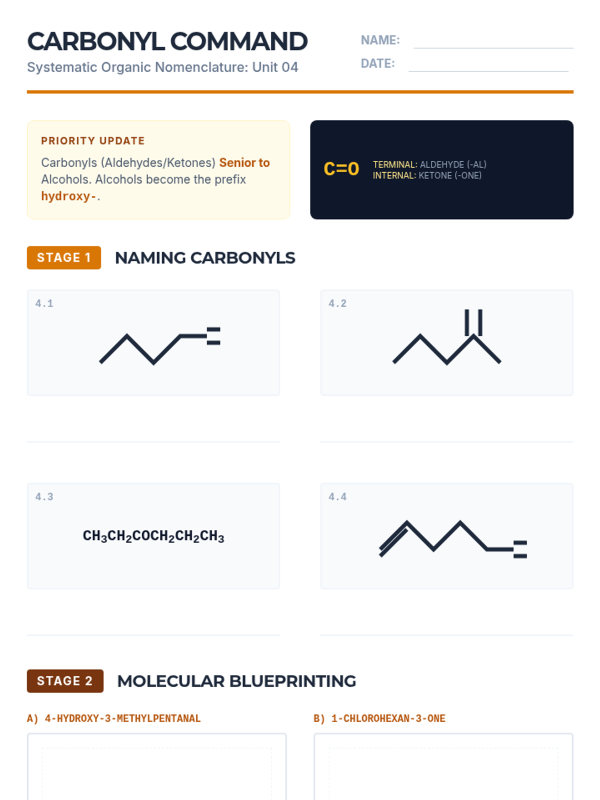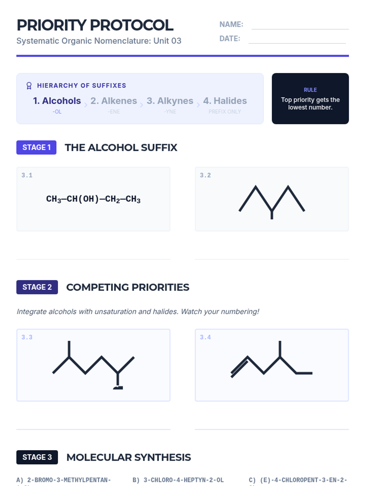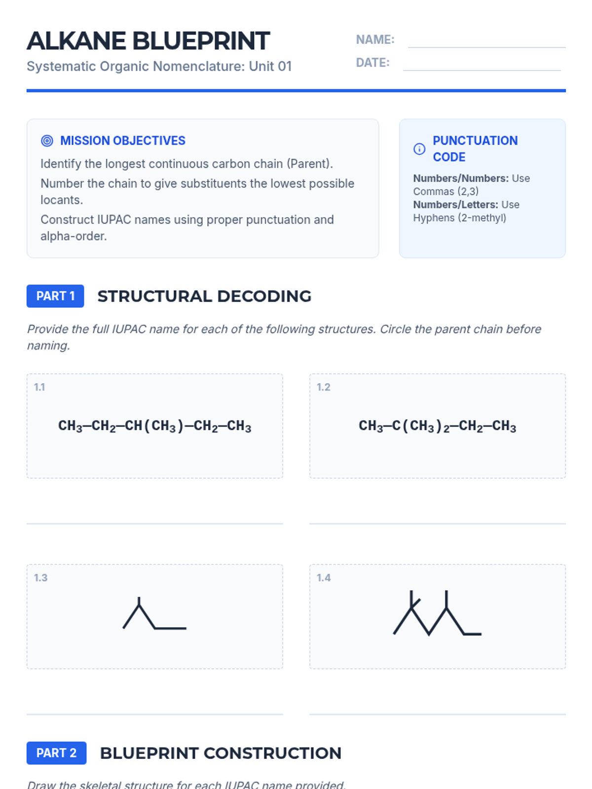 A comprehensive 12th-grade chemistry unit on IUPAC nomenclature, covering alkanes, cycloalkanes, alkenes, alkynes, and major oxygen-containing functional groups through a systematic 'Molecular Blueprint' approach.
