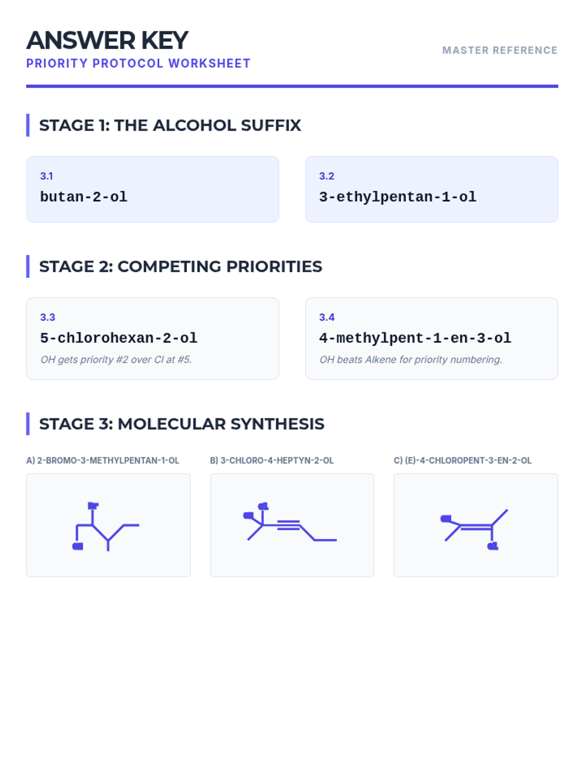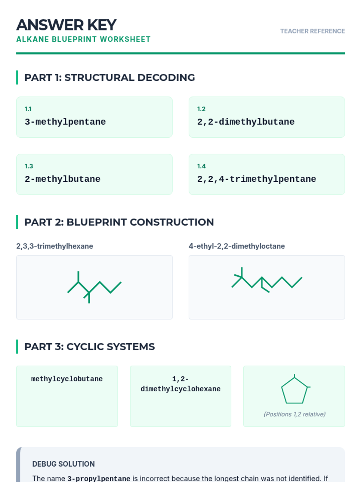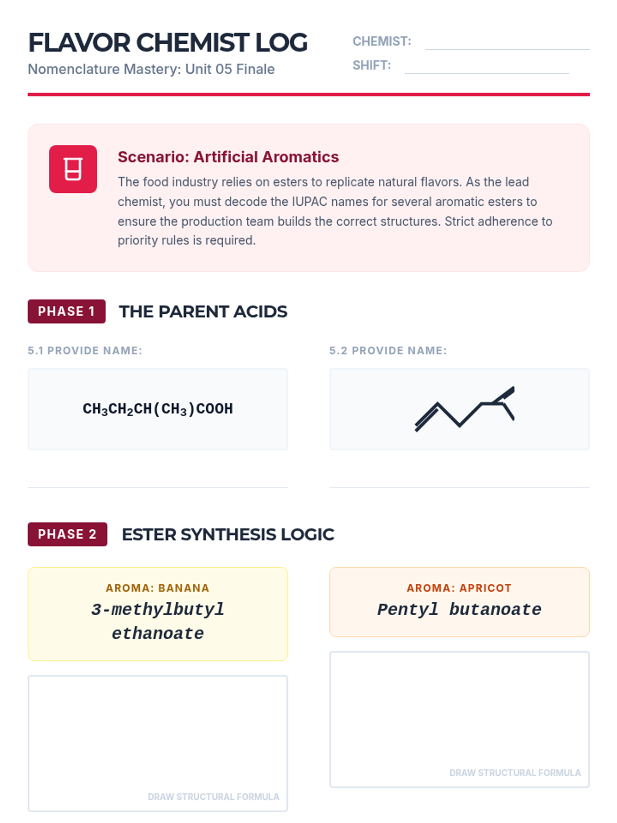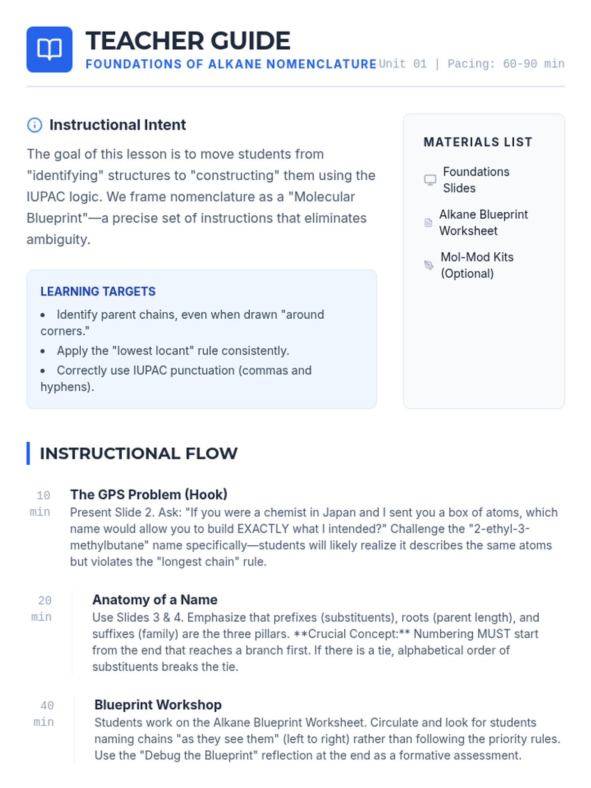 A comprehensive 12th-grade chemistry unit on IUPAC nomenclature, covering alkanes, cycloalkanes, alkenes, alkynes, and major oxygen-containing functional groups through a systematic 'Molecular Blueprint' approach.