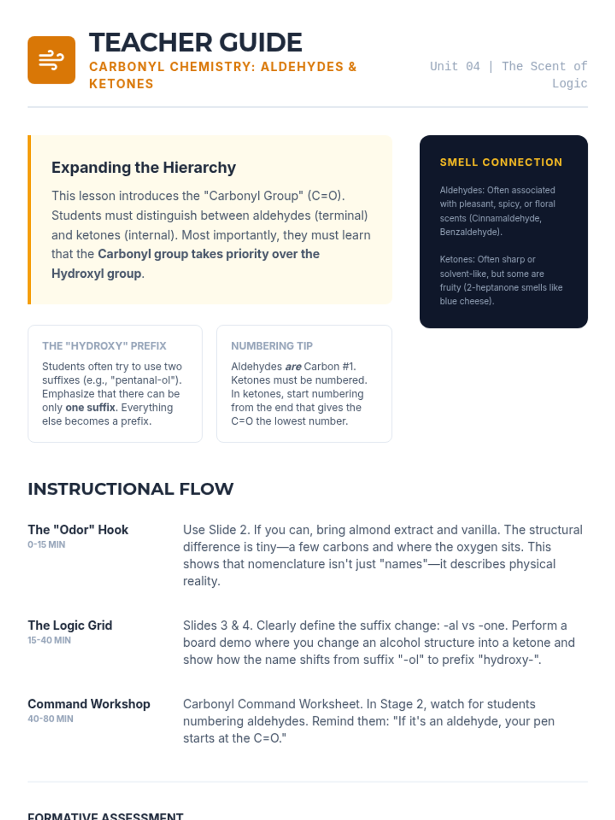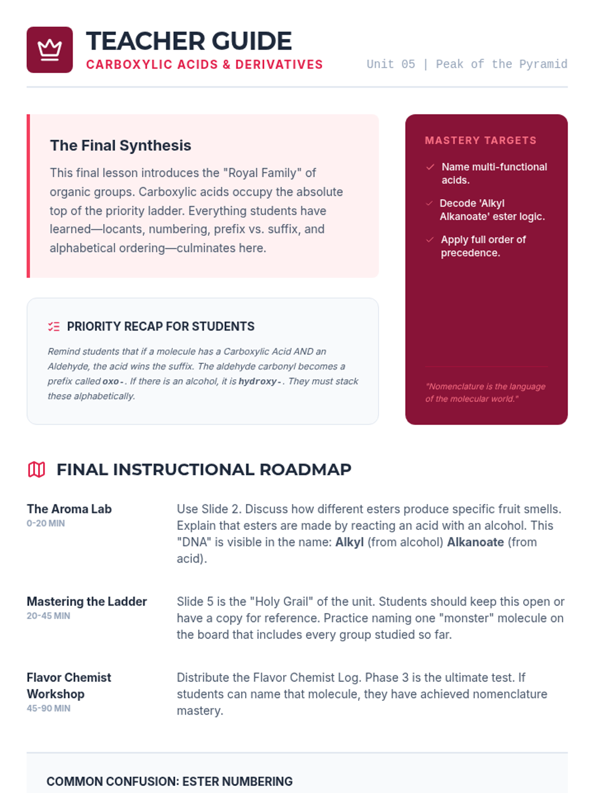 A comprehensive review of organic chemistry and biochemistry topics including carbohydrates, carboxylic acids, esters, amines, amides, and proteins. This sequence prepares students for a final assessment through structured notes, visual organizers, and a full-length mock exam.