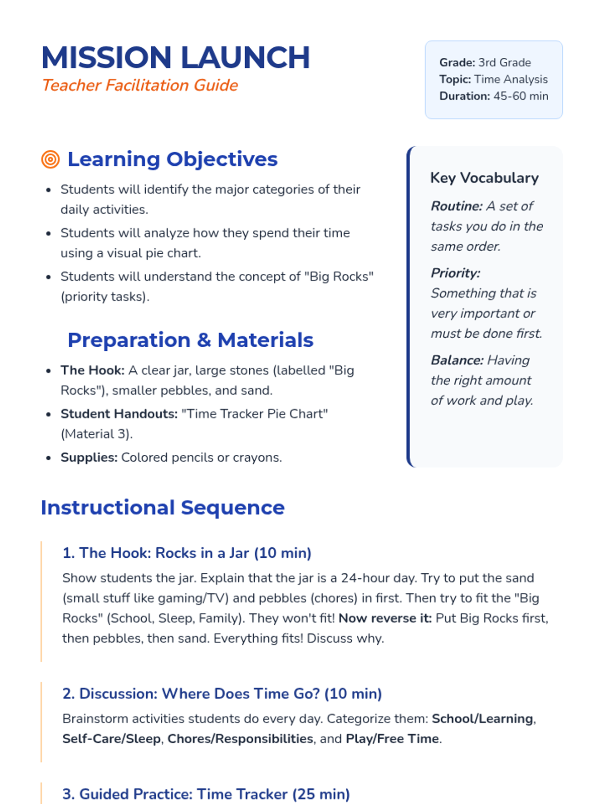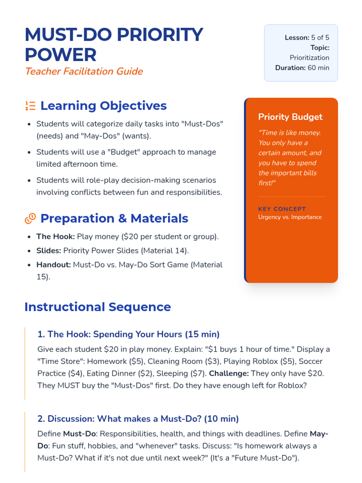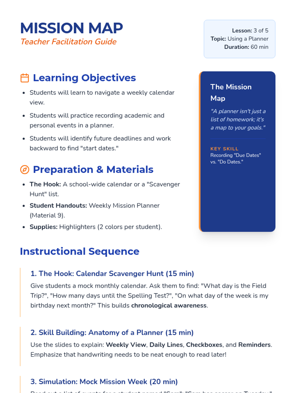 A 5-lesson sequence for 3rd-grade students focused on executive function, time management, and organizational skills. Students learn to track time, design workspaces, use planners, break down large tasks, and prioritize responsibilities.