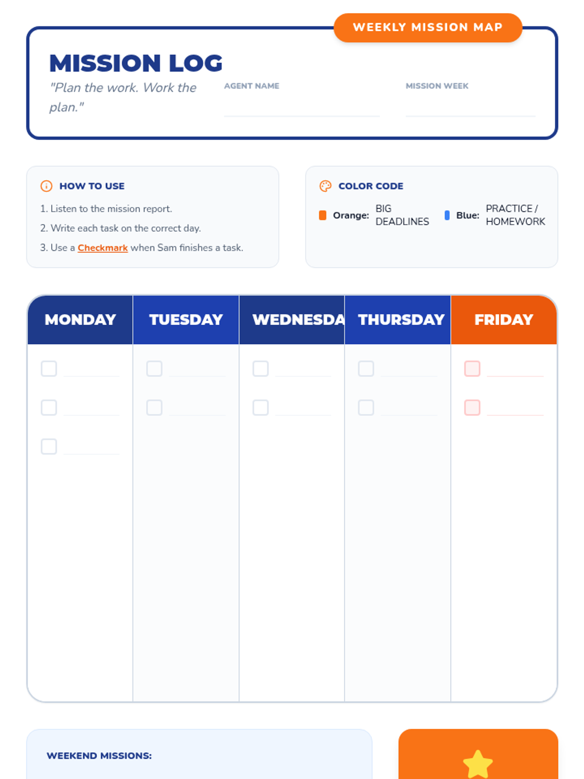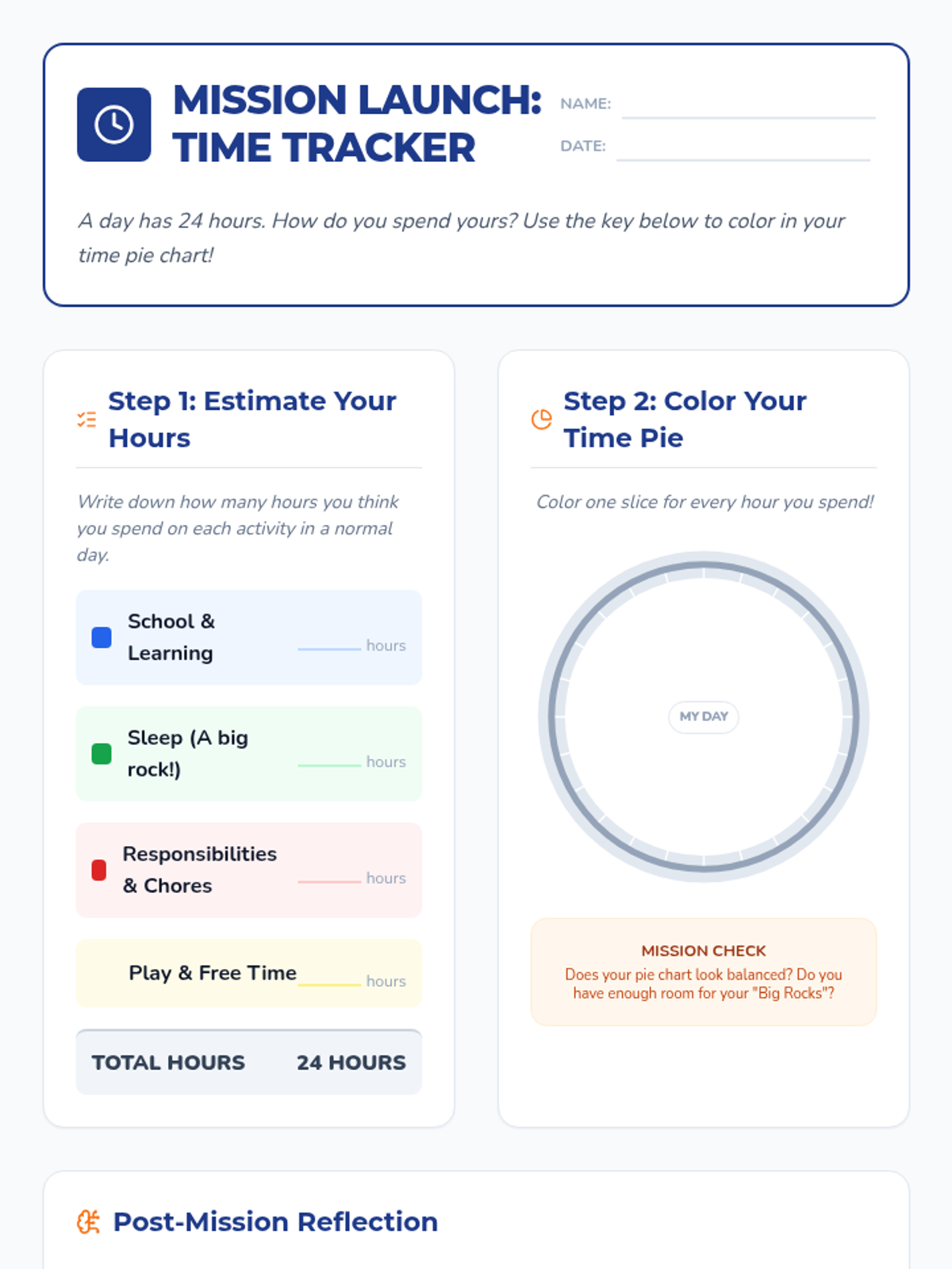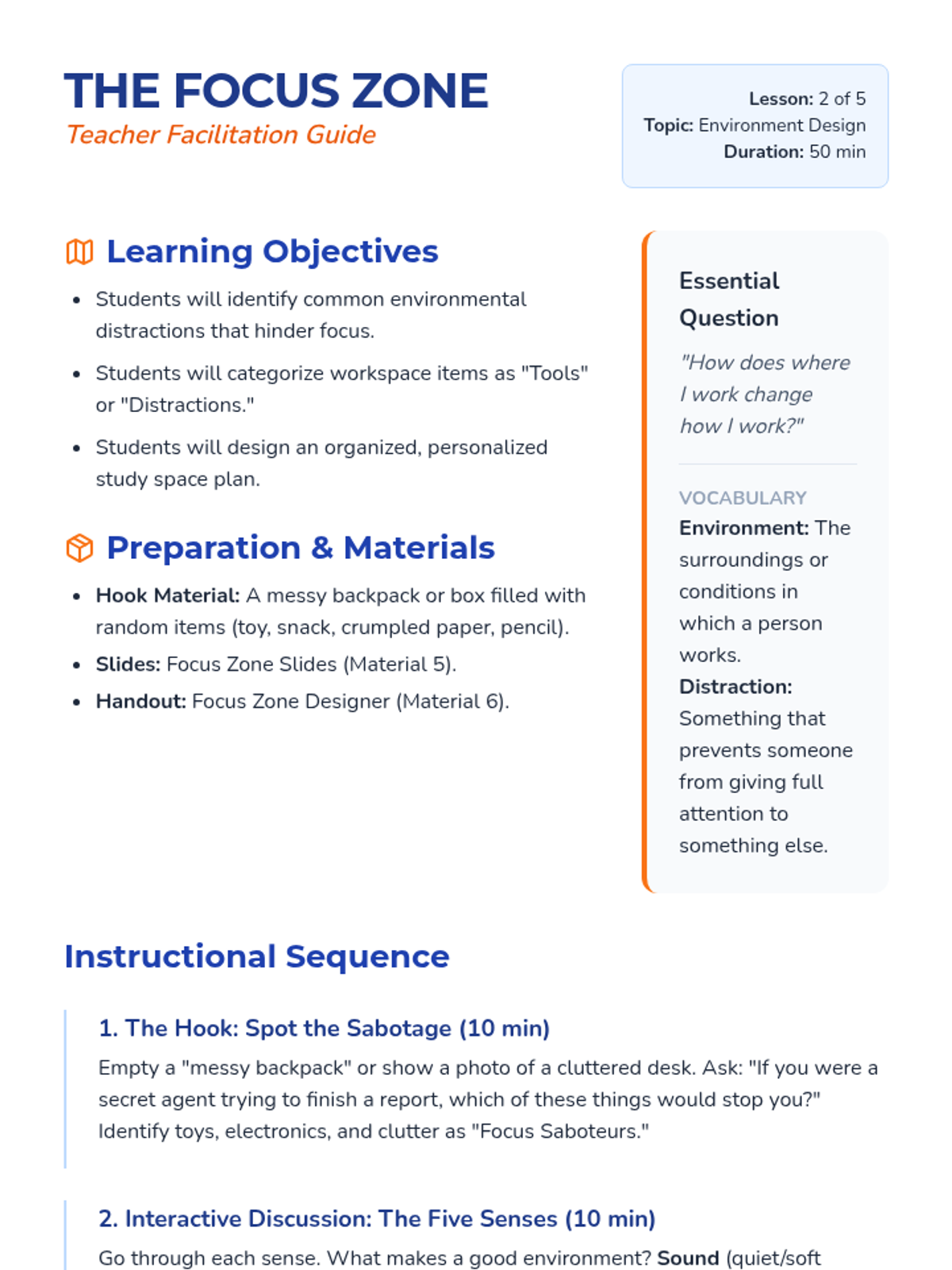 A 5-lesson sequence for 3rd-grade students focused on executive function, time management, and organizational skills. Students learn to track time, design workspaces, use planners, break down large tasks, and prioritize responsibilities.