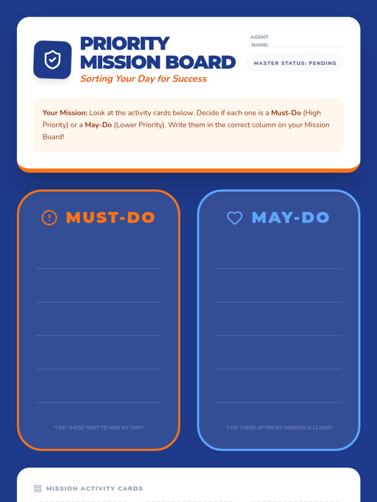 A comprehensive instructional unit focused on the foundational skill of following a multi-step task to completion. This unit provides two distinct tracks: a secret agent-themed track for older students (7-8) and a Danny Go! themed track for Pre-K students, ensuring developmental appropriateness while maintaining high engagement.