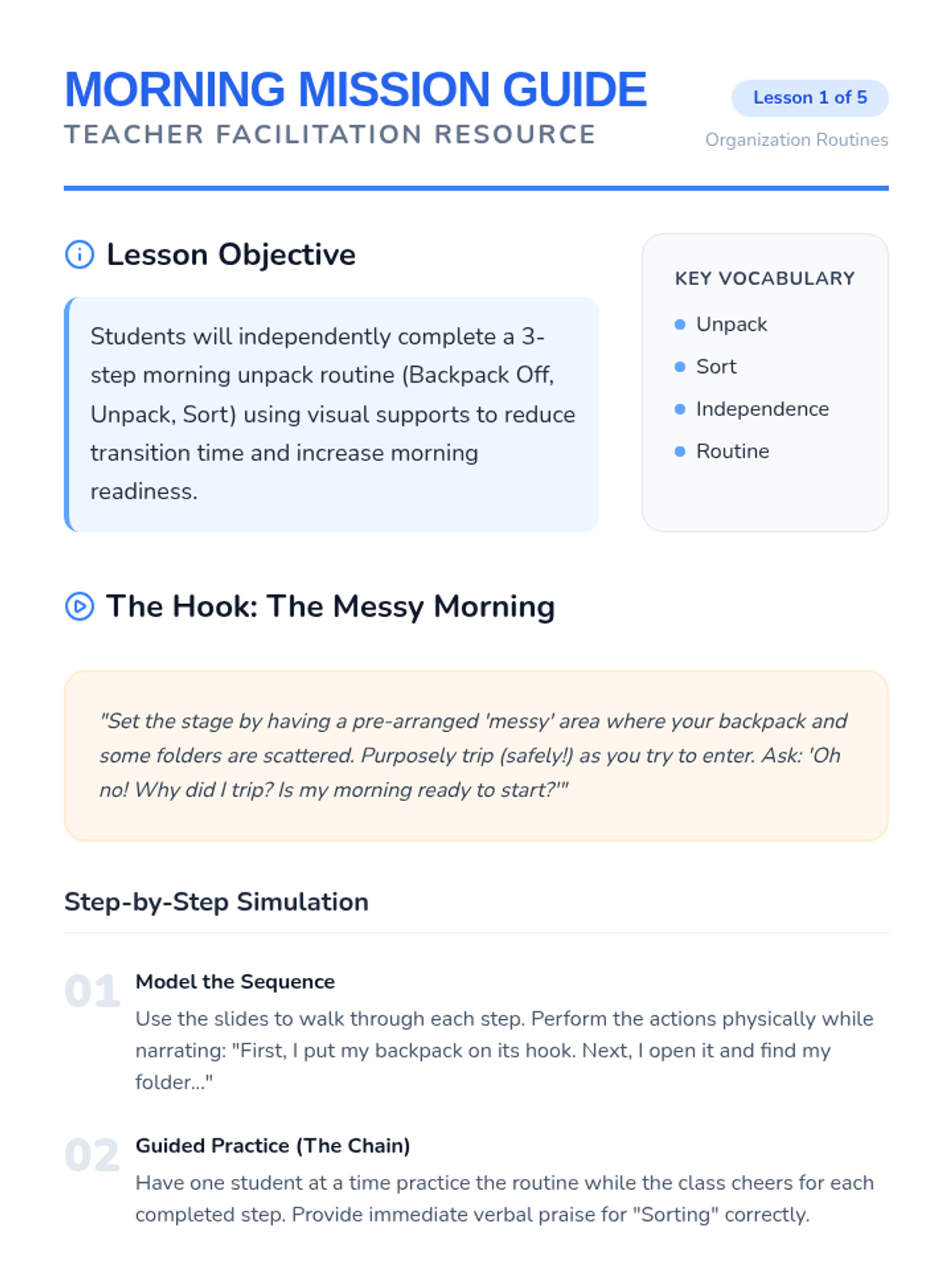 A 5-lesson sequence for Kindergarten Special Education students focusing on physical organization and transition routines. Students learn to manage their belongings through visual schedules, 'stop and stash' techniques, and 'owl eyes' scanning to increase independence and reduce transition time.