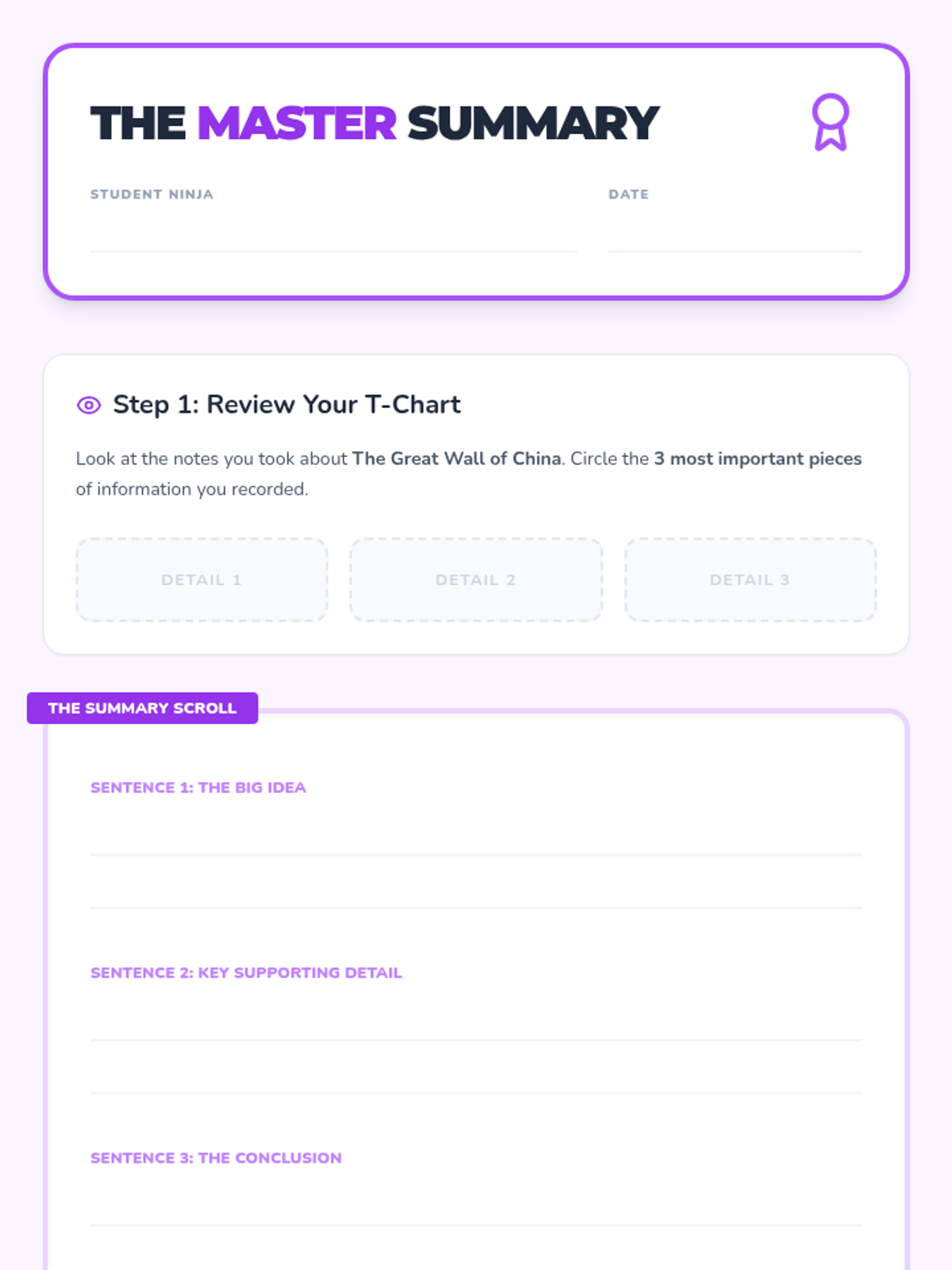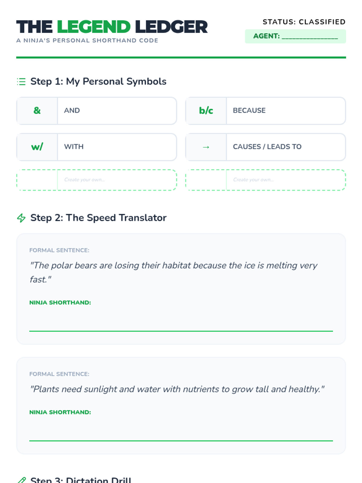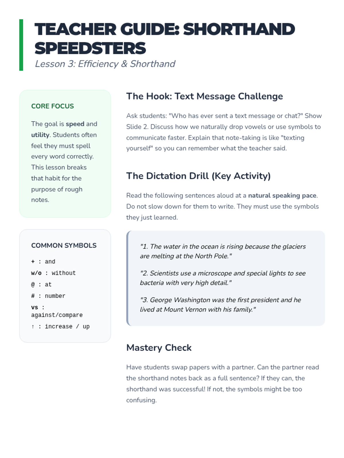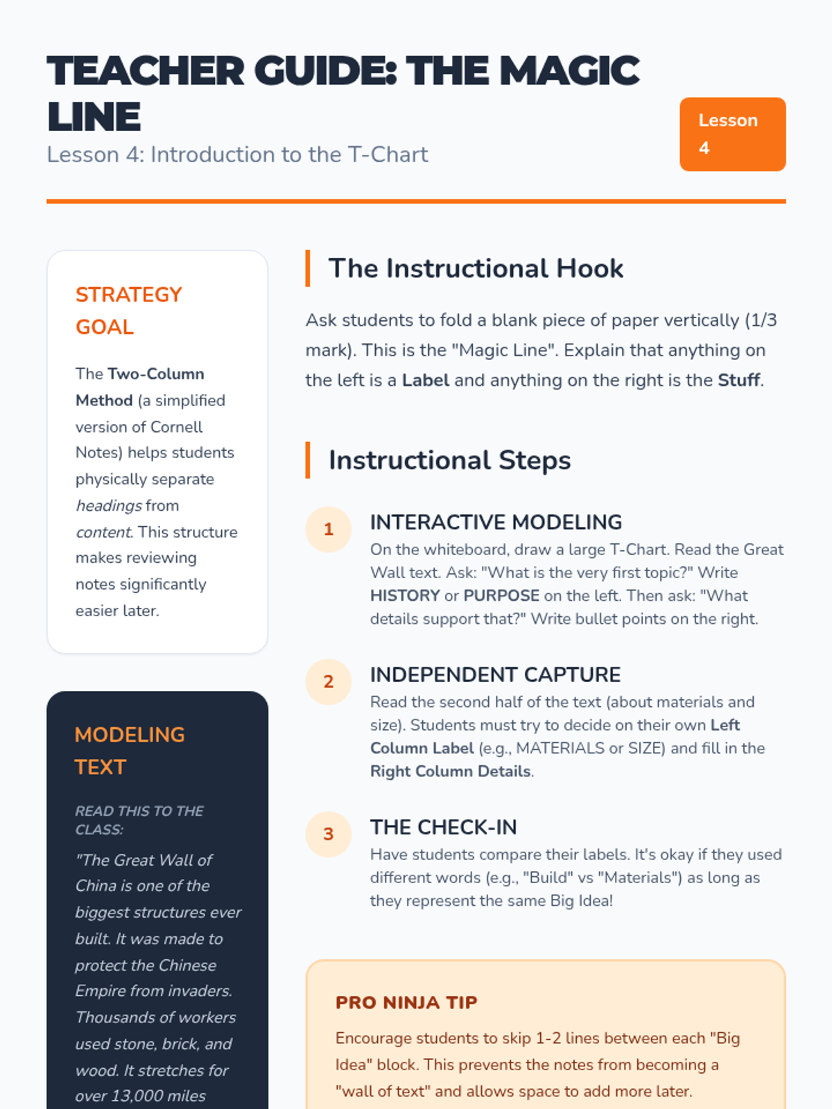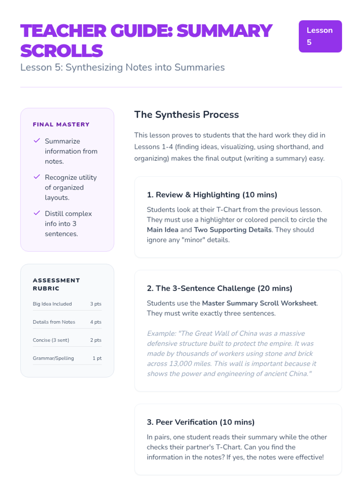 A comprehensive 4th-grade sequence teaching students how to organize information through visual mapping, shorthand, and two-column note-taking. Students transition from identifying main ideas to synthesizing their own notes into summaries.