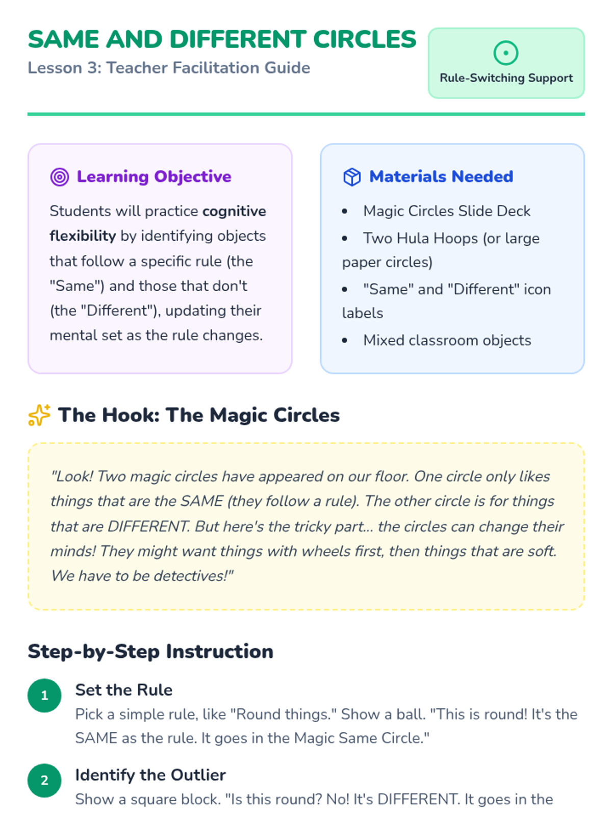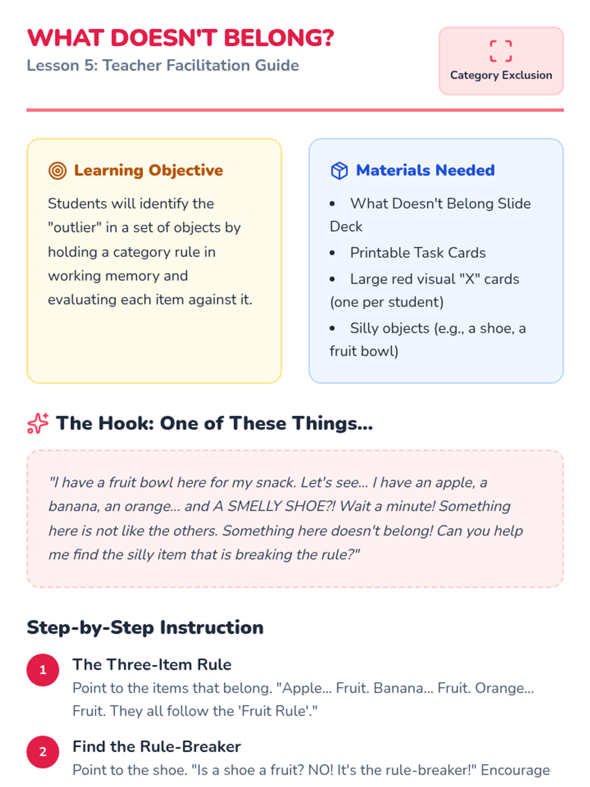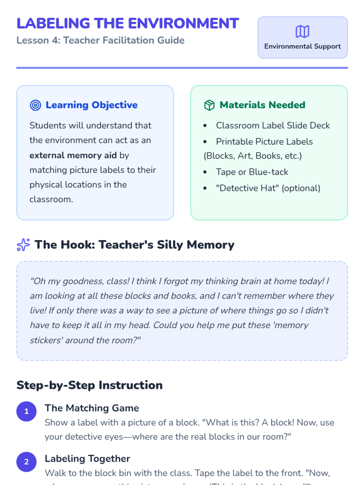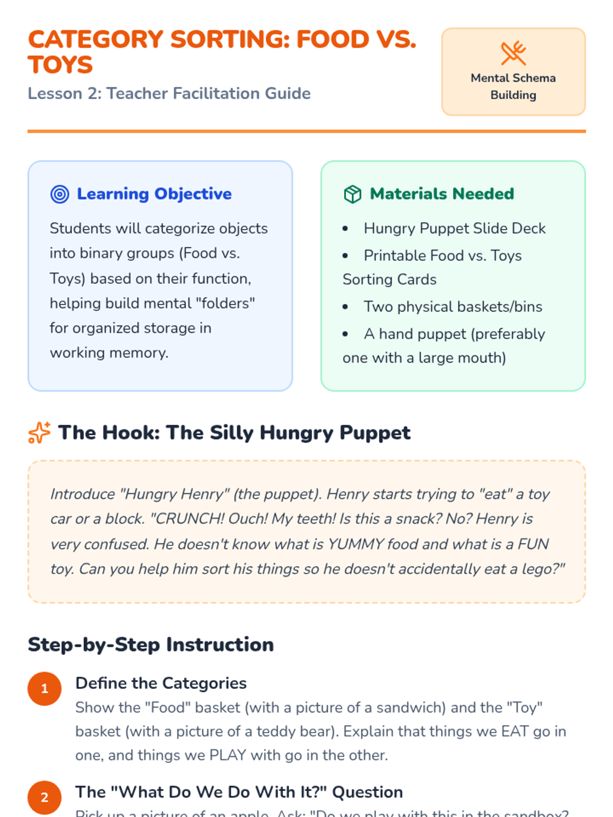 A 5-lesson sequence for Pre-K students designed to support working memory through visual organization and sorting. Students learn to chunk information using color, category, and environmental cues to reduce cognitive load.