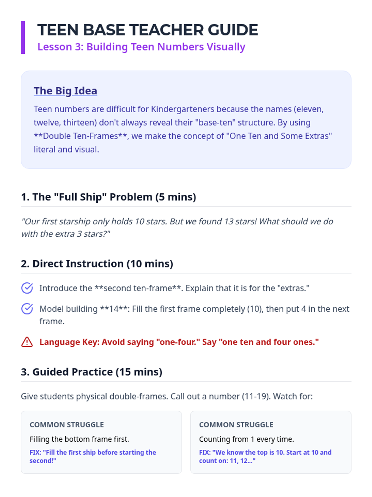 A Kindergarten math sequence focused on understanding place value through the composition of teen numbers as 'ten and some more'. Students use physical manipulatives and music to reinforce the pattern of adding ones to a base of ten.
