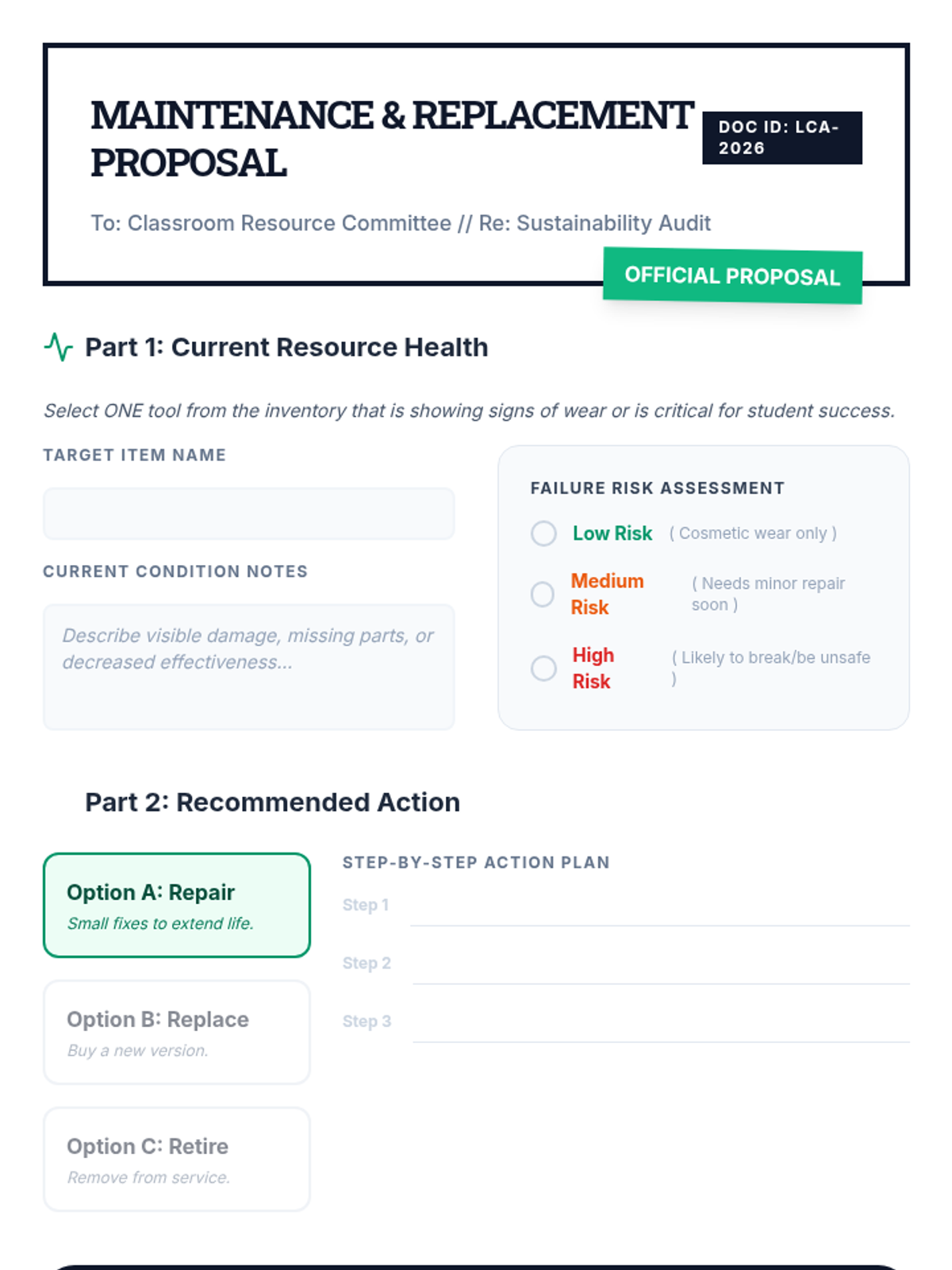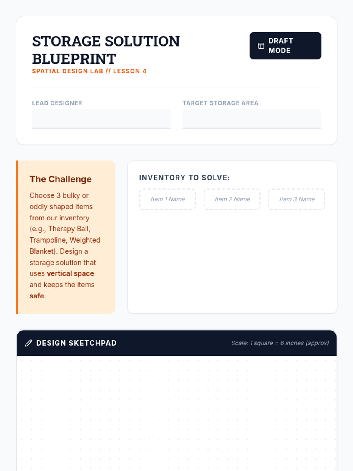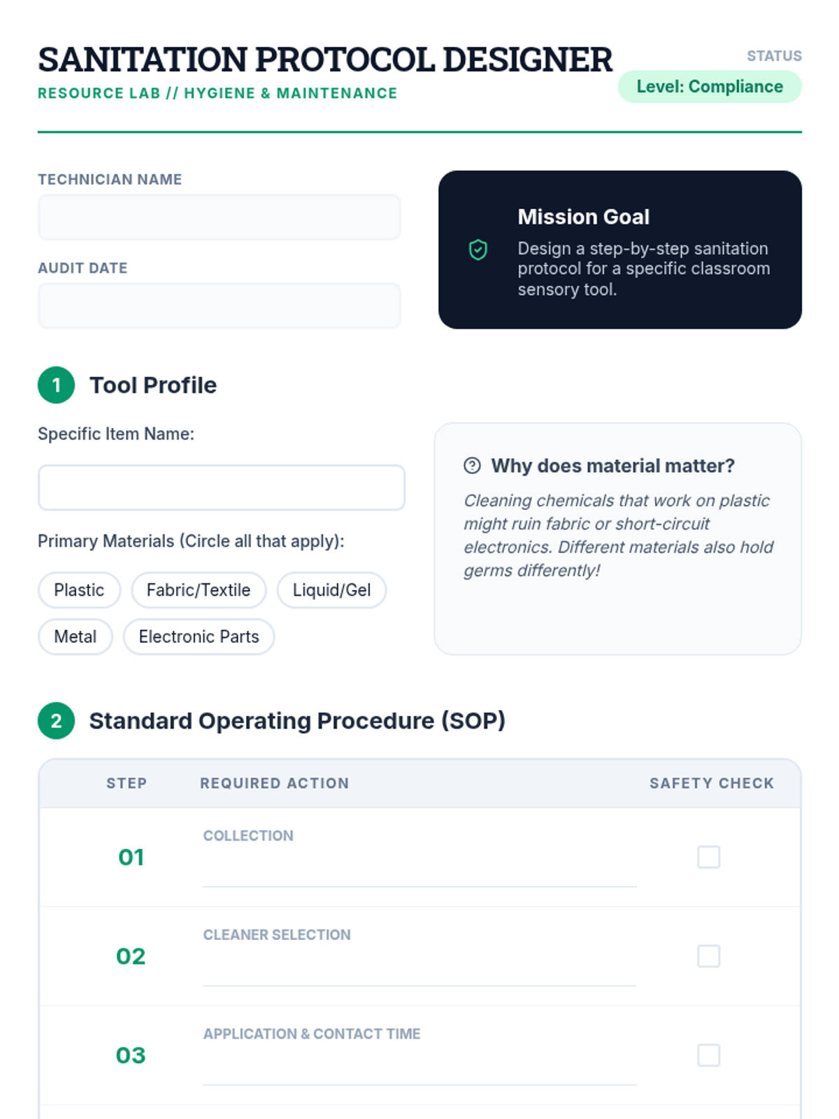 A comprehensive sequence for 11th-grade students to master the organization, maintenance, and management of sensory tools and classroom resources. Students transition from identifying tools to designing professional-grade inventory and hygiene systems.