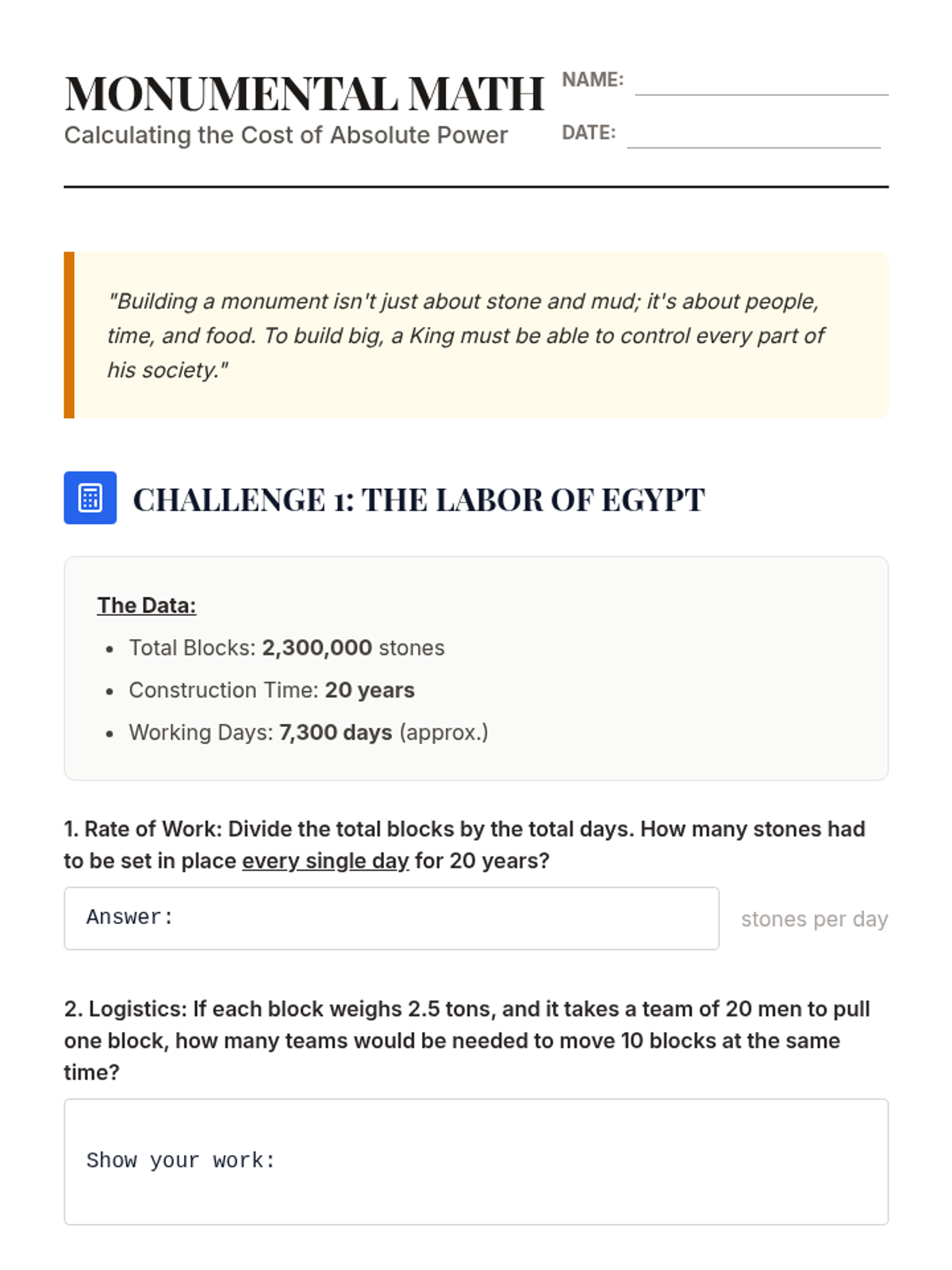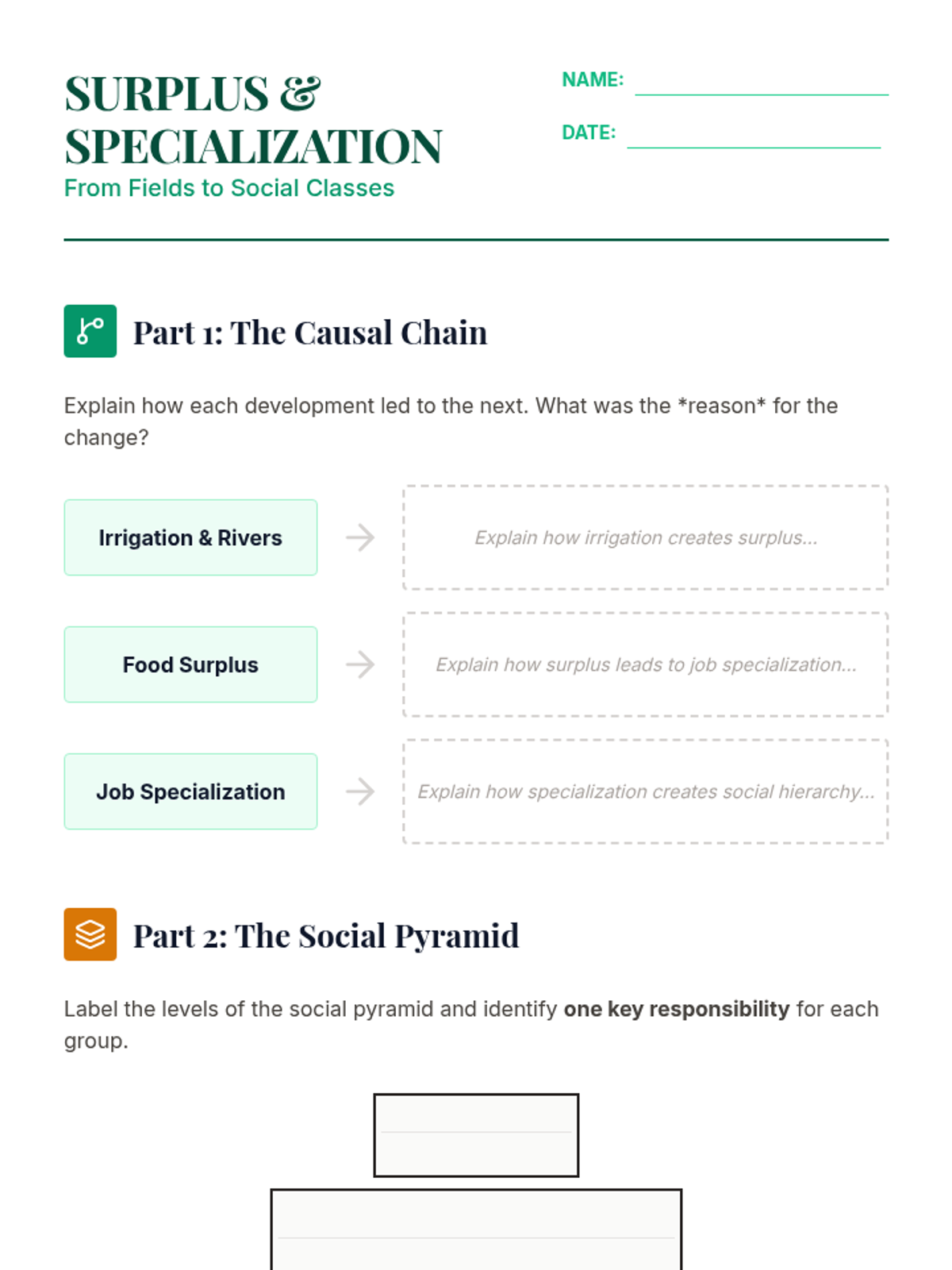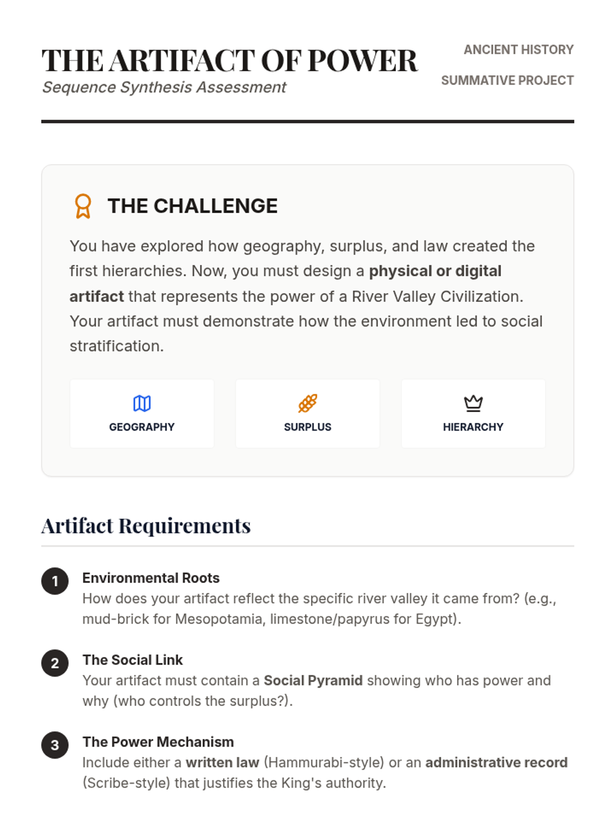An inquiry-based sequence exploring the development of Mesopotamia and Egypt through geography, surplus, law, architecture, and writing. Students investigate the causal links between environmental factors and the rise of social hierarchy.