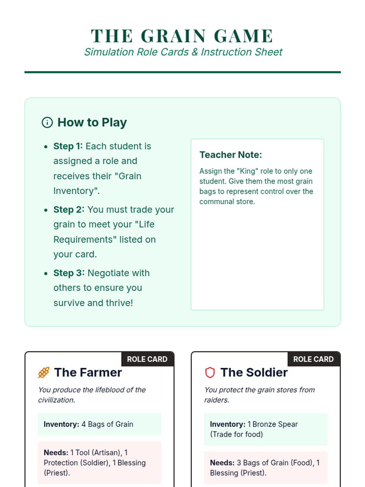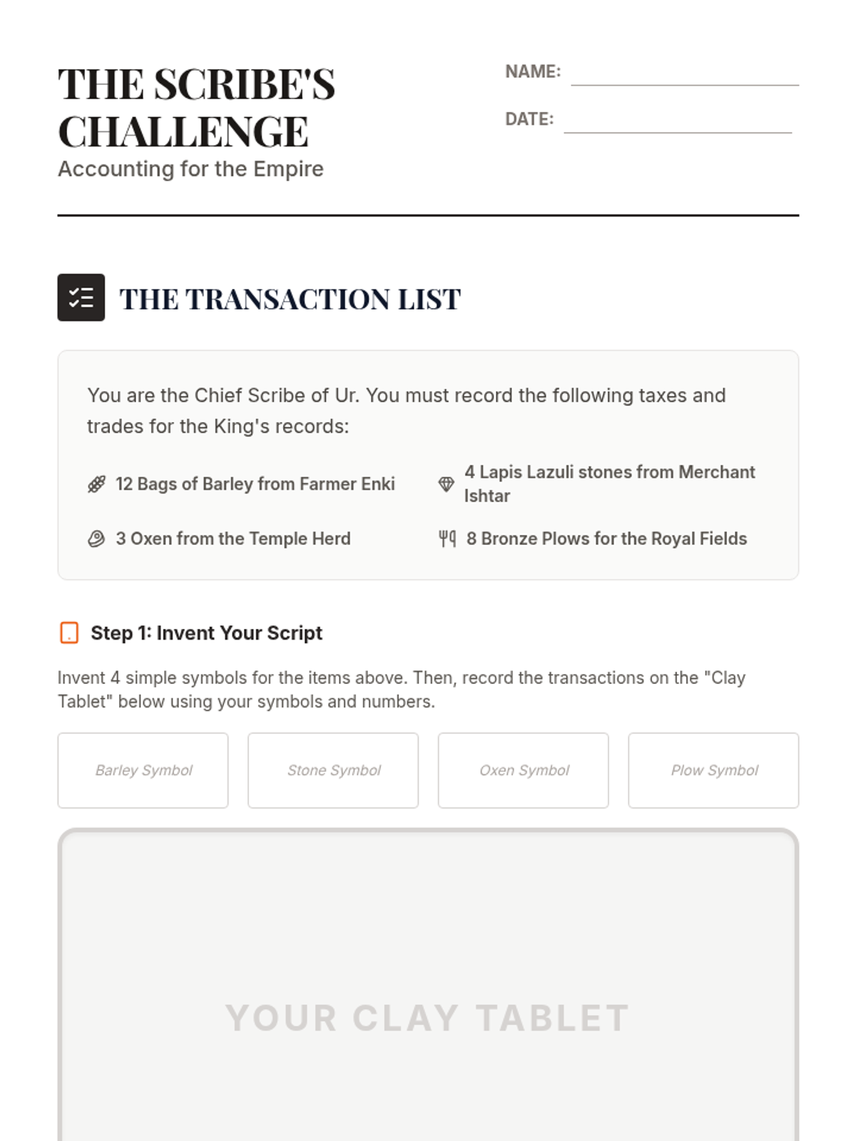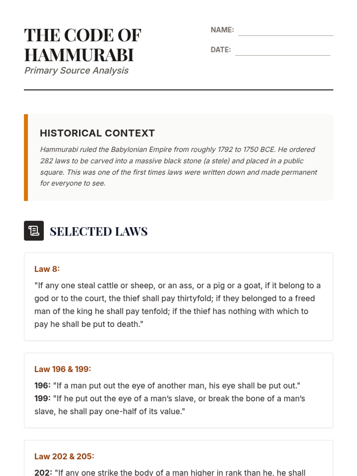 An inquiry-based sequence exploring the development of Mesopotamia and Egypt through geography, surplus, law, architecture, and writing. Students investigate the causal links between environmental factors and the rise of social hierarchy.