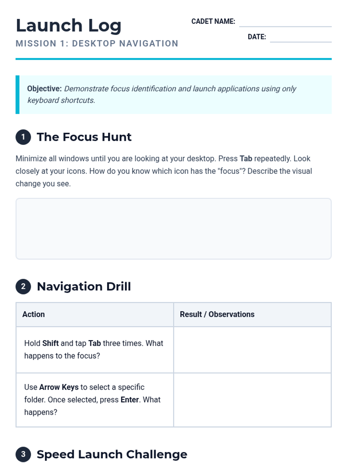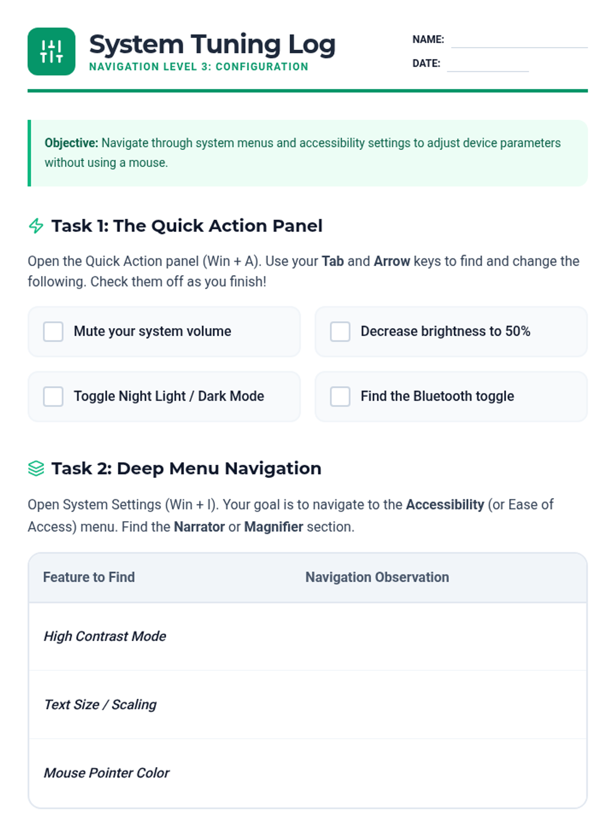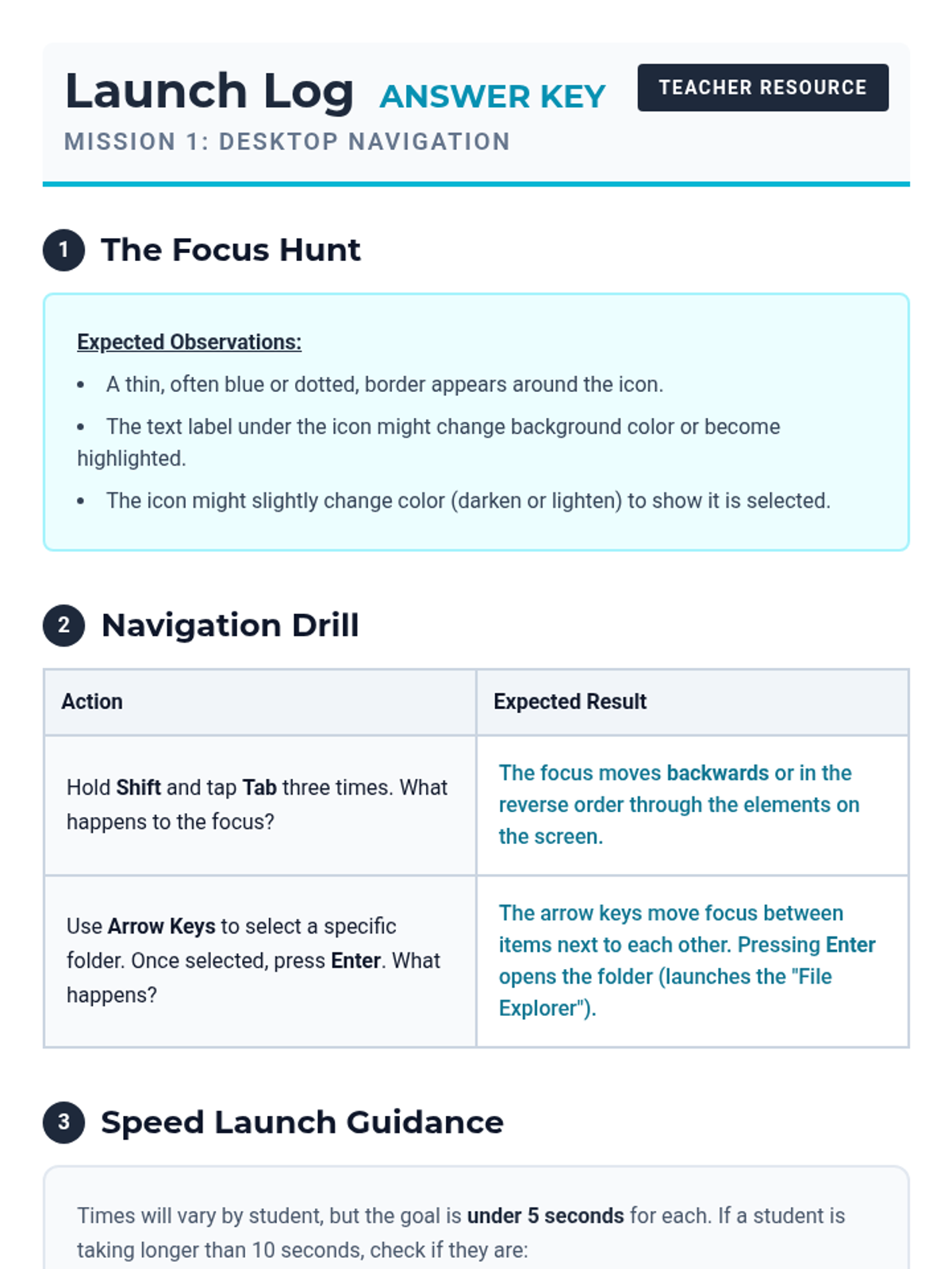 This sequence teaches 8th-grade students how to navigate their computer's operating system using only keyboard shortcuts. It covers desktop navigation, multitasking, system settings, and modal interactions to promote independence and efficiency for students using assistive technology.