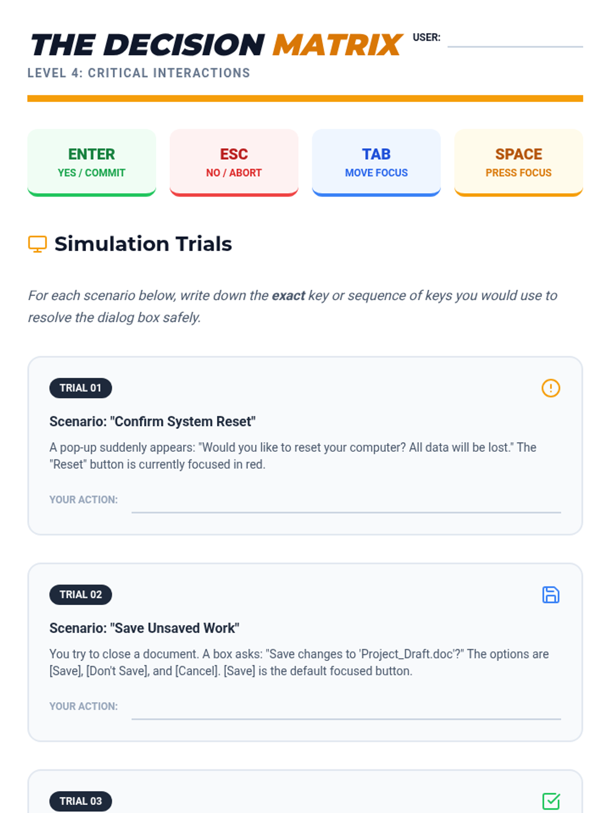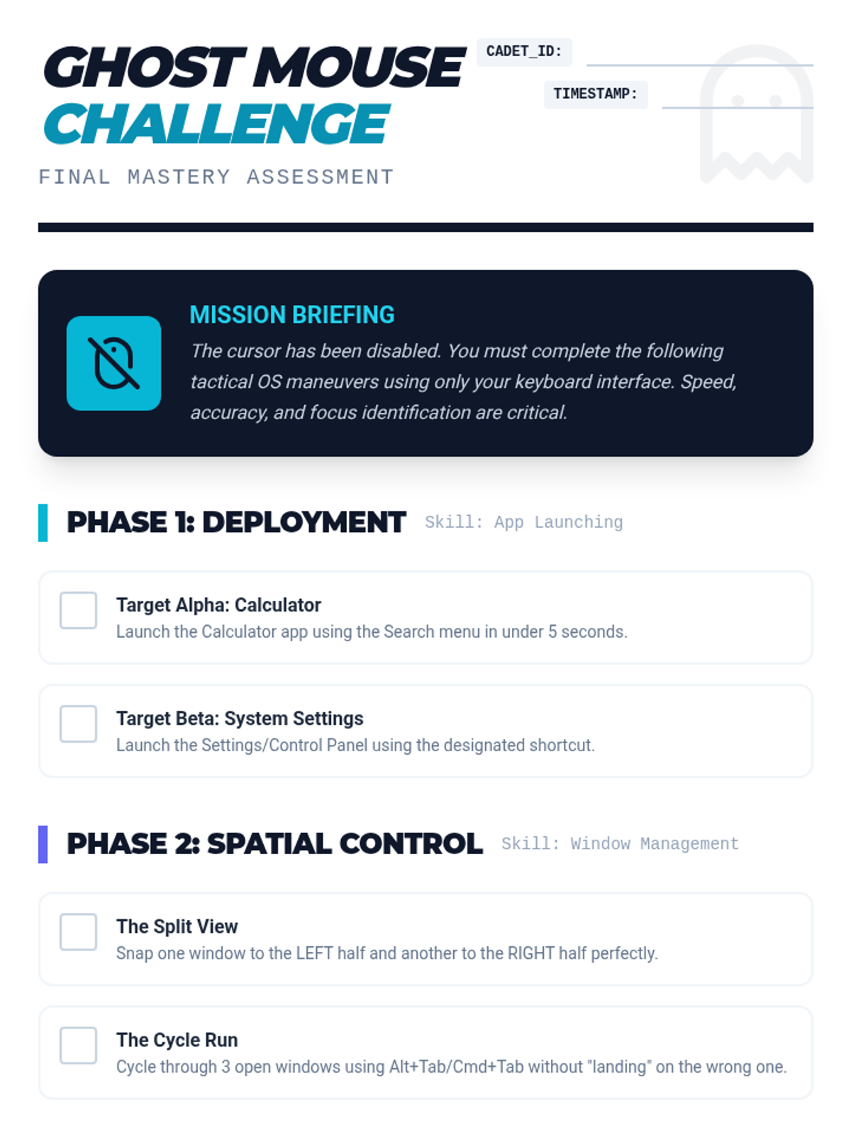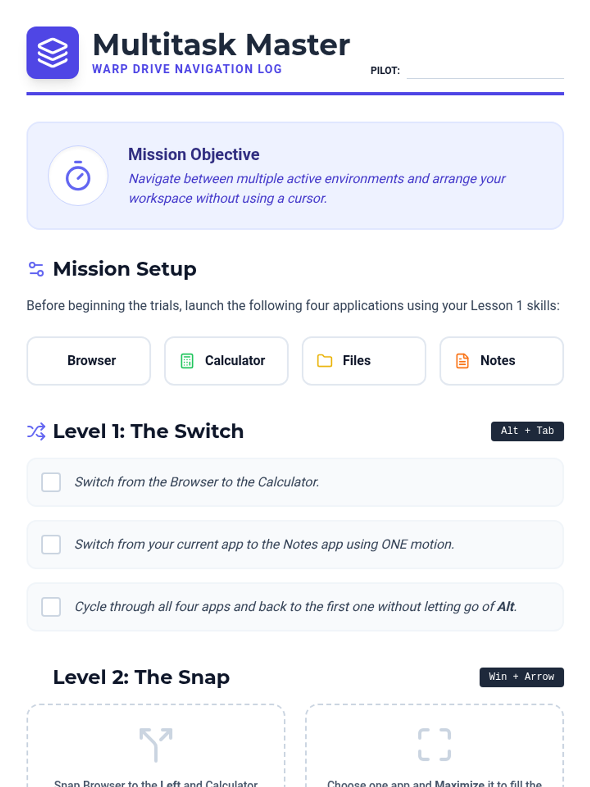 This sequence teaches 8th-grade students how to navigate their computer's operating system using only keyboard shortcuts. It covers desktop navigation, multitasking, system settings, and modal interactions to promote independence and efficiency for students using assistive technology.