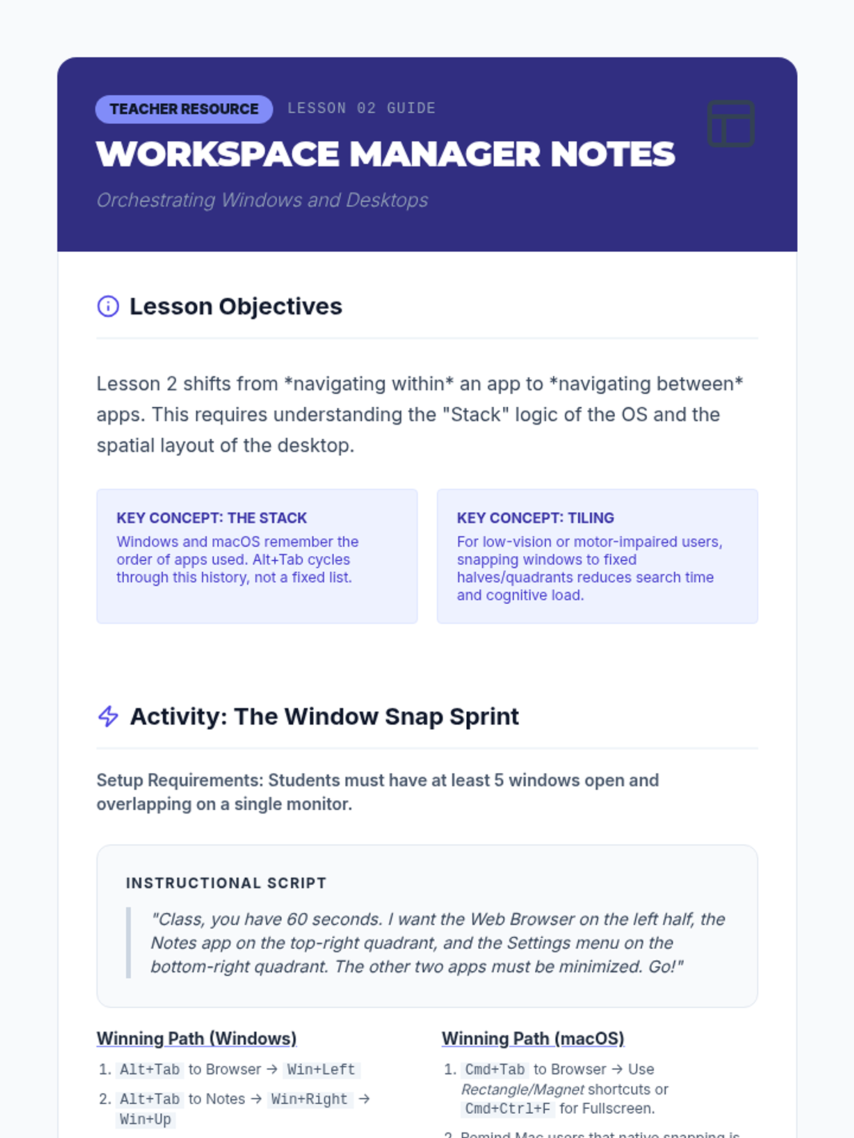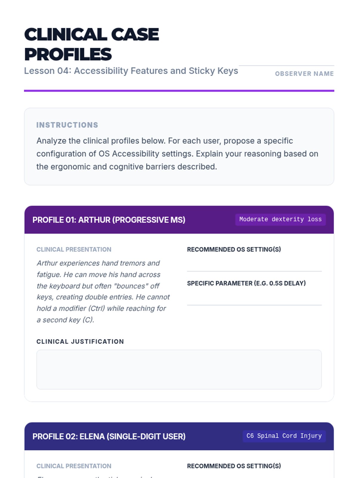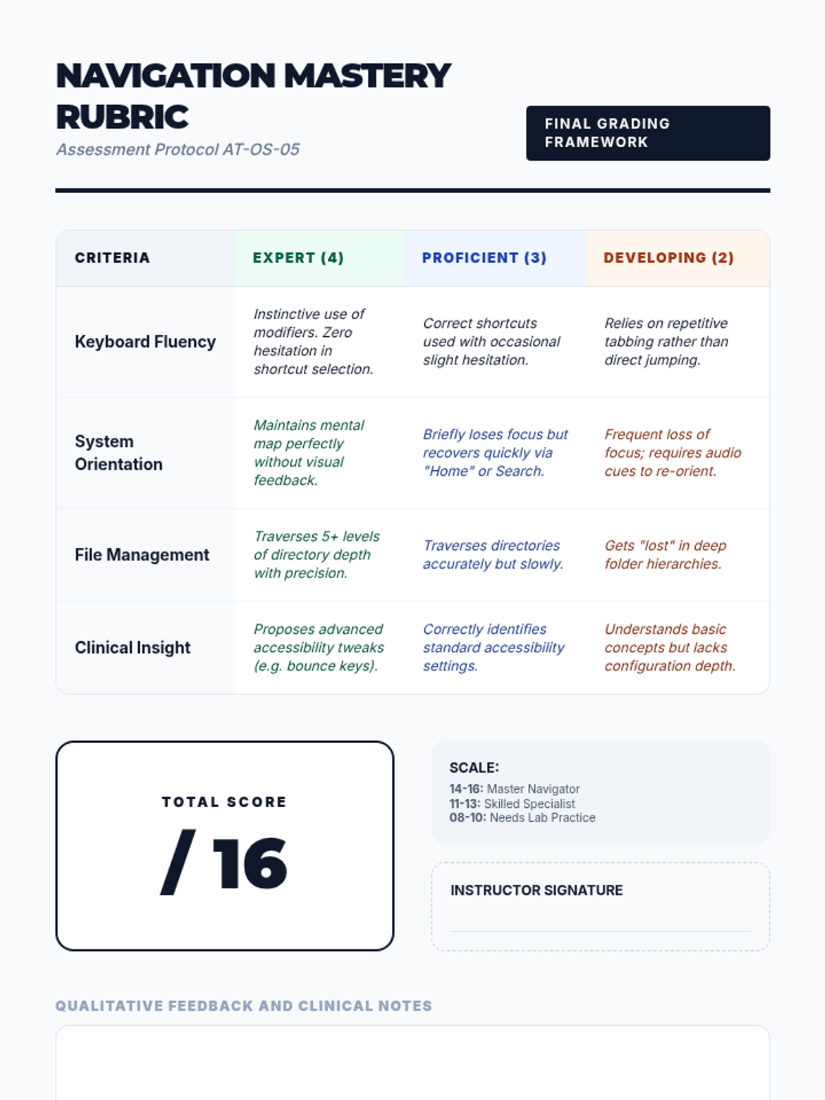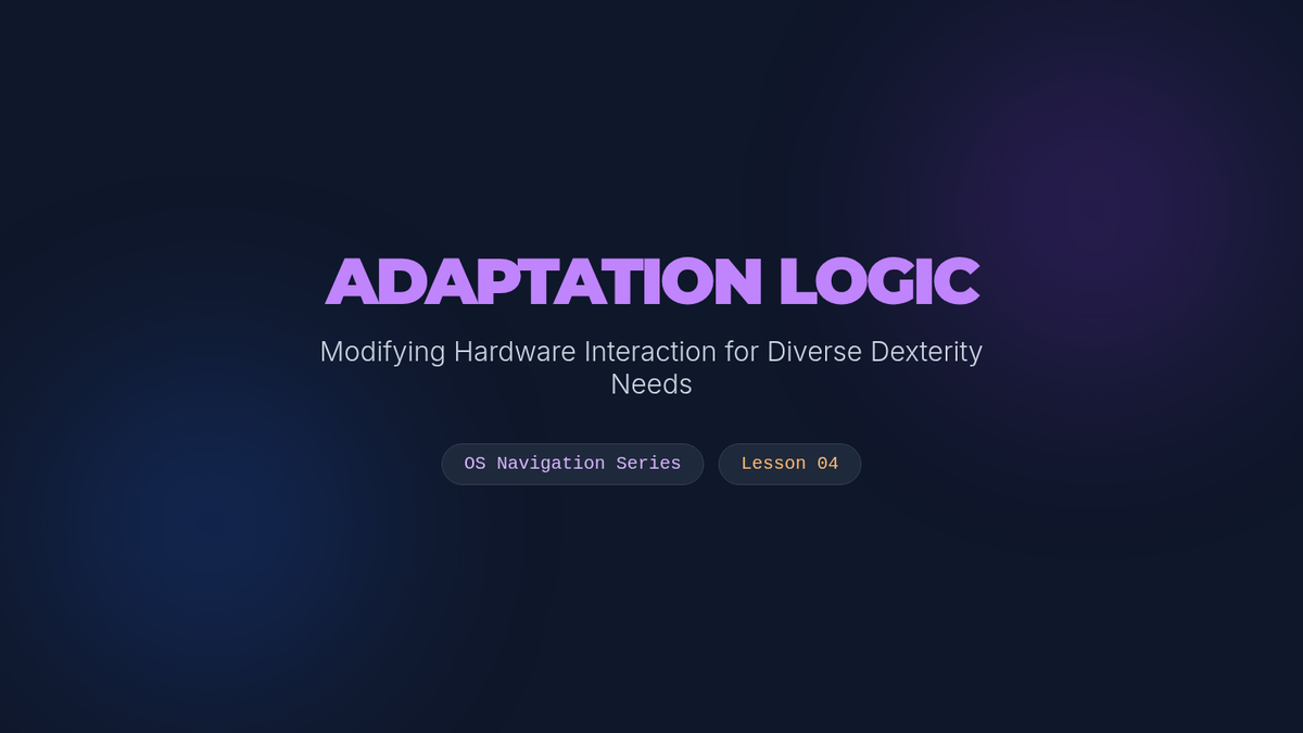 A graduate-level sequence focused on the technical and systemic mastery of keyboard-only navigation for Windows and macOS. Students explore focus management, file traversal, and accessibility settings through the lens of motor-impairment simulation and clinical application.