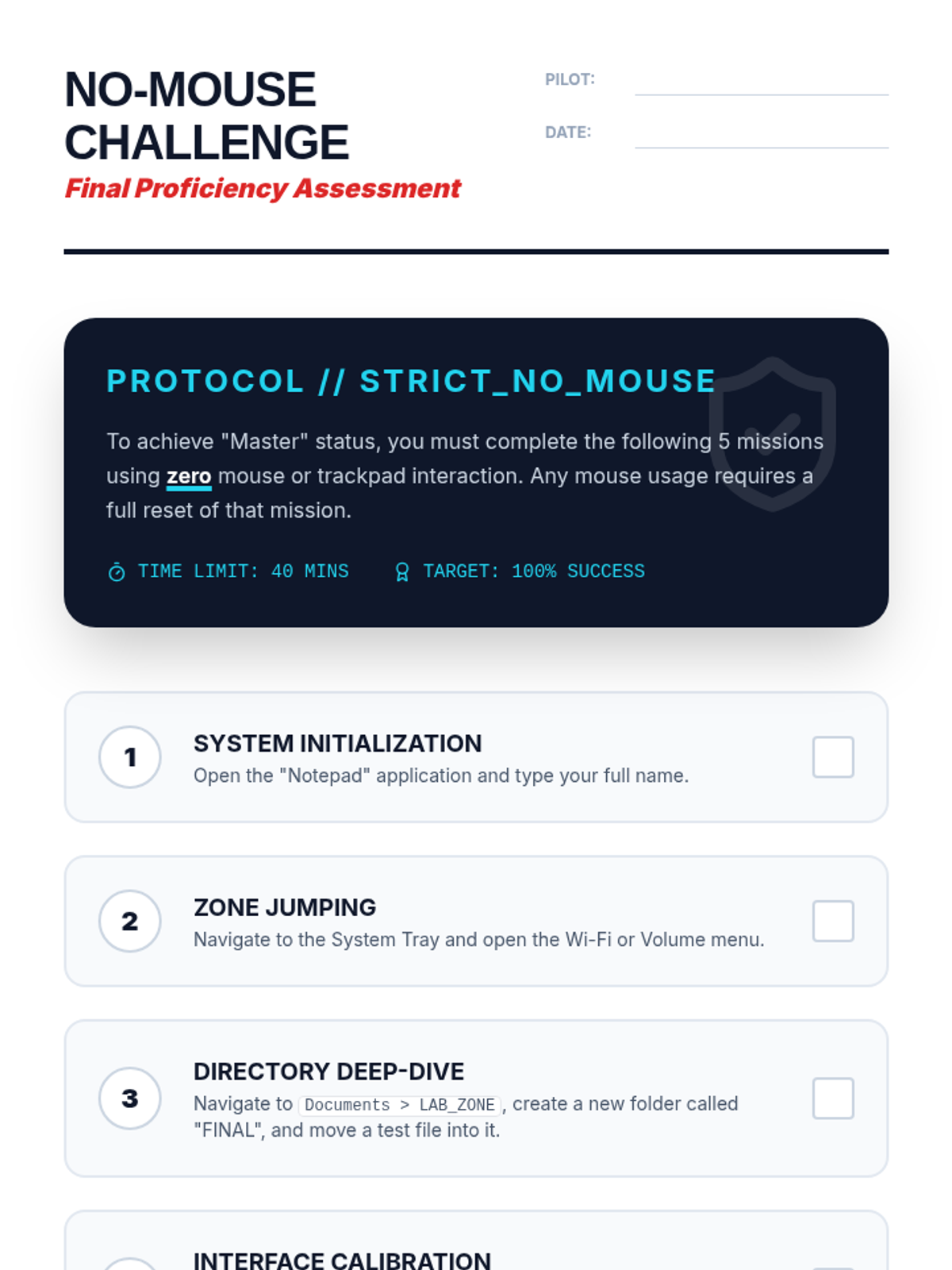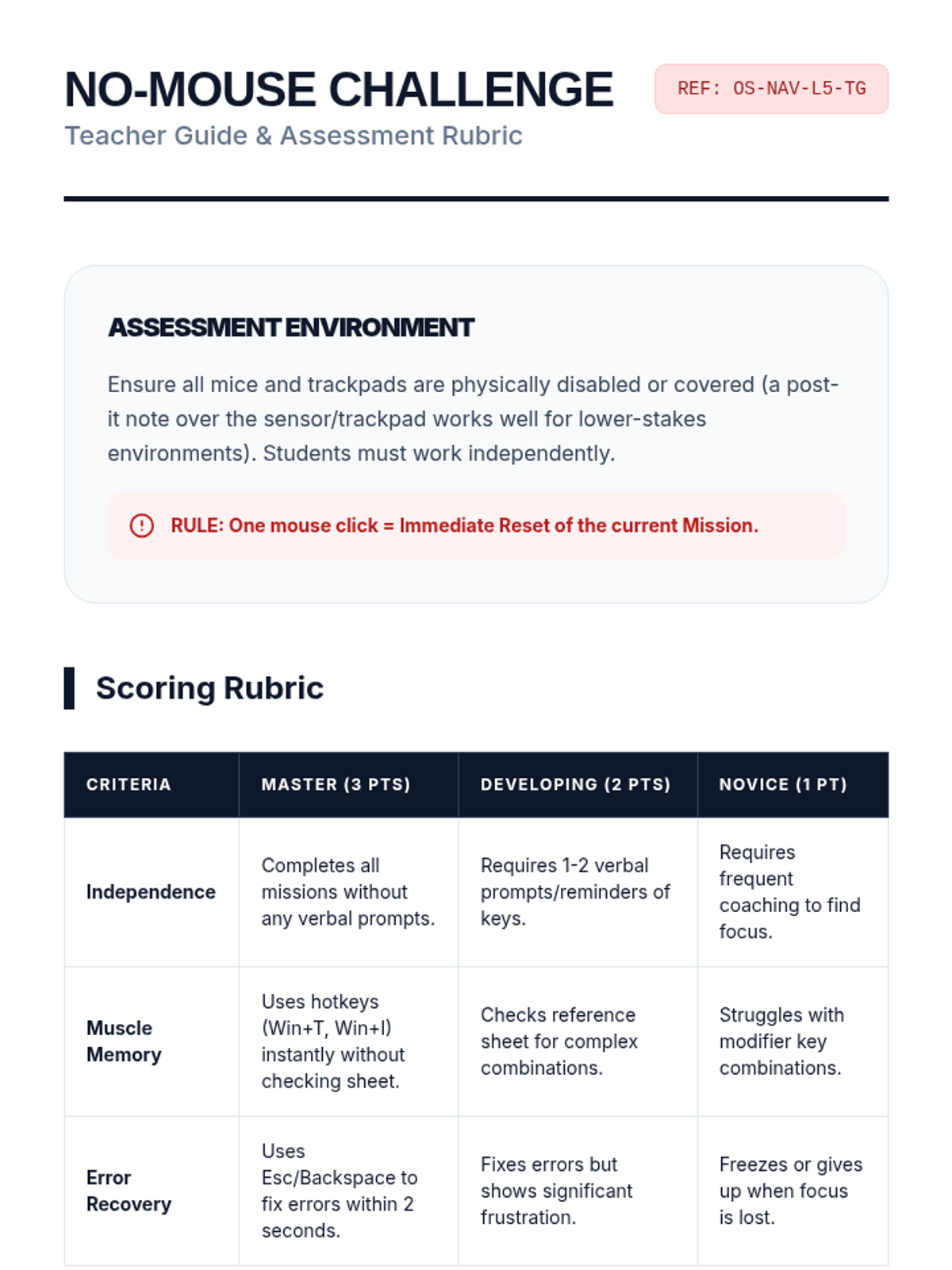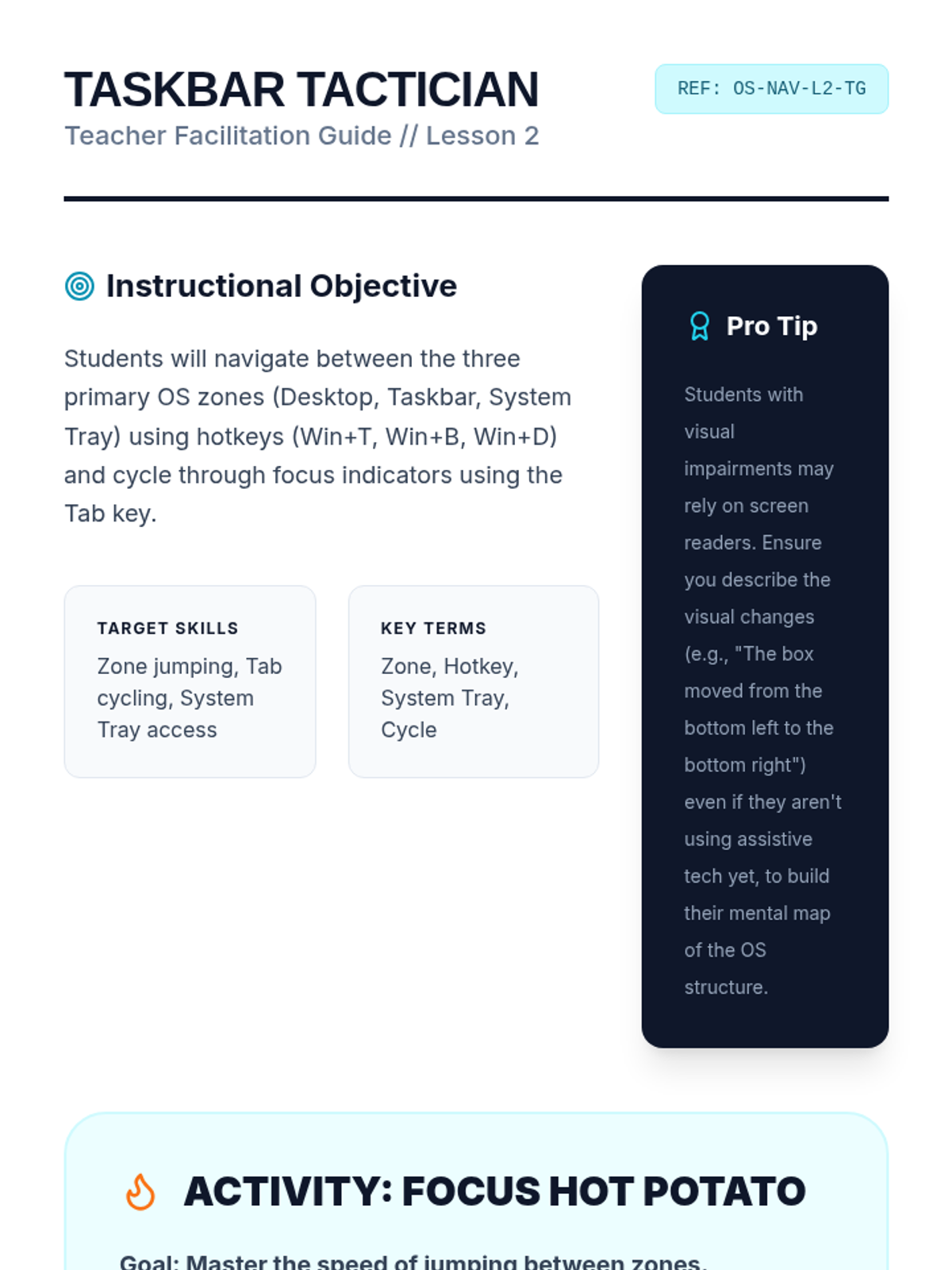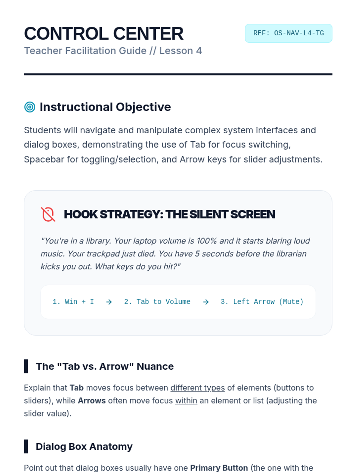 A comprehensive sequence for 10th-grade students with motor or visual impairments to master operating system navigation using only keyboard shortcuts. It covers focus indicators, menu navigation, file management, and system settings.