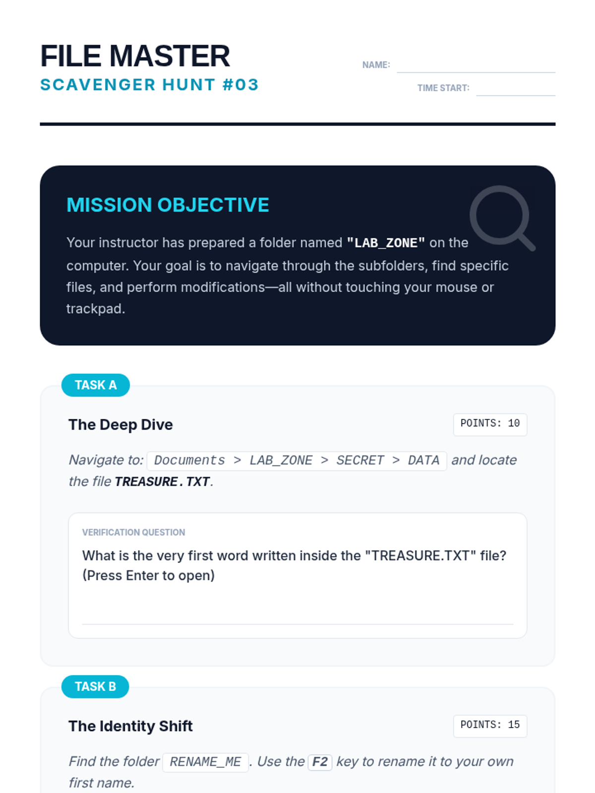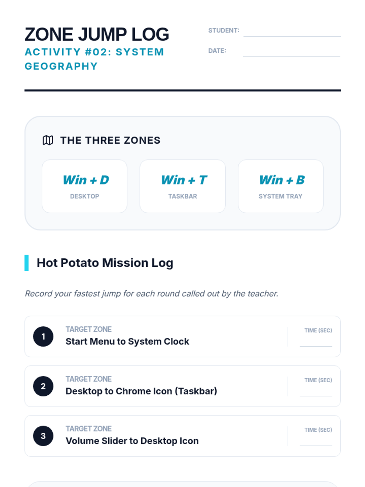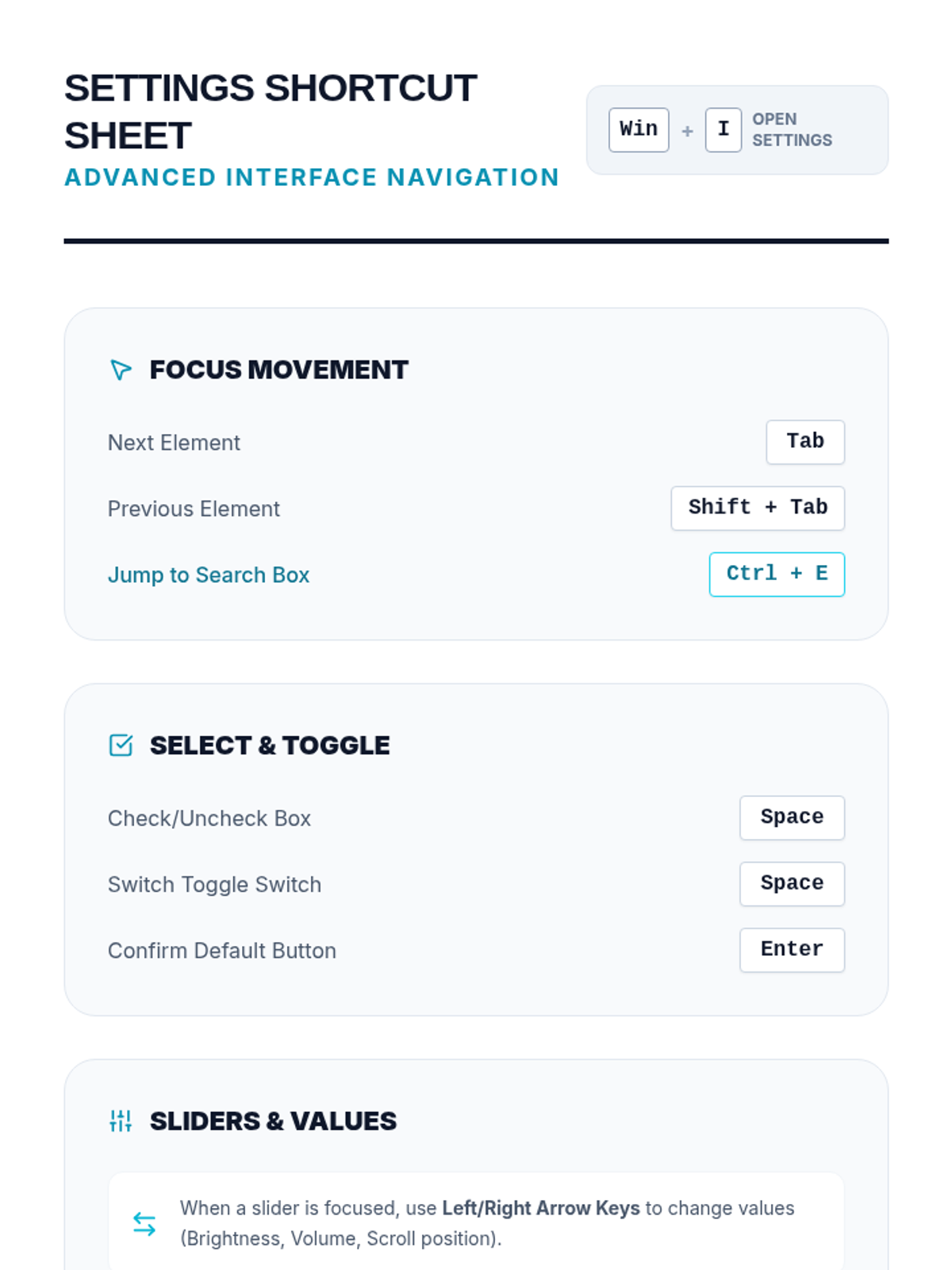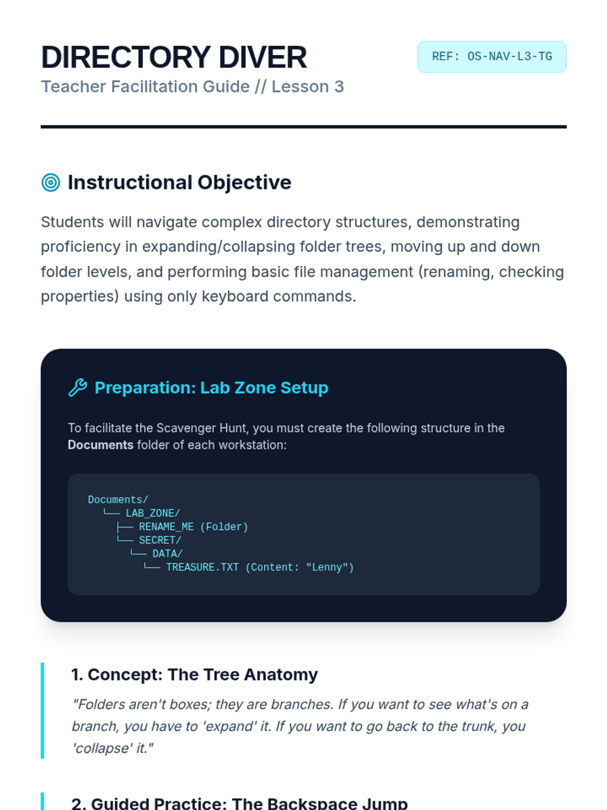 A comprehensive sequence for 10th-grade students with motor or visual impairments to master operating system navigation using only keyboard shortcuts. It covers focus indicators, menu navigation, file management, and system settings.