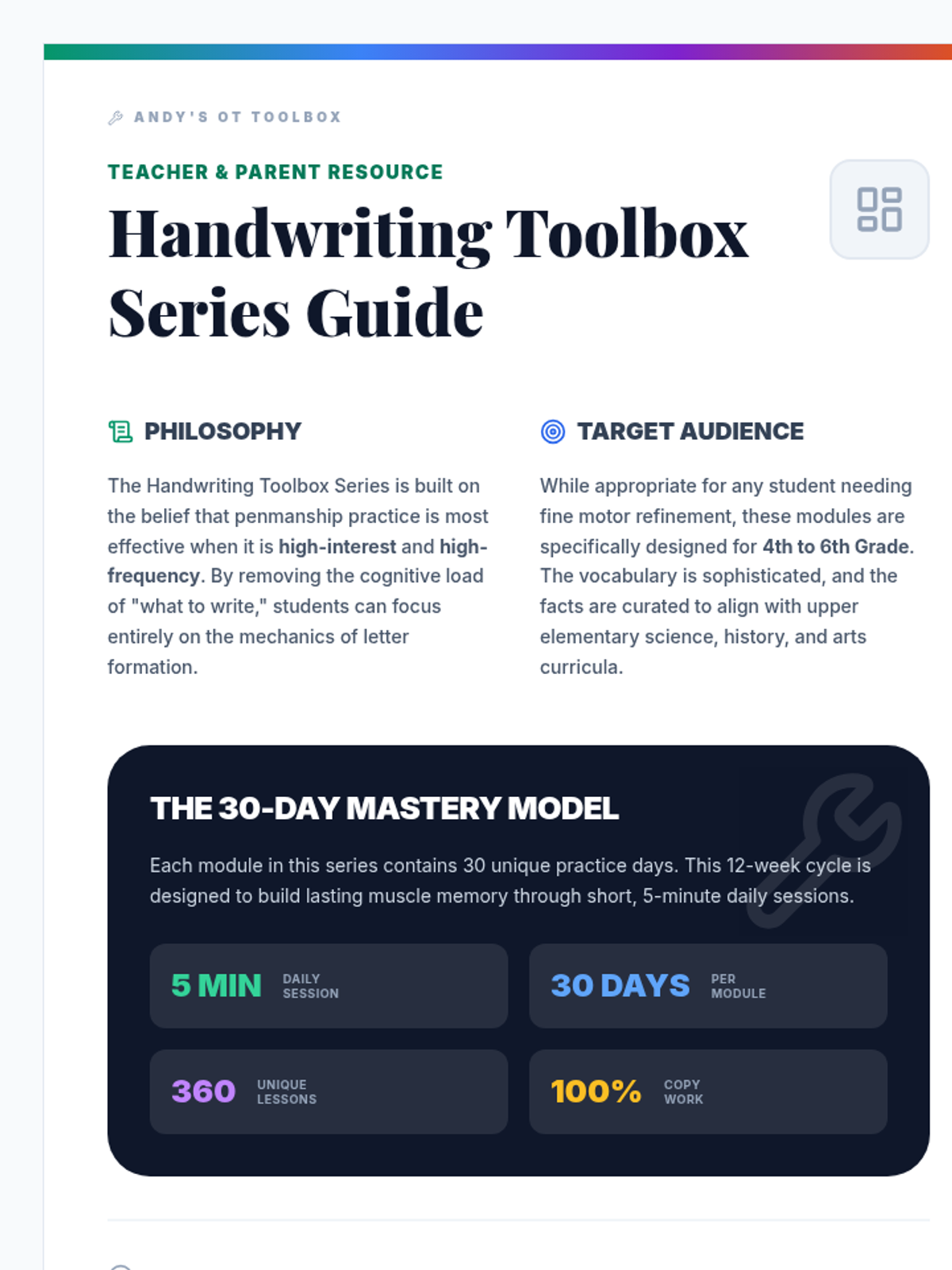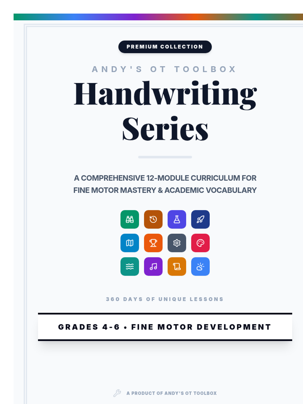 A series of thematic handwriting programs designed to improve fine motor skills and penmanship through daily practice sessions centered around fascinating educational topics like biology and history.