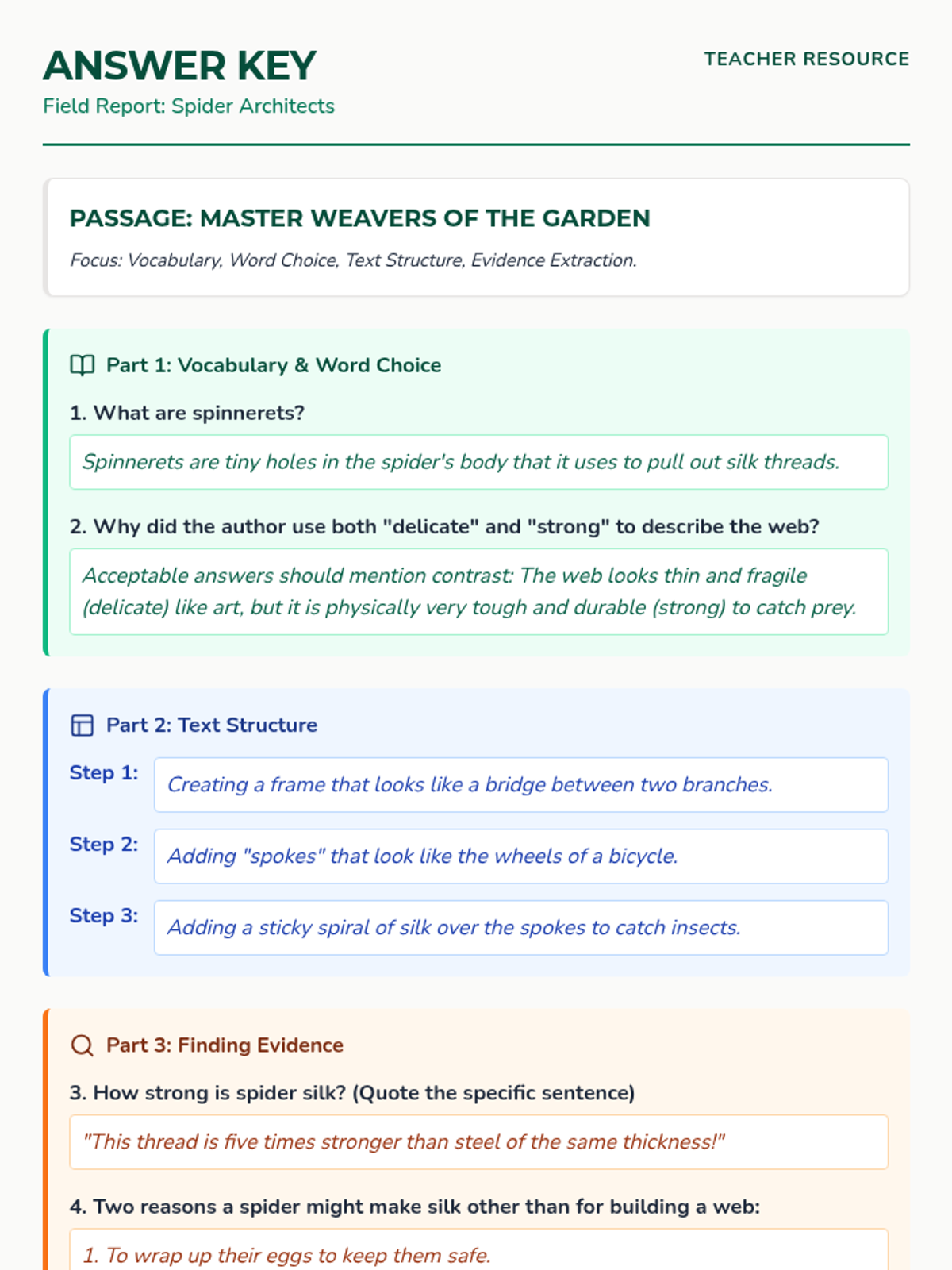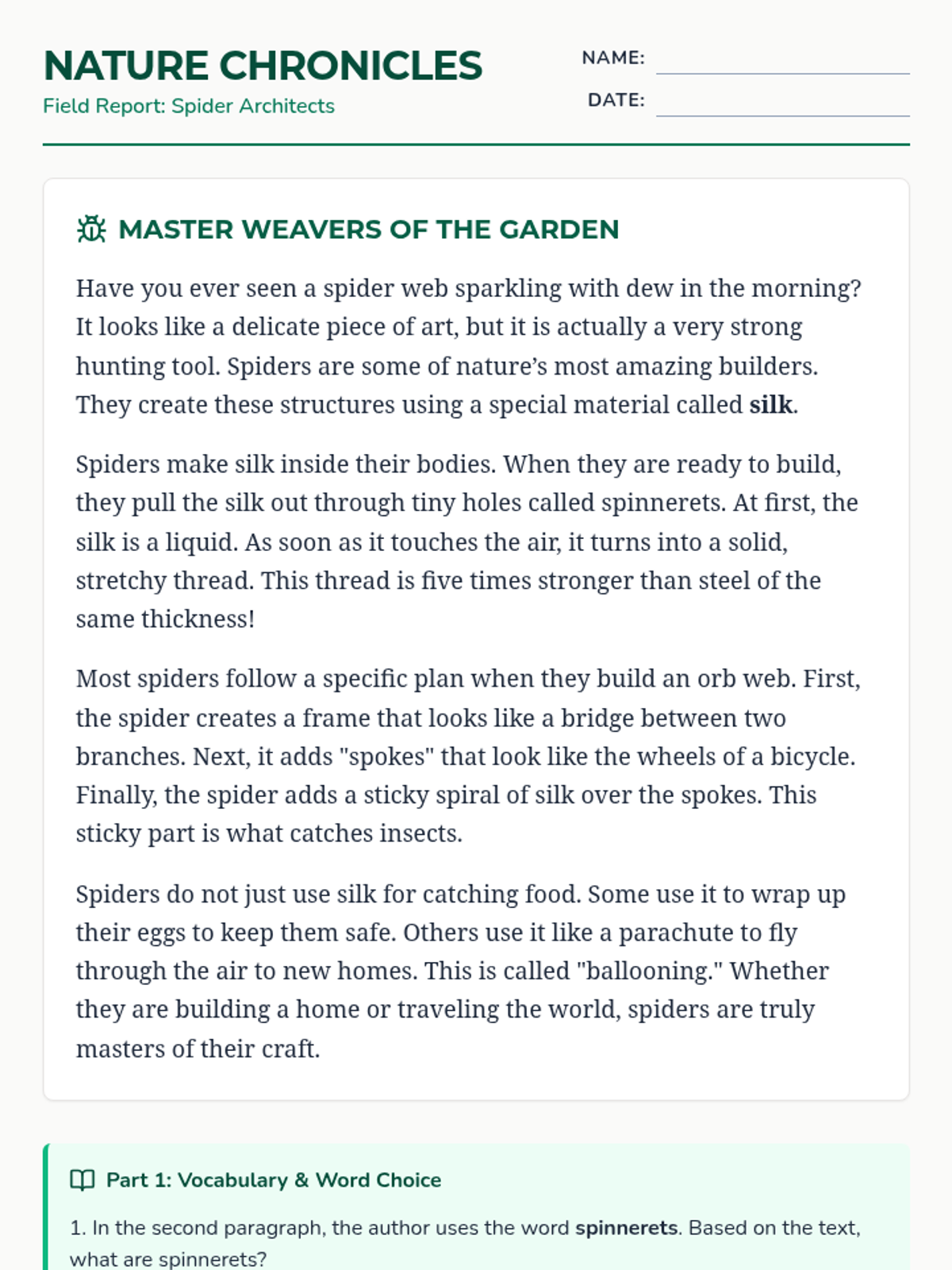 A reading comprehension sequence for 4th graders focusing on science and nature. Students will develop skills in text structure, vocabulary analysis, and finding textual evidence through engaging passages about the natural world.