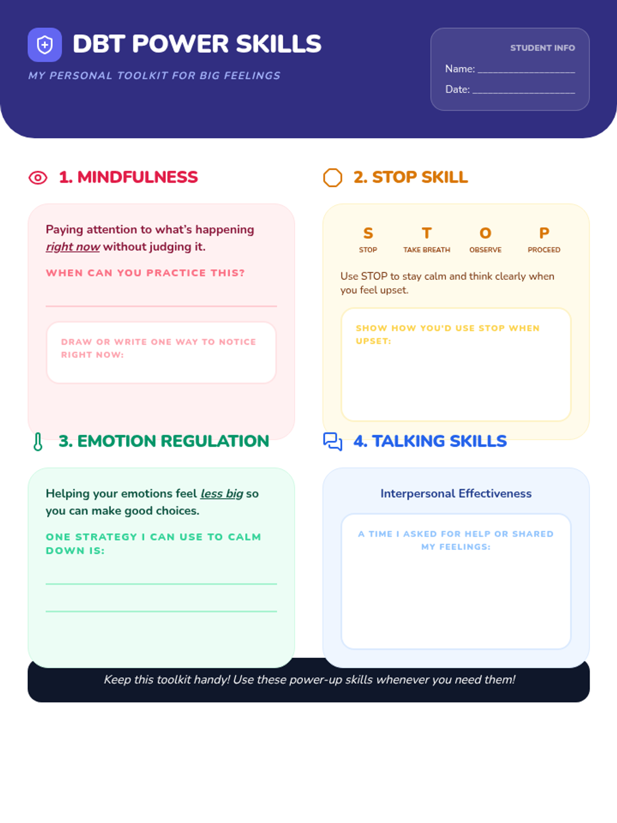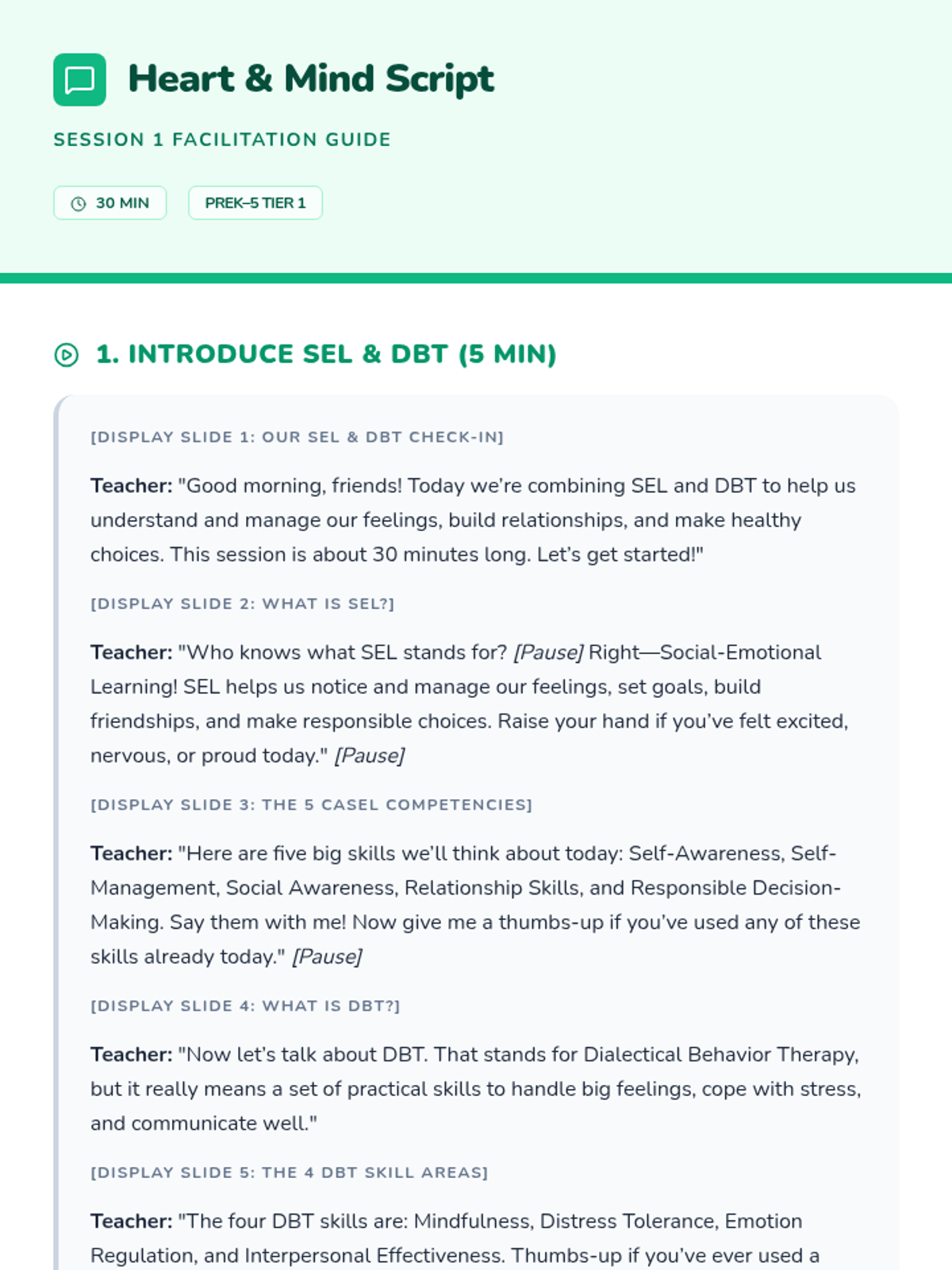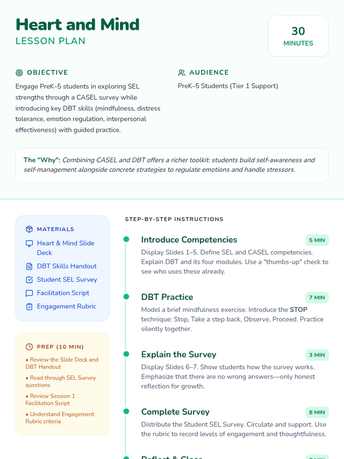 A two-session social-emotional learning sequence for PreK-5 students that integrates CASEL competencies with foundational DBT skills to build self-awareness, emotional regulation, and responsible decision-making.