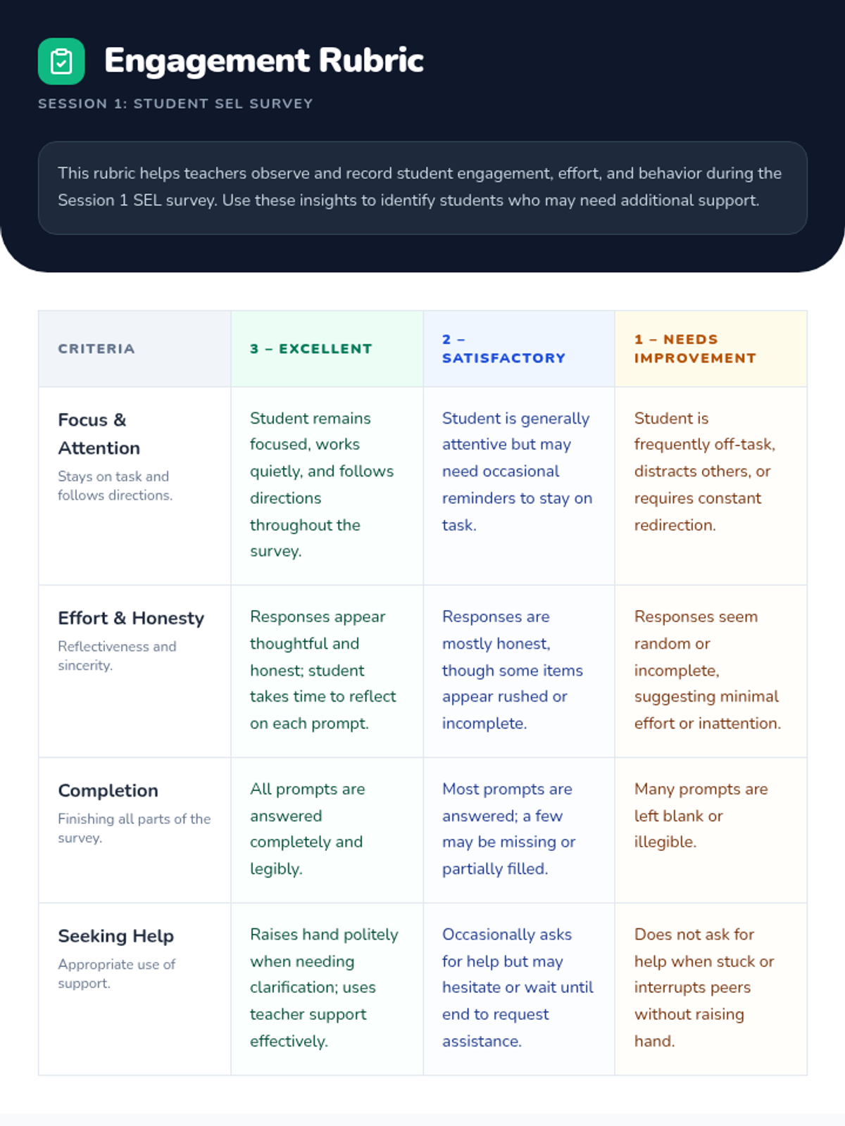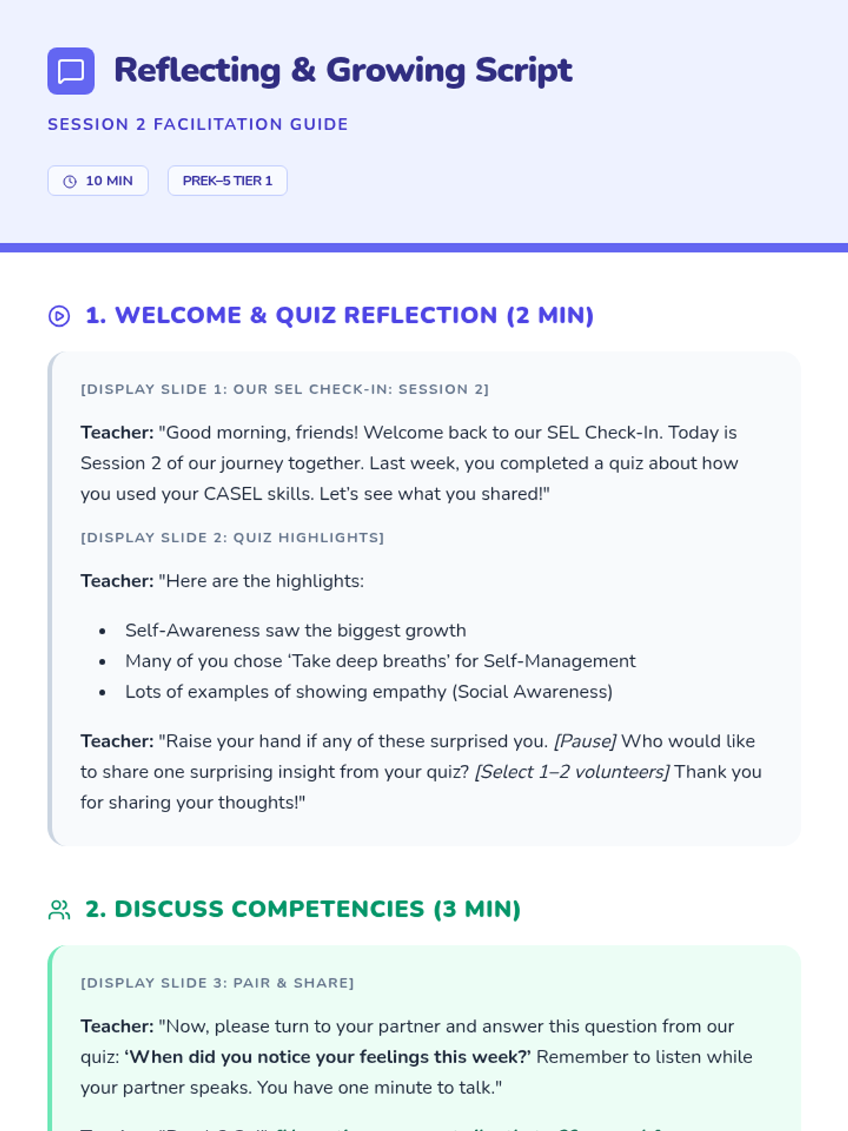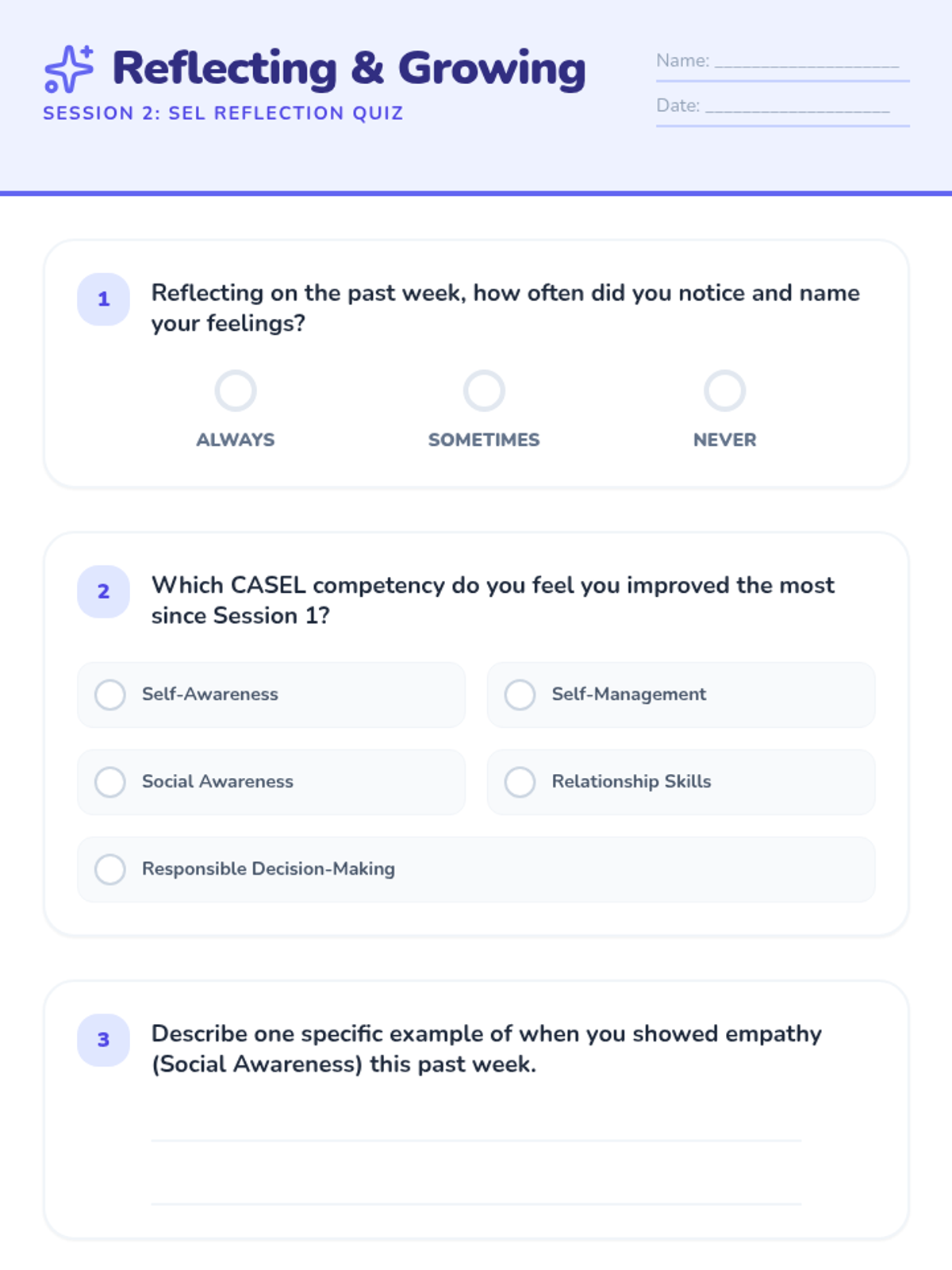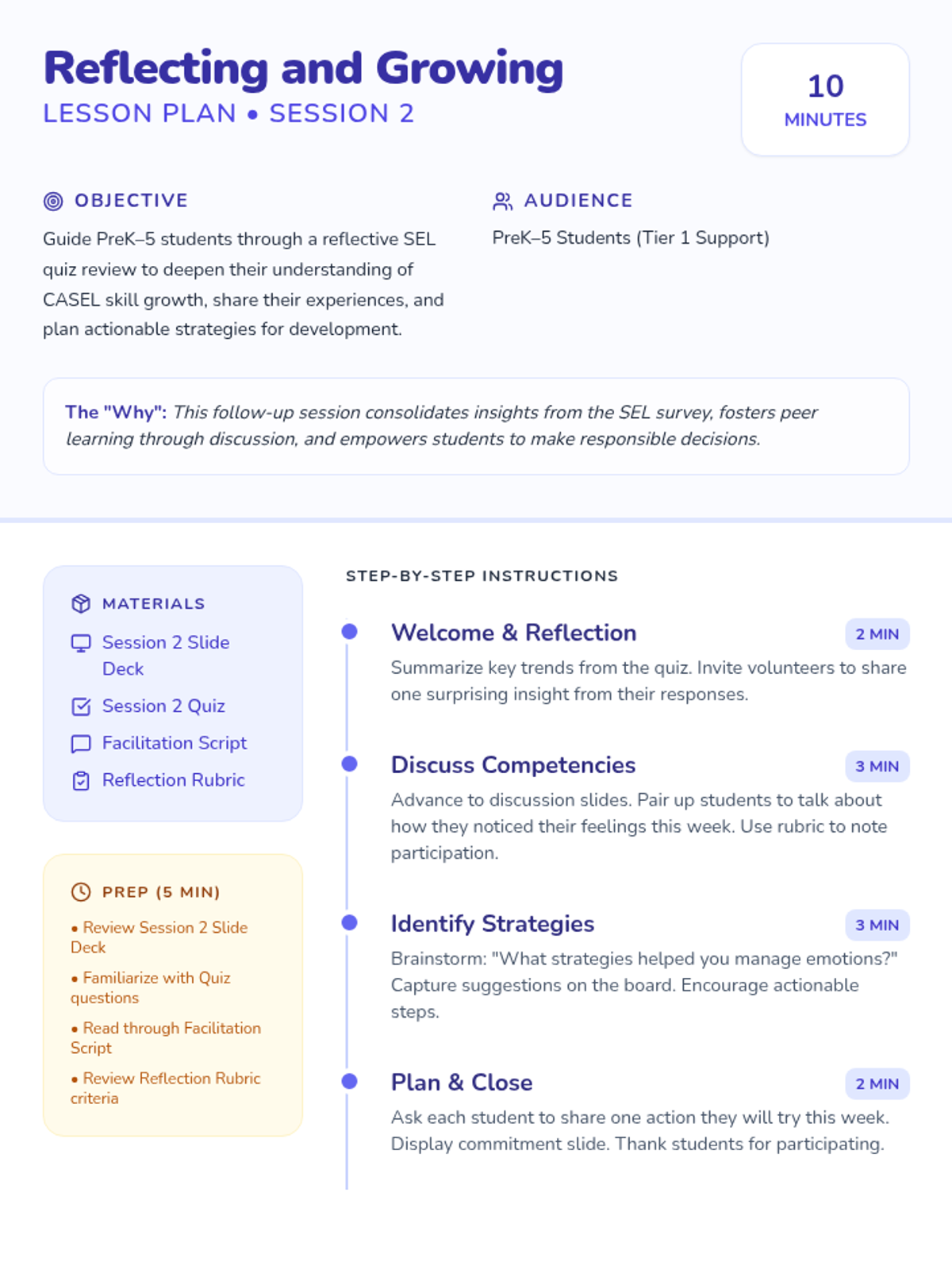 A two-session social-emotional learning sequence for PreK-5 students that integrates CASEL competencies with foundational DBT skills to build self-awareness, emotional regulation, and responsible decision-making.