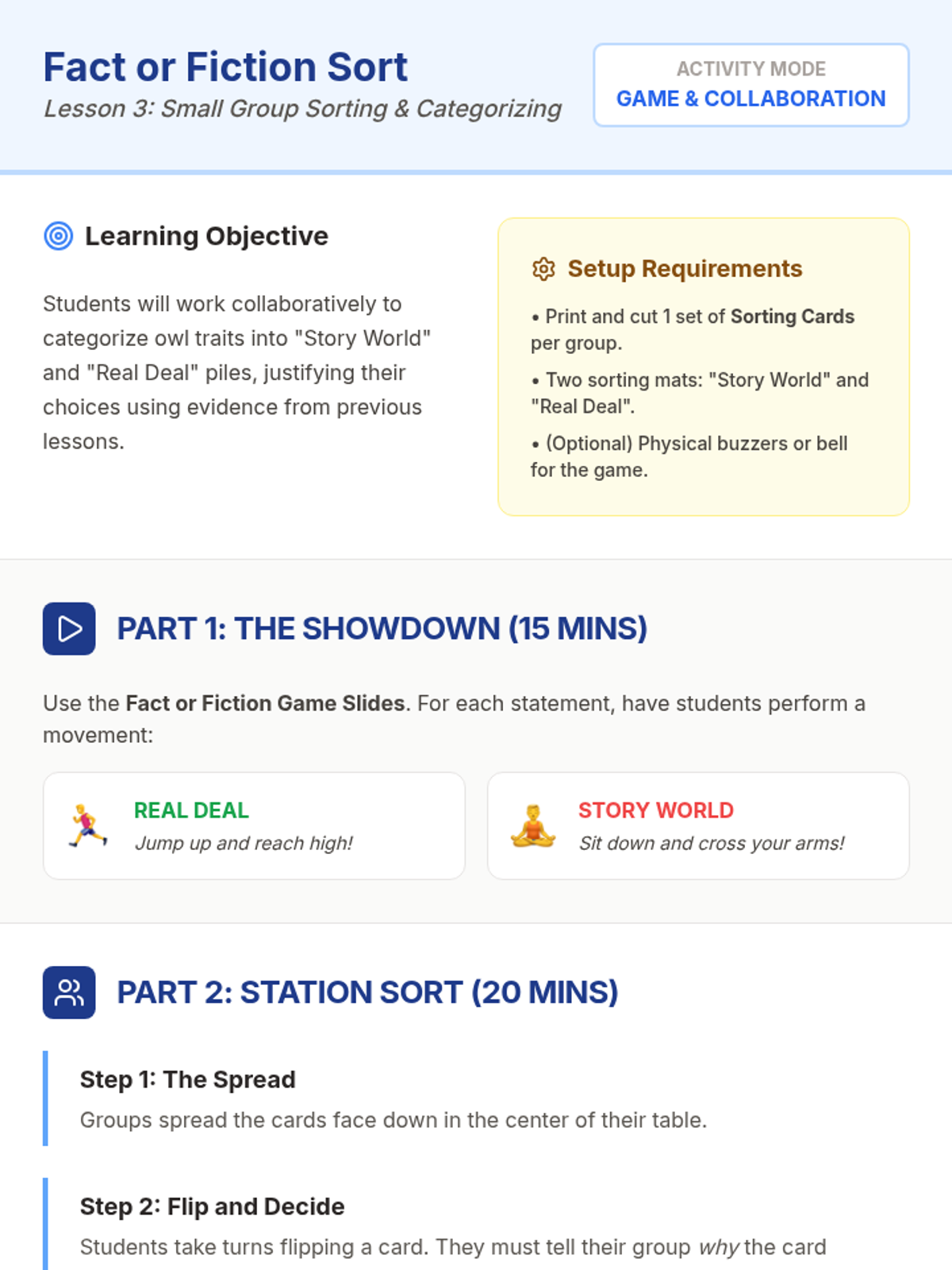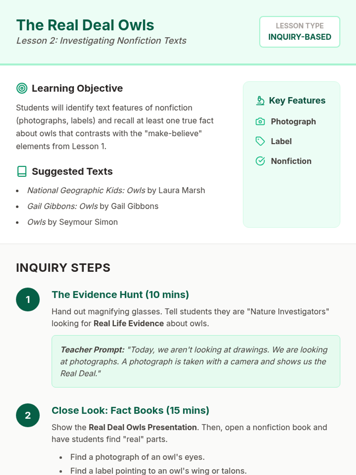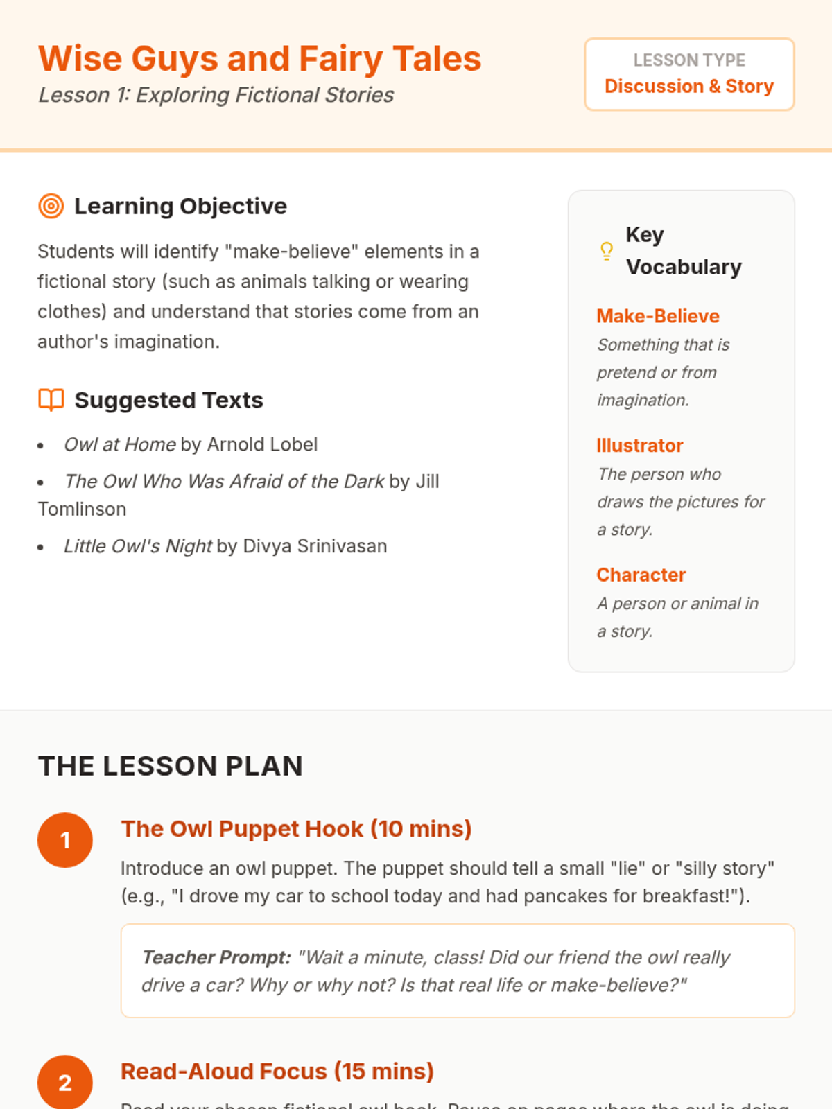A Kindergarten ELA sequence where students compare fictional stories and informational texts using owls as the central theme. Students learn to distinguish between 'make-believe' elements and real-life facts through interactive sorting, visual analysis, and project-based learning.