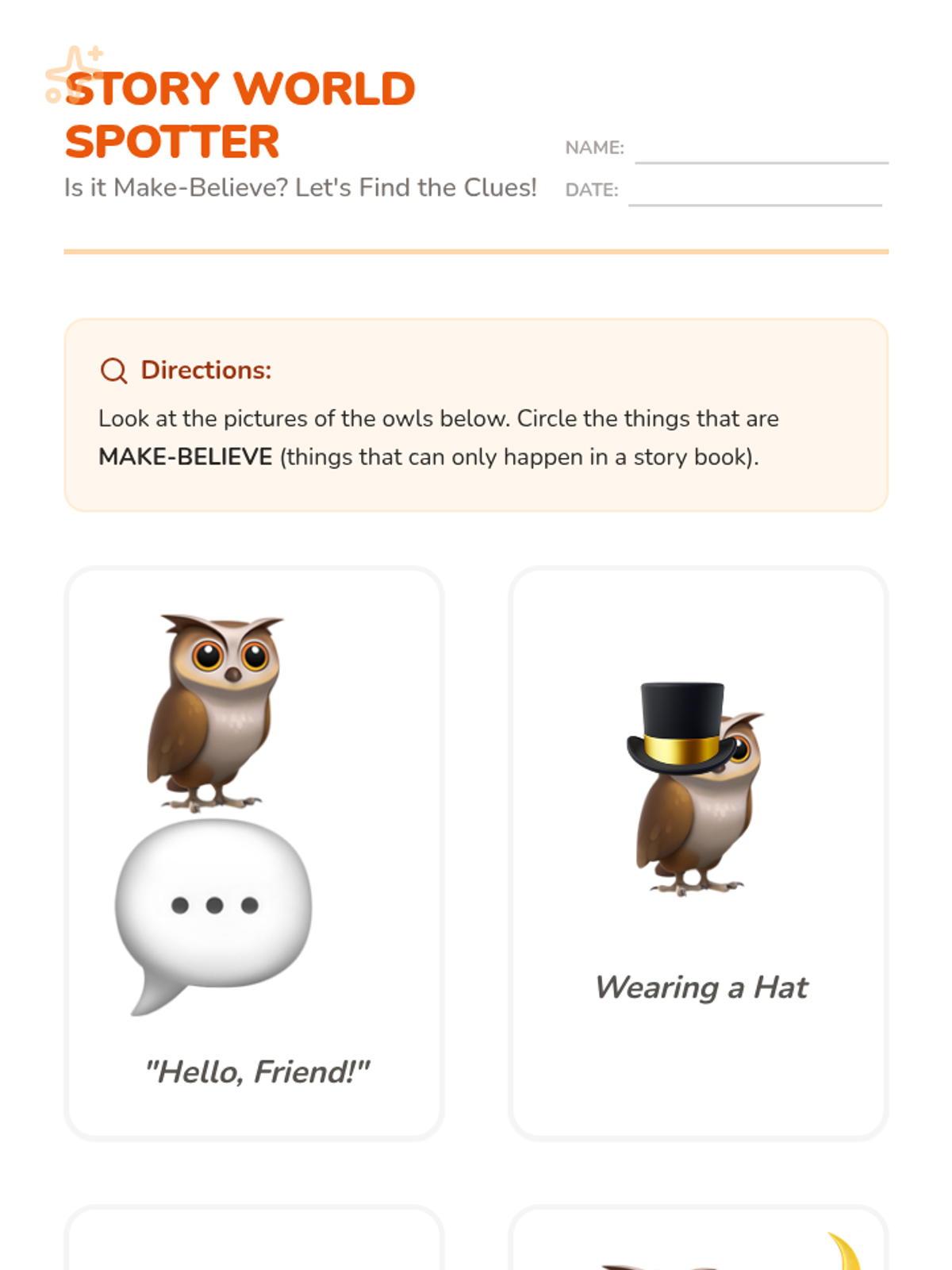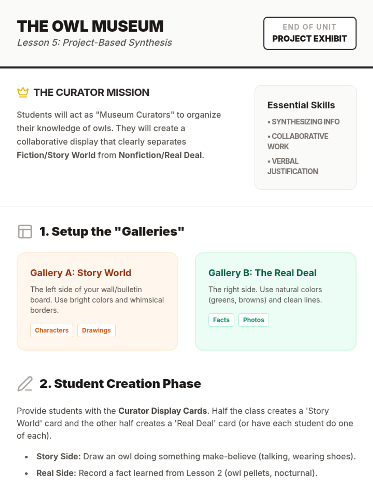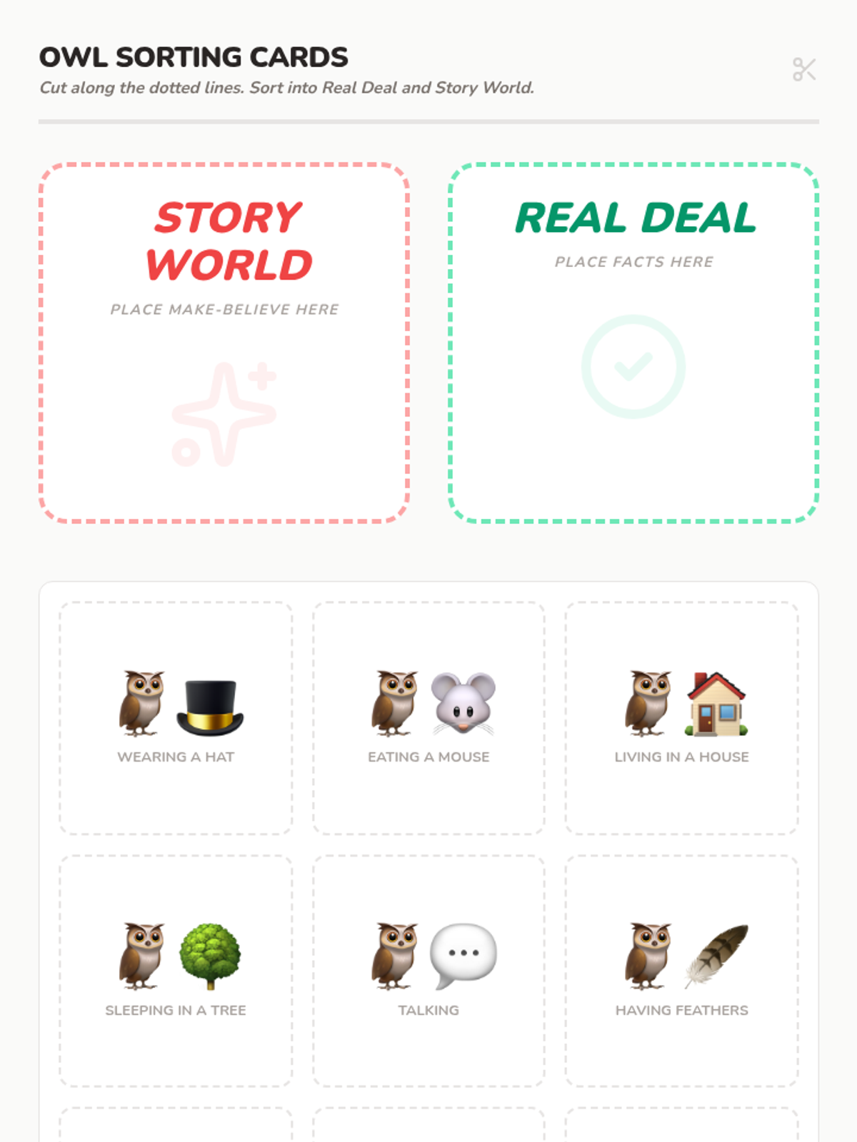A Kindergarten ELA sequence where students compare fictional stories and informational texts using owls as the central theme. Students learn to distinguish between 'make-believe' elements and real-life facts through interactive sorting, visual analysis, and project-based learning.