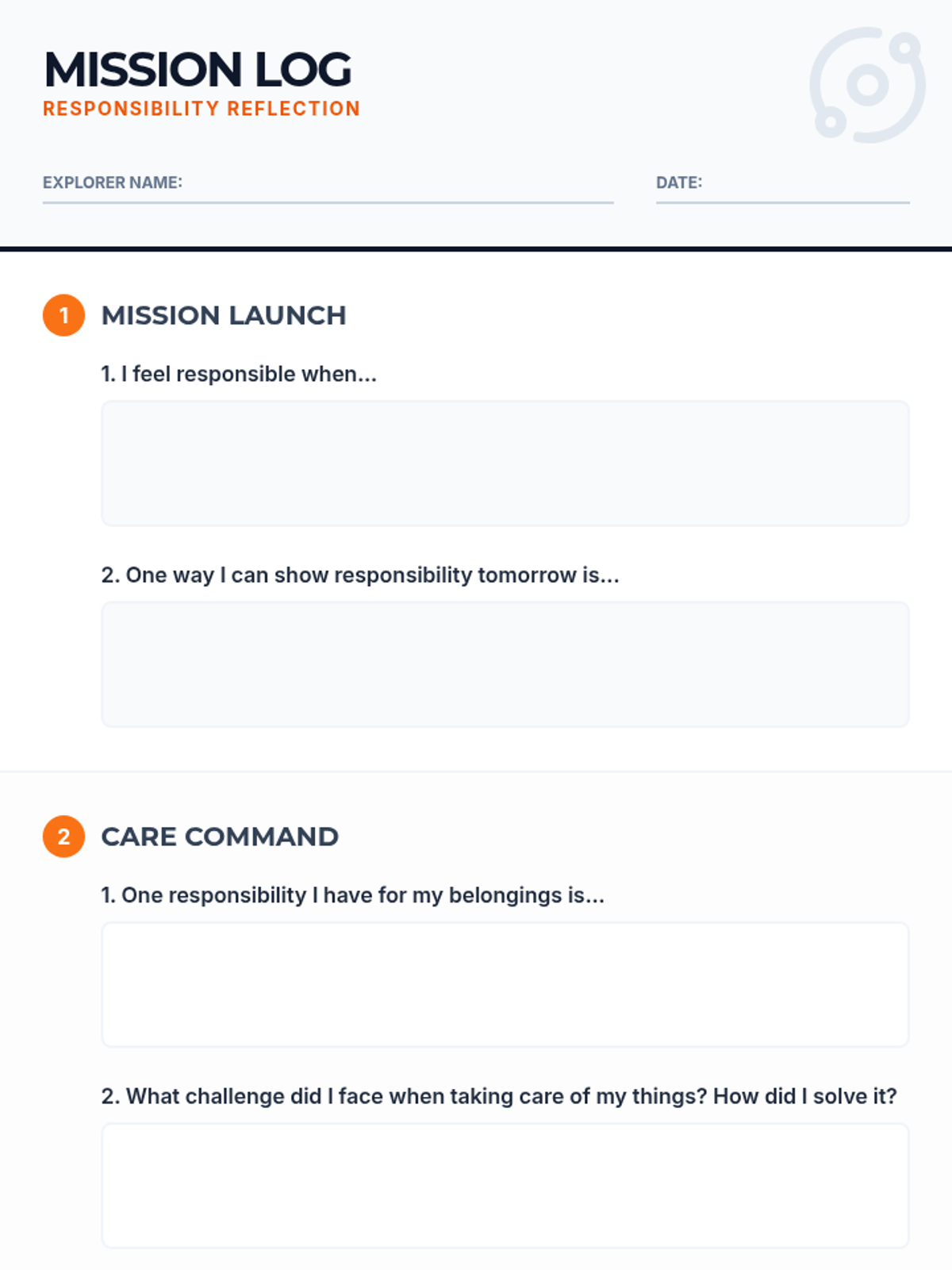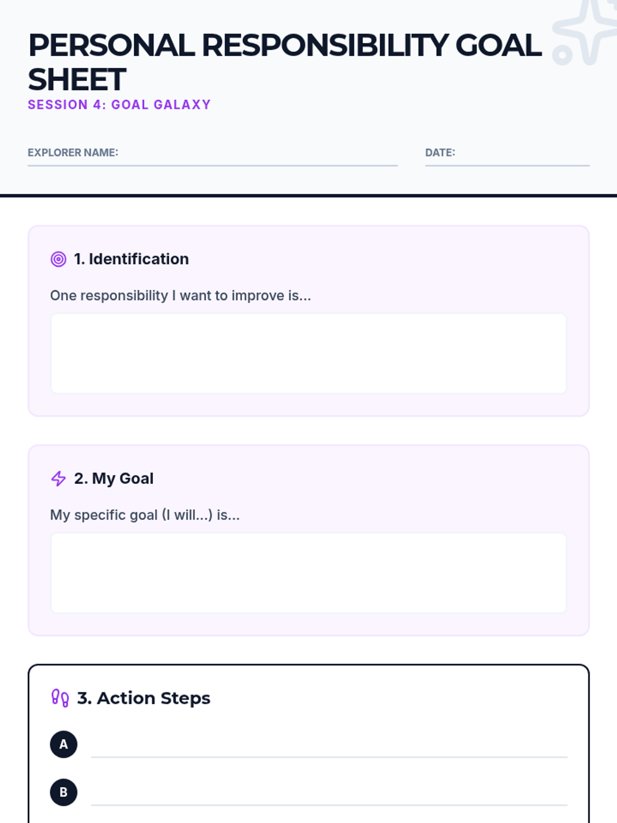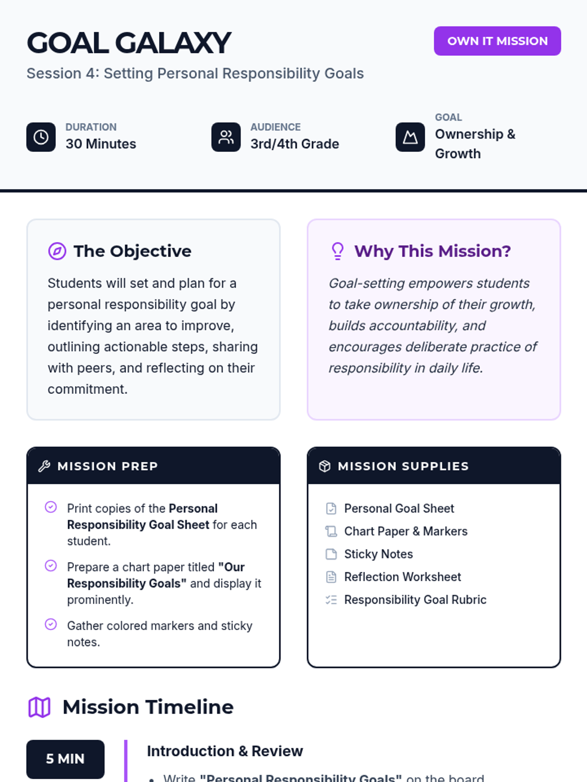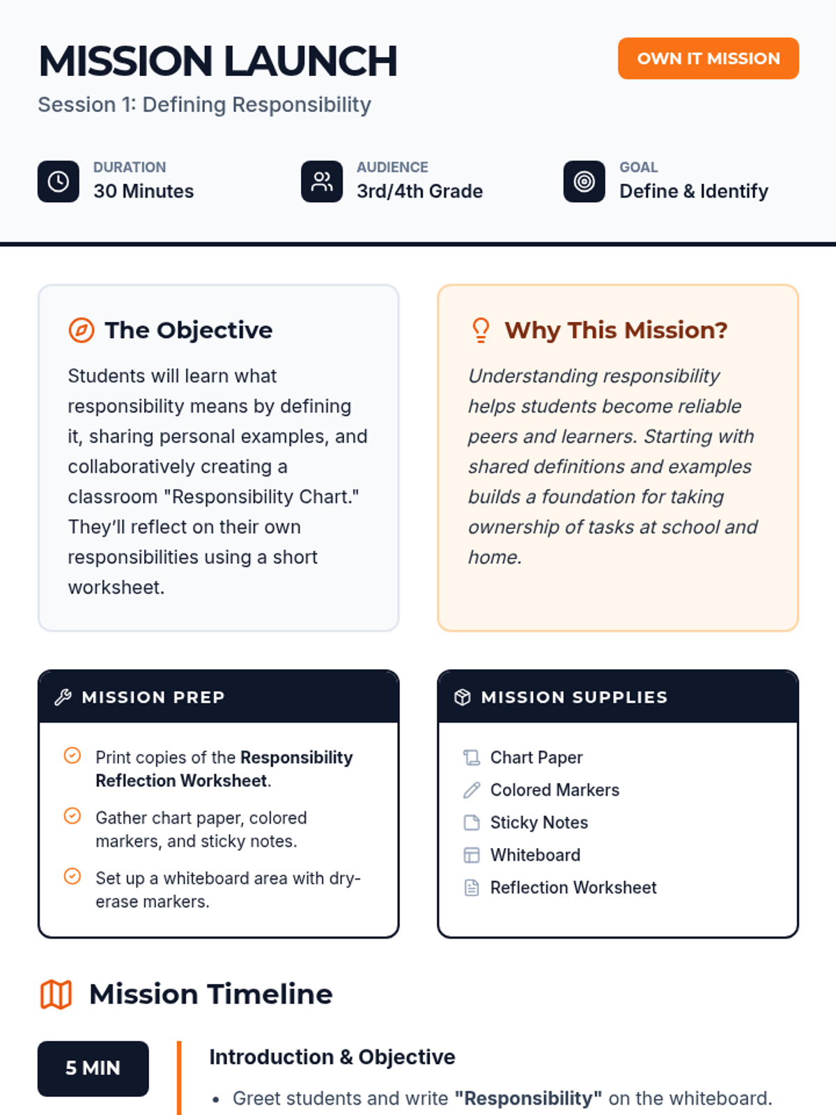 A 4-session mission for 3rd and 4th graders to master the art of responsibility through hands-on activities, group collaboration, and personal goal-setting.