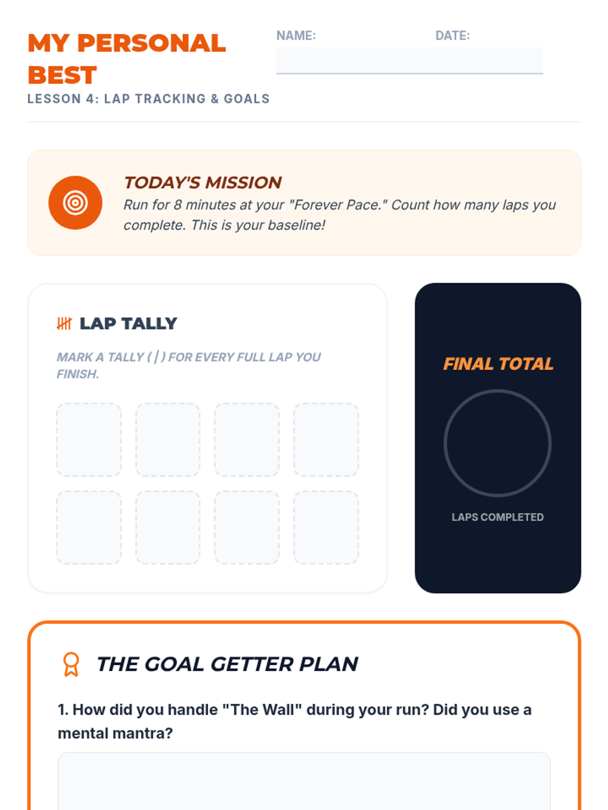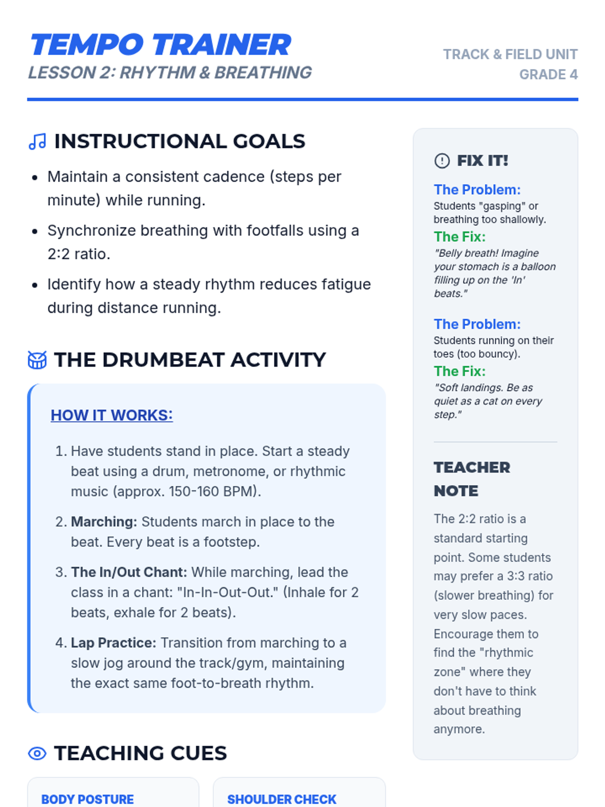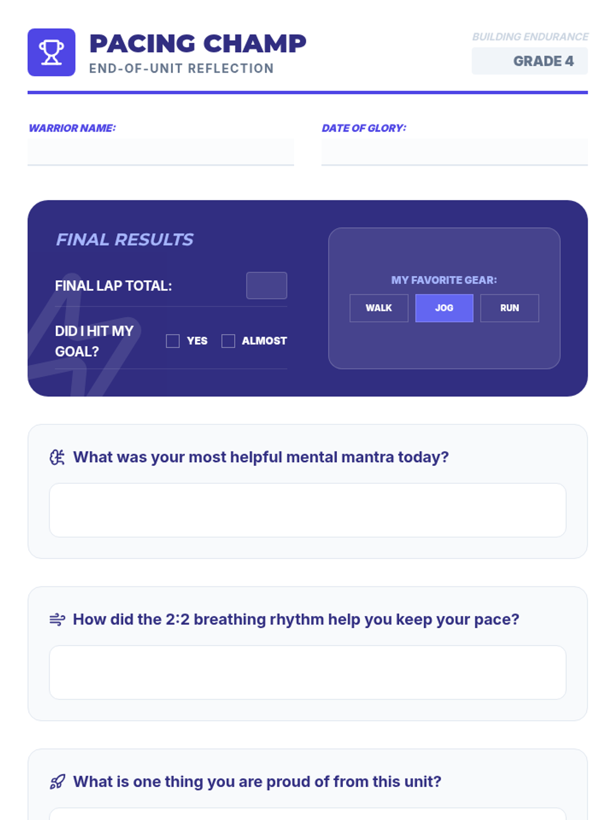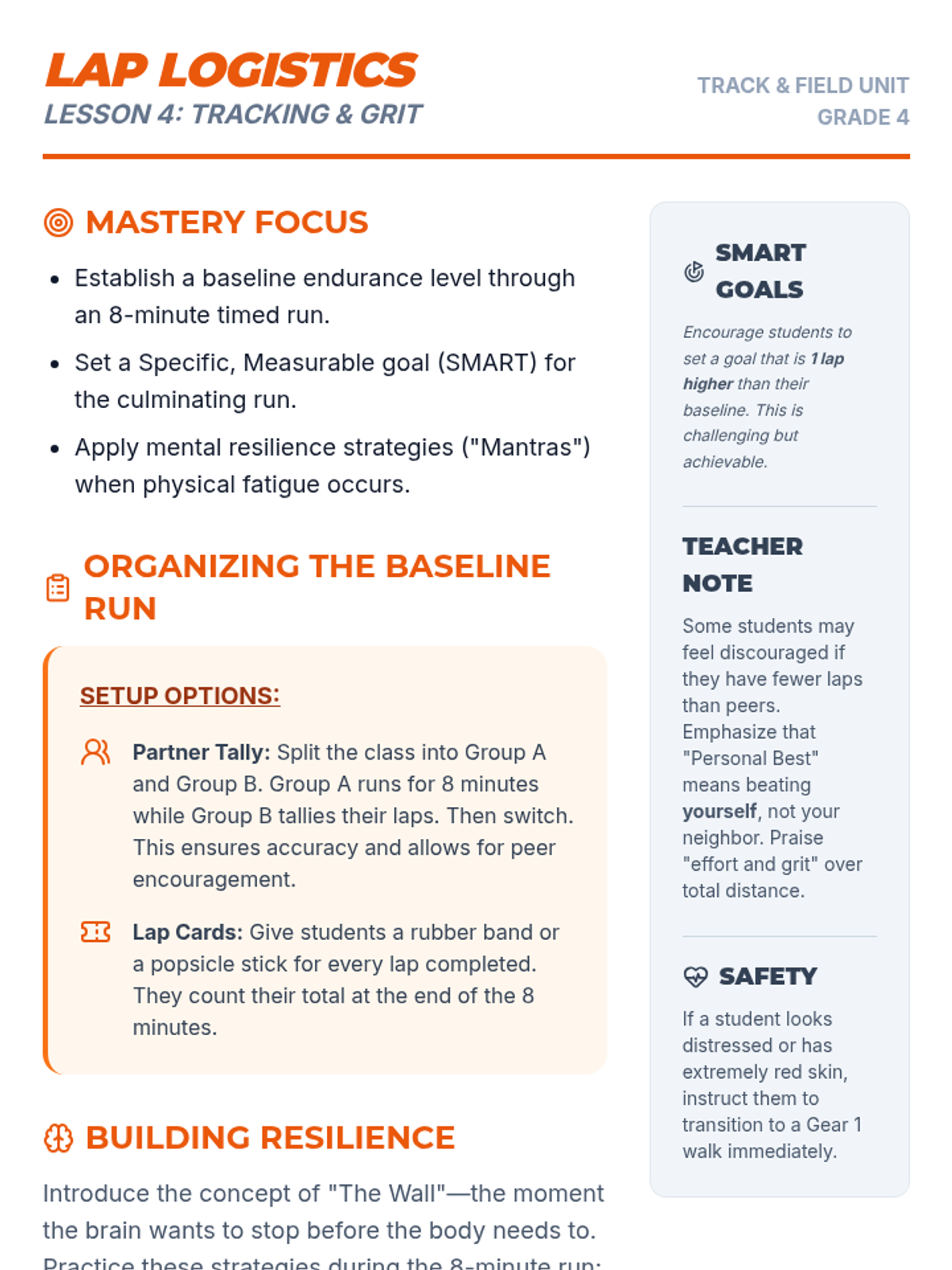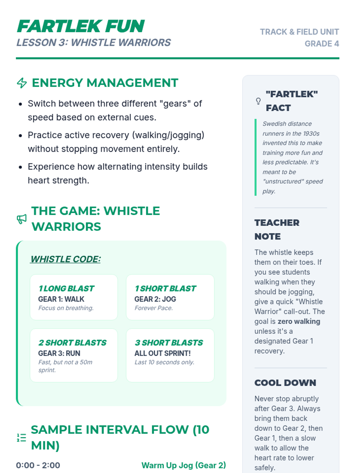 A 5-lesson unit for 4th graders focusing on the difference between anaerobic sprinting and aerobic endurance. Students learn to regulate energy through pacing, rhythm, and interval training, culminating in a goal-setting endurance run.