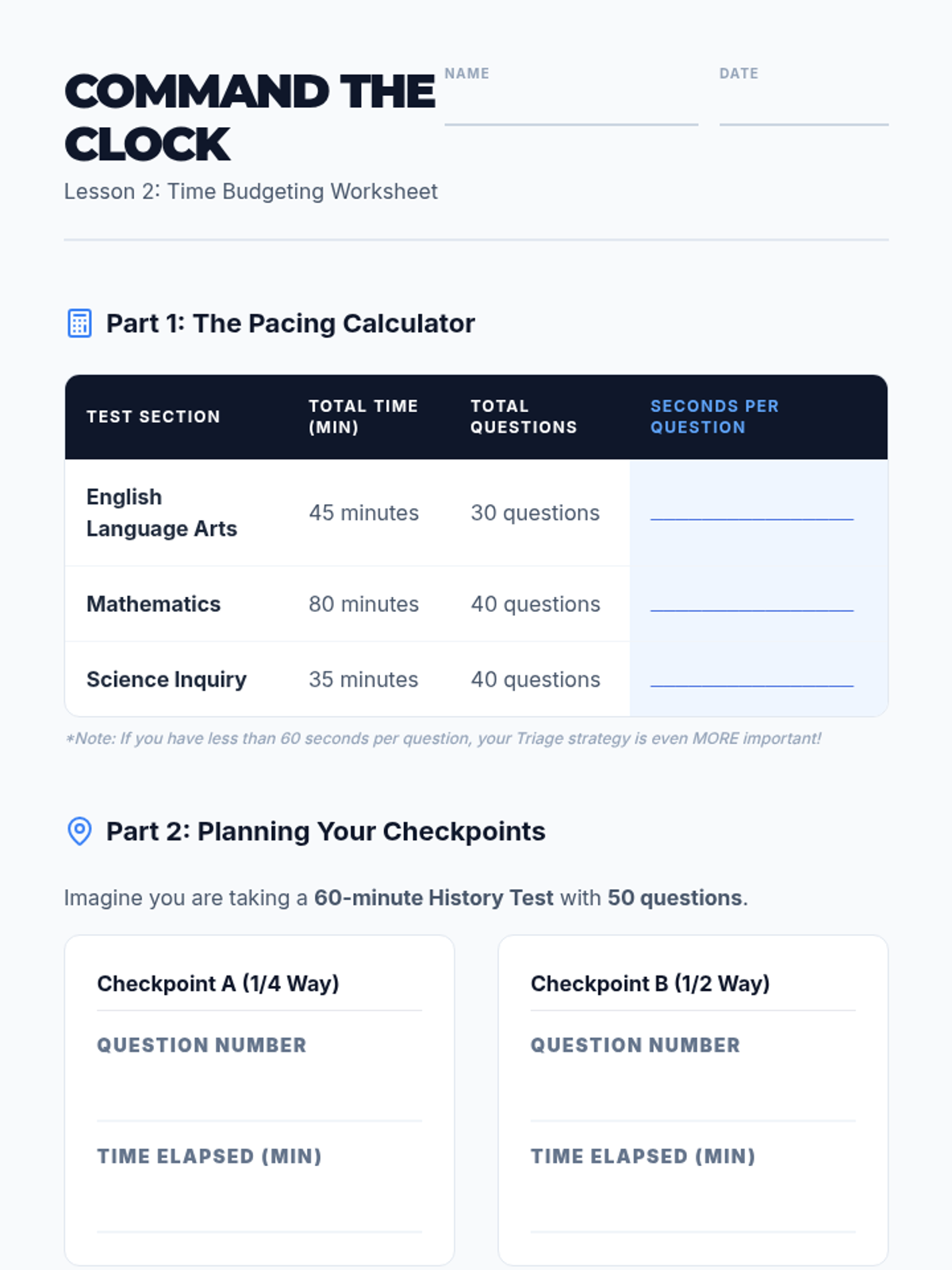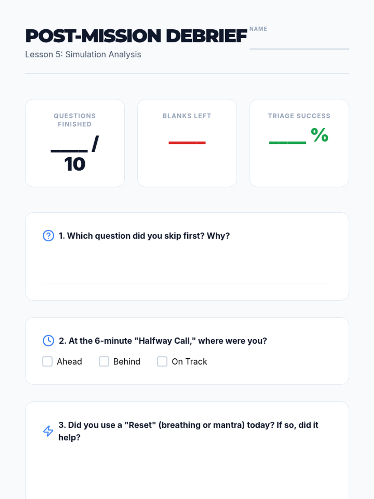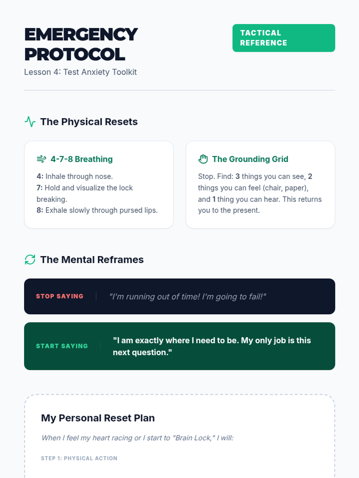 A comprehensive sequence designed for 9th-grade ESL students to master time management, prioritization, and stress-reduction techniques for high-stakes standardized testing. Students learn the 'Triage' method, time budgeting, strategic guessing, and physiological anxiety resets through active simulations.