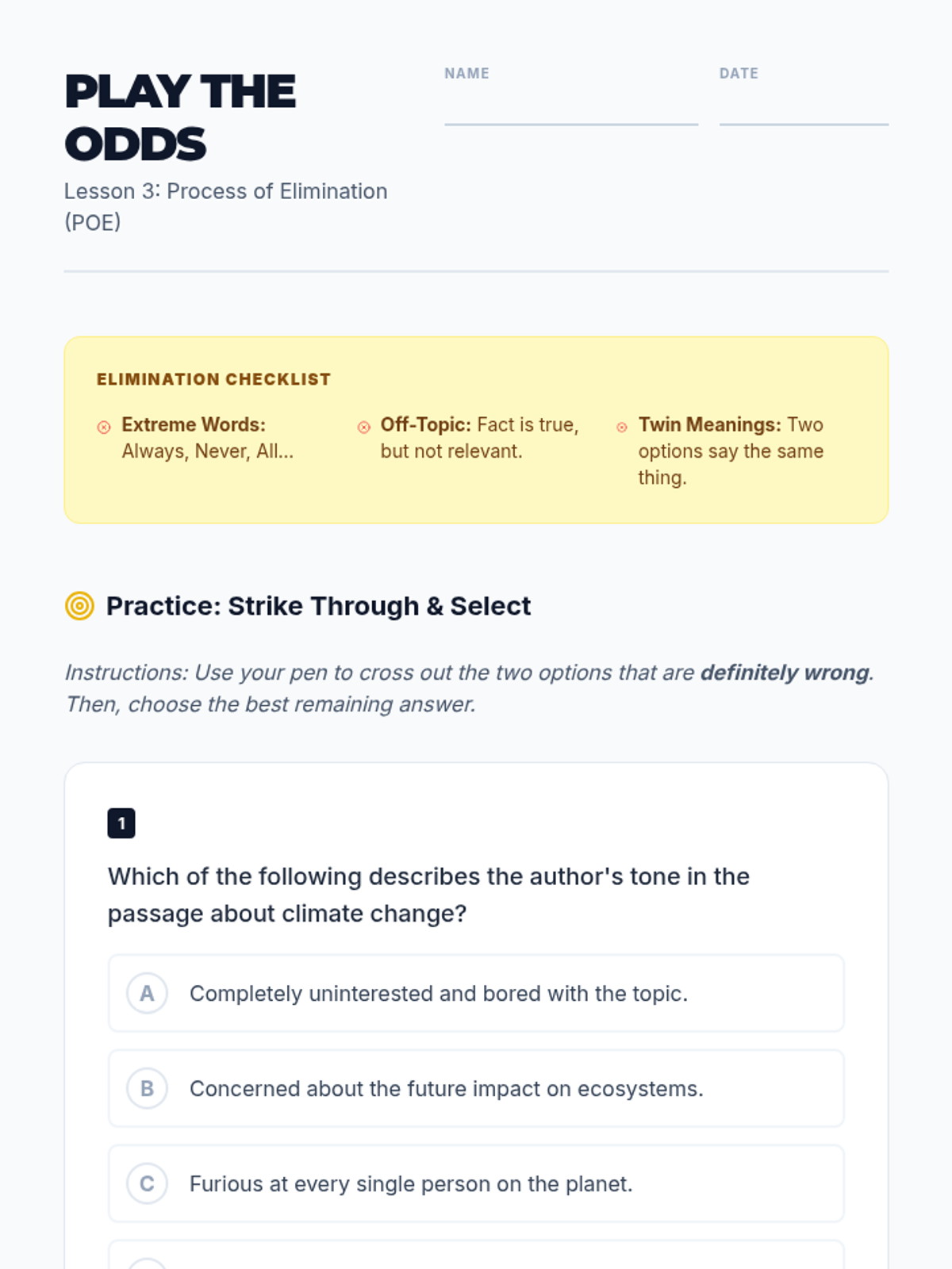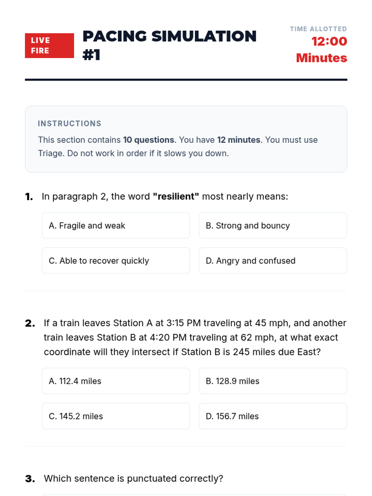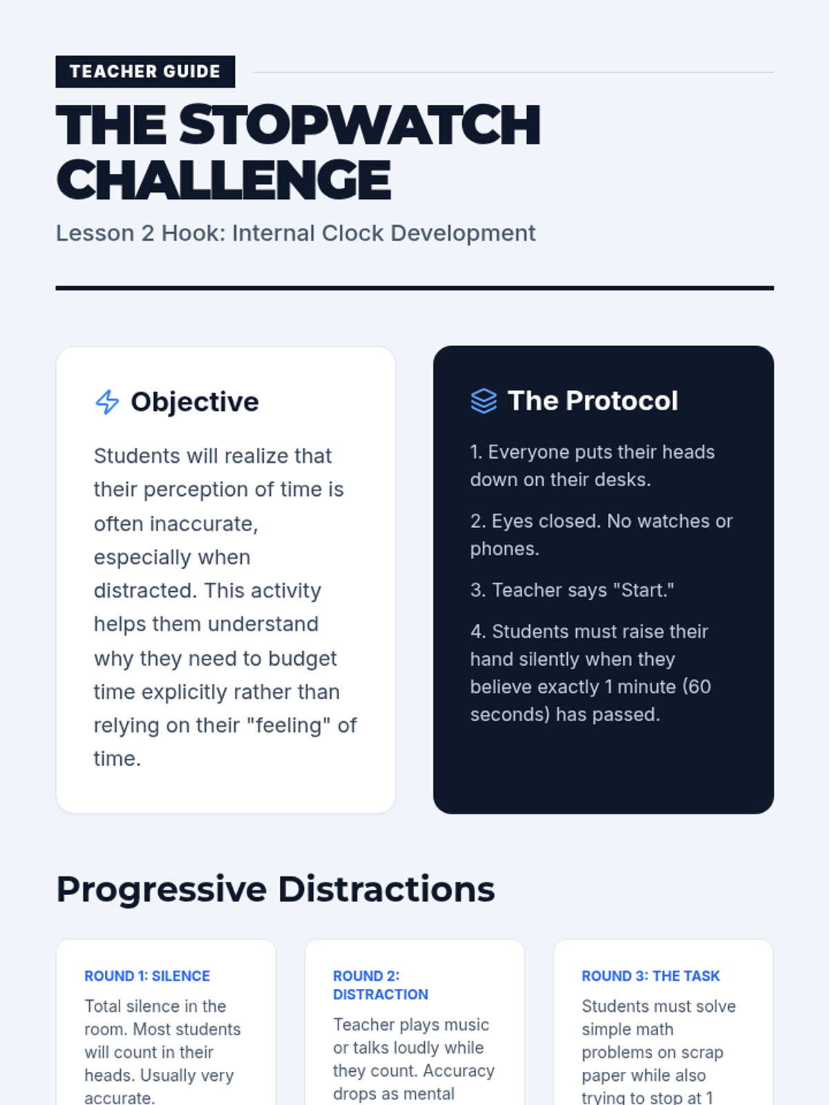 A comprehensive sequence designed for 9th-grade ESL students to master time management, prioritization, and stress-reduction techniques for high-stakes standardized testing. Students learn the 'Triage' method, time budgeting, strategic guessing, and physiological anxiety resets through active simulations.