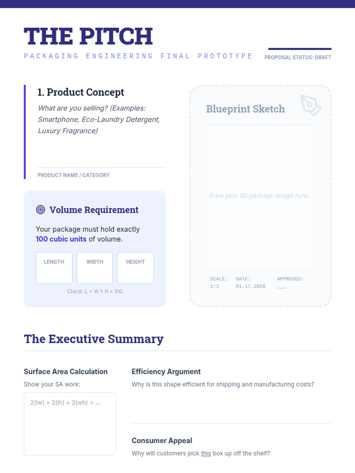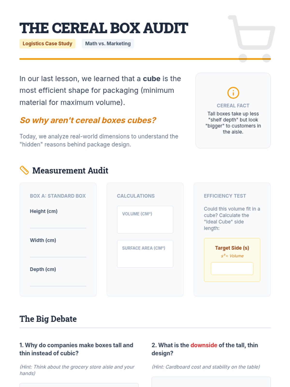 A 5th-grade geometry sequence exploring volume and surface area through the lens of packaging engineering. Students investigate optimization, real-world constraints, and design prototypes.