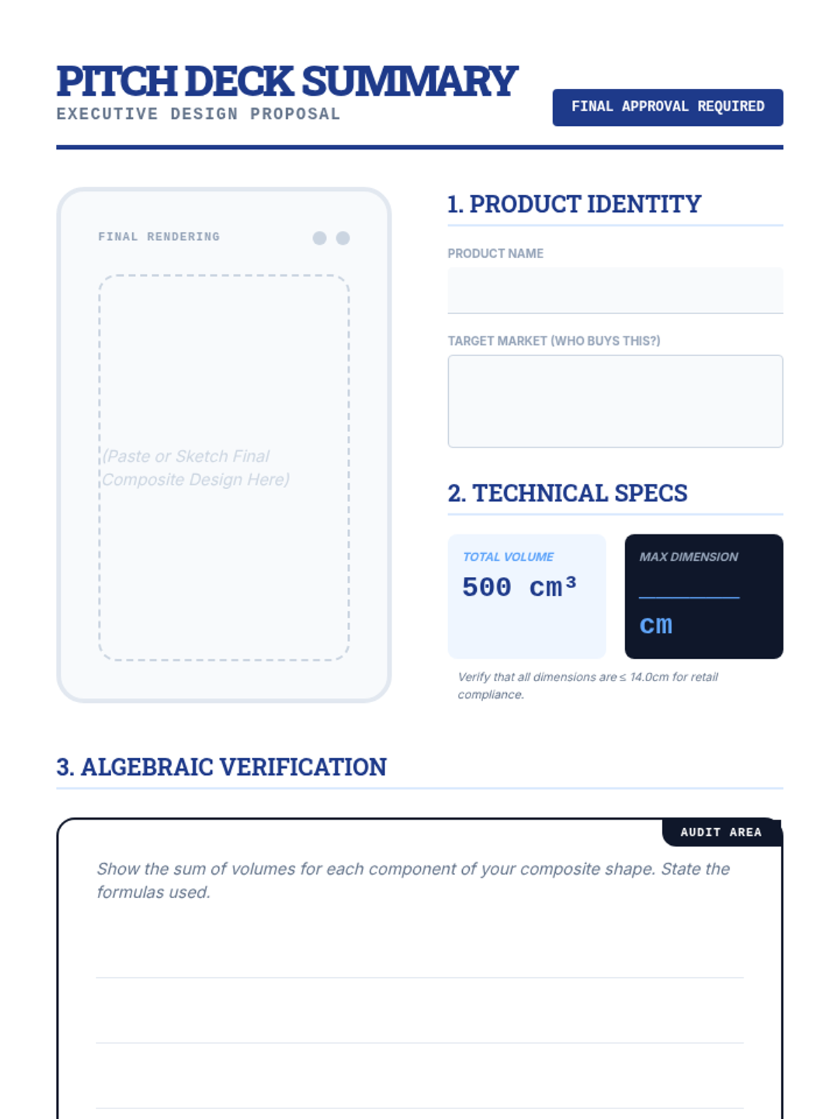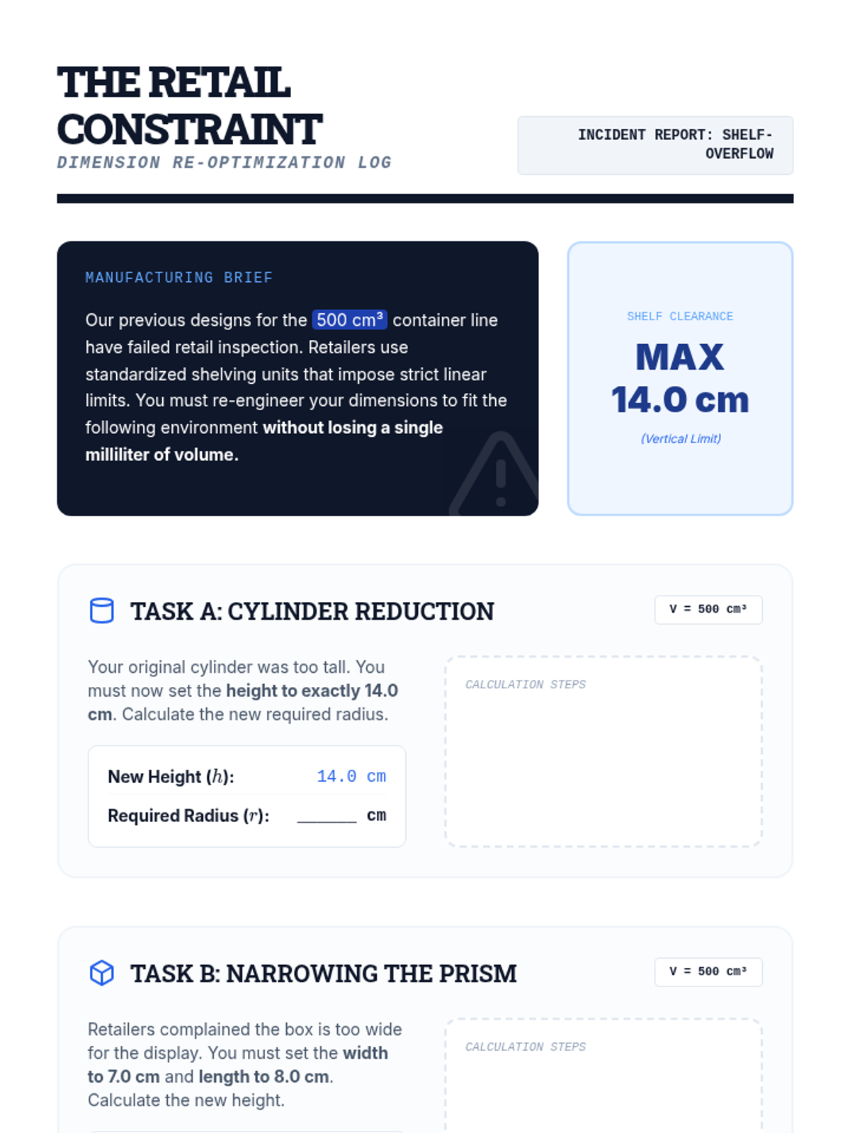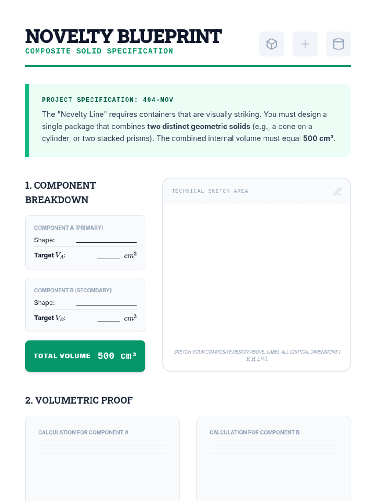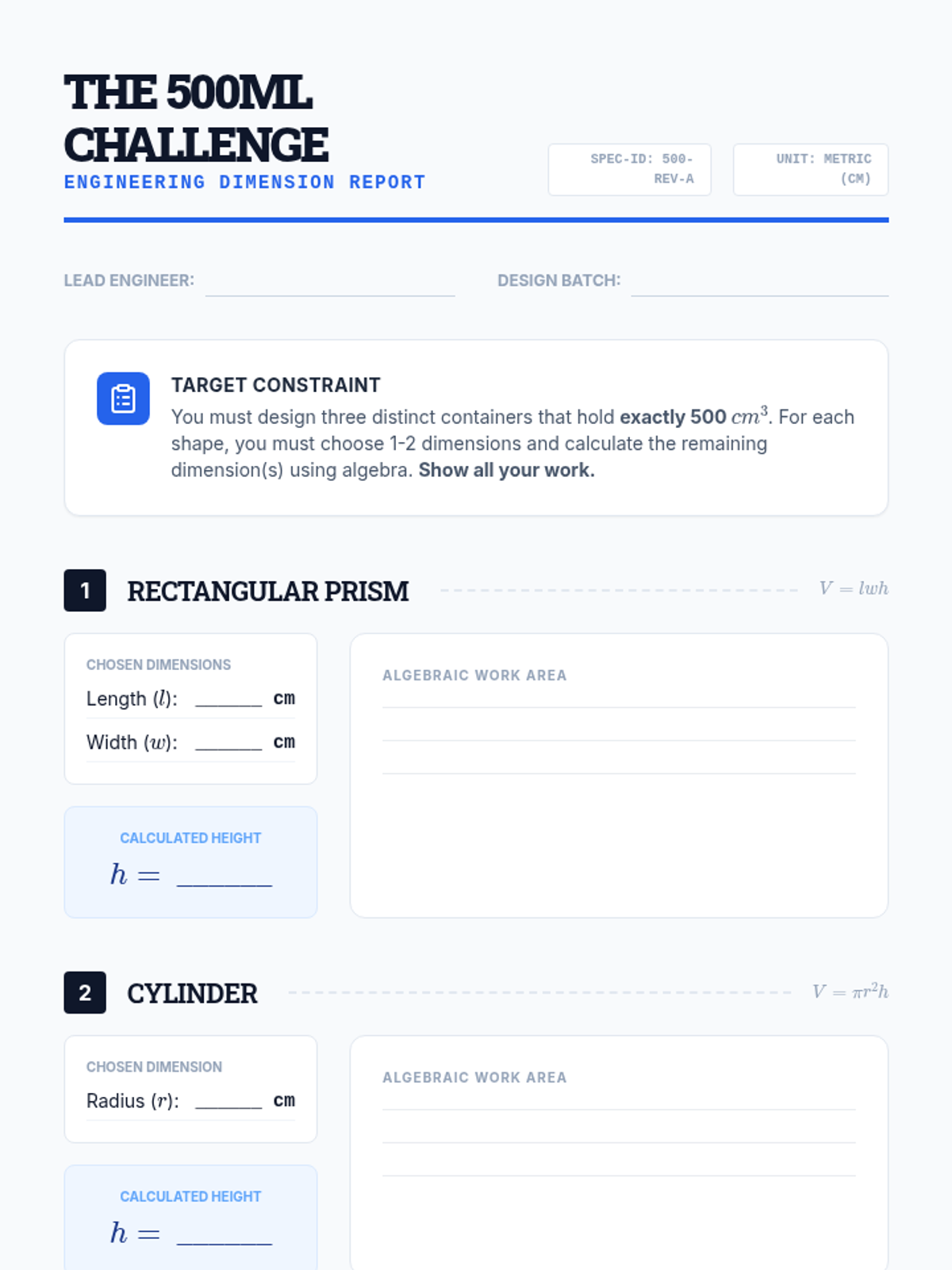A project-based geometry sequence where 10th-grade students act as packaging engineers. Students apply volume formulas for prisms, cylinders, cones, and composite solids to design efficient containers while navigating real-world constraints like shelf space and headspace.
