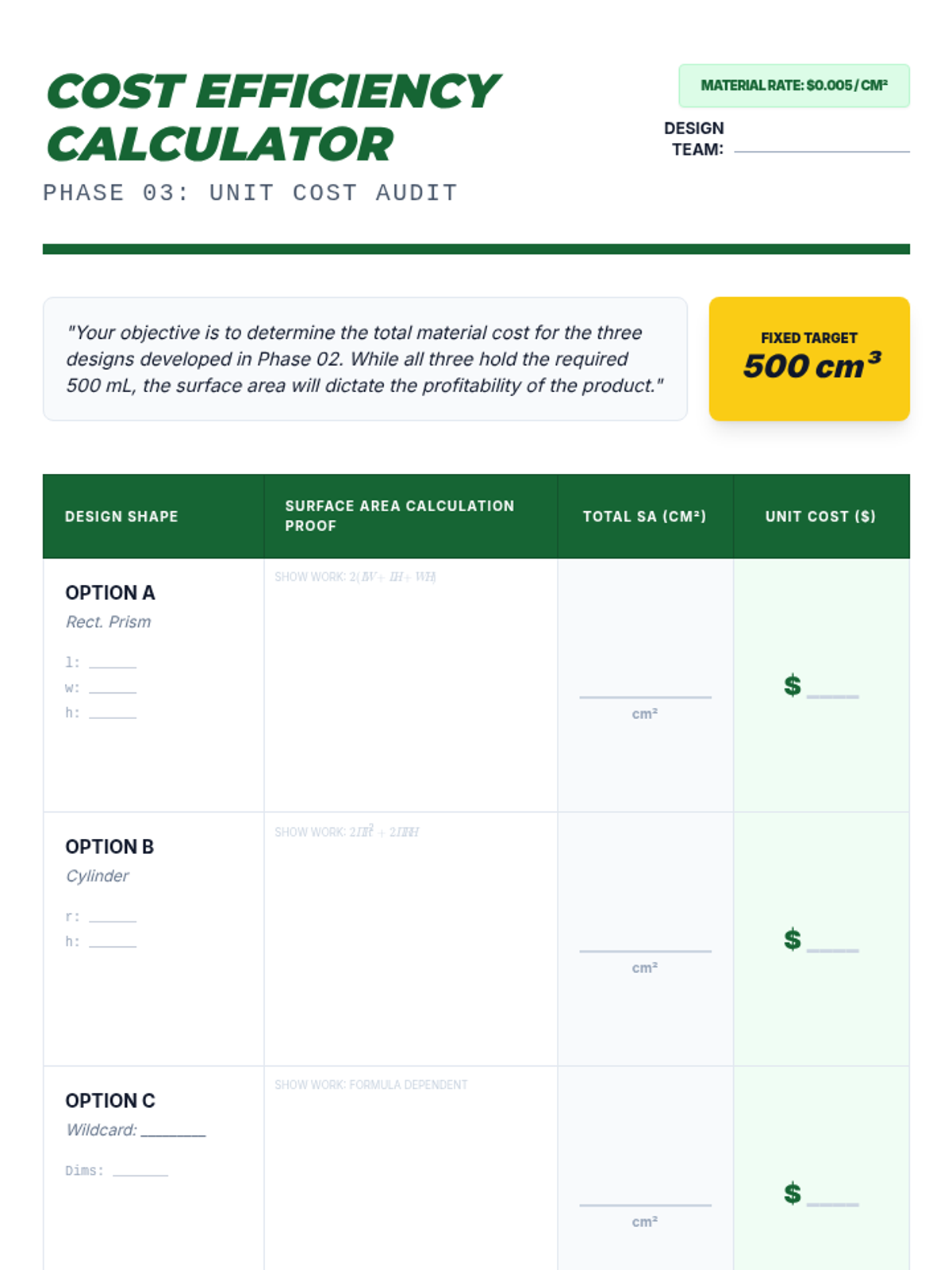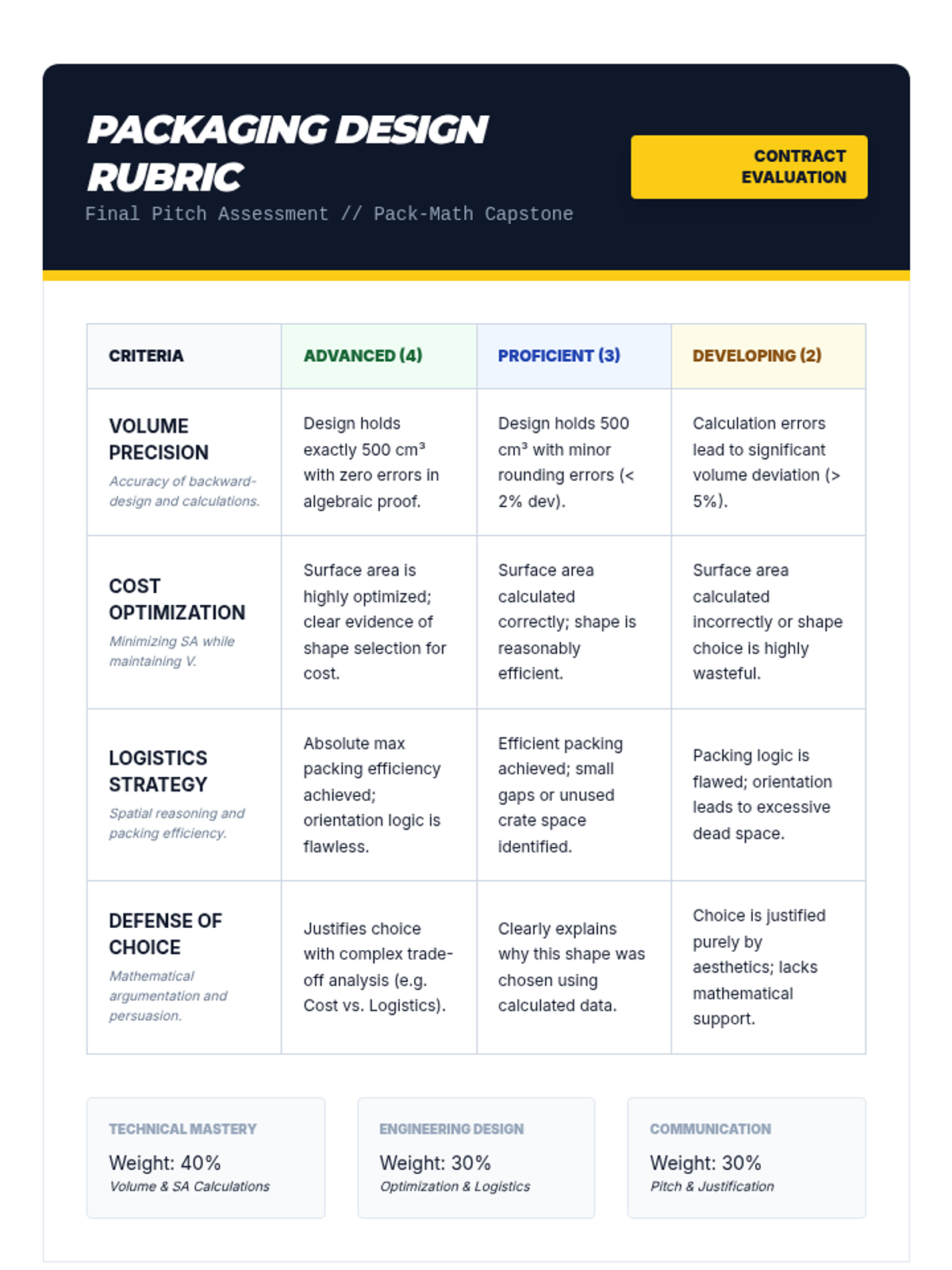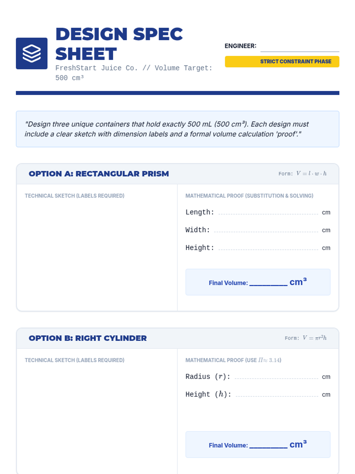 A capstone project where 9th-grade students act as packaging engineers, designing containers that balance volume requirements, surface area costs, and shipping logistics. Students move from analyzing real-world packaging to creating and pitching their own mathematically optimized designs.