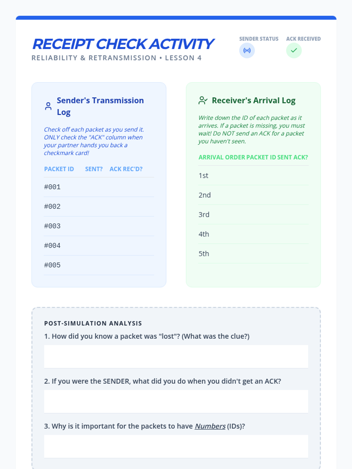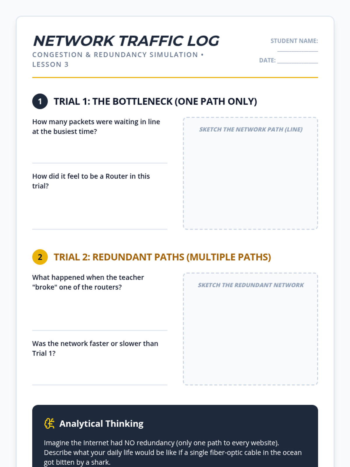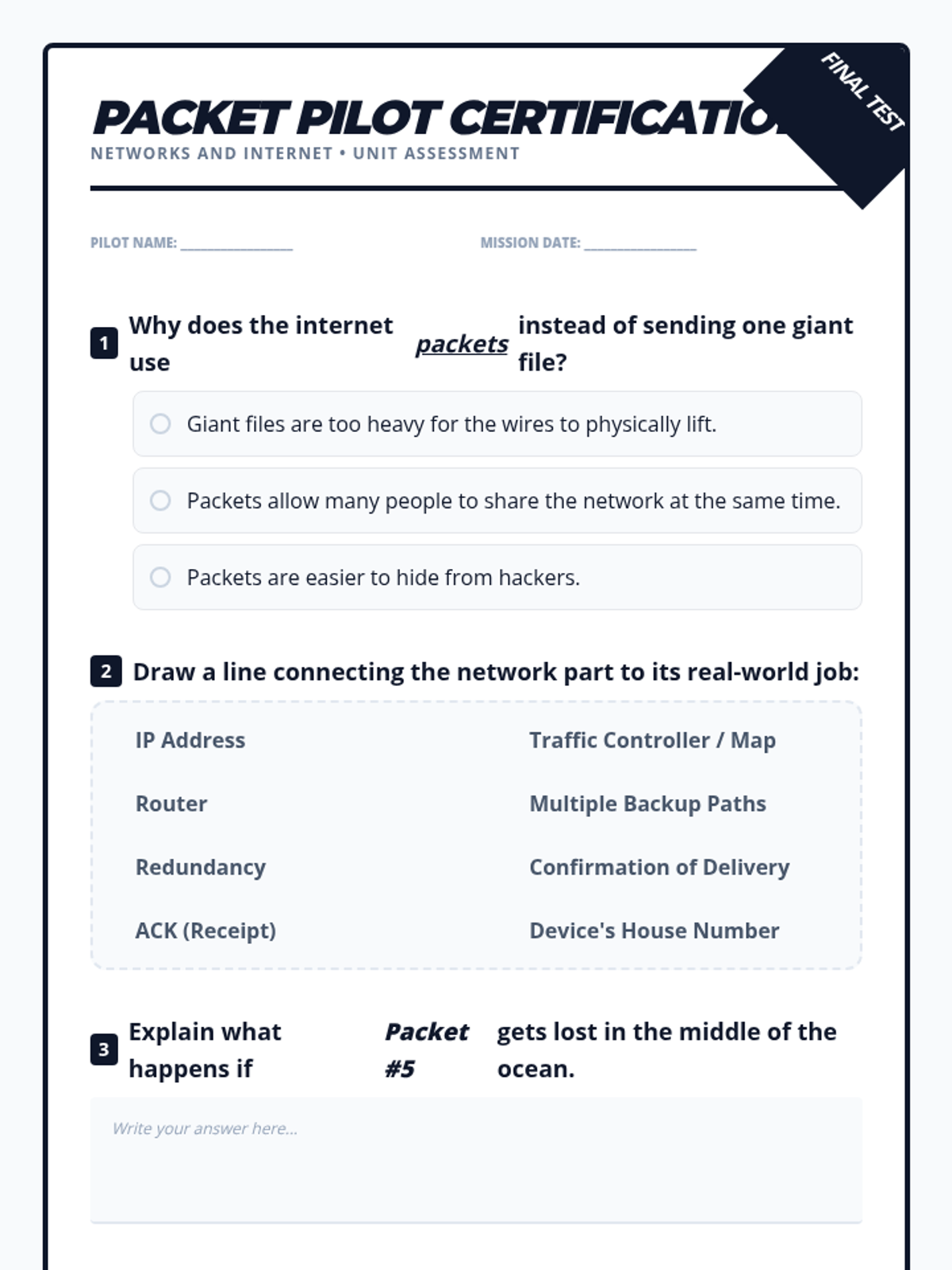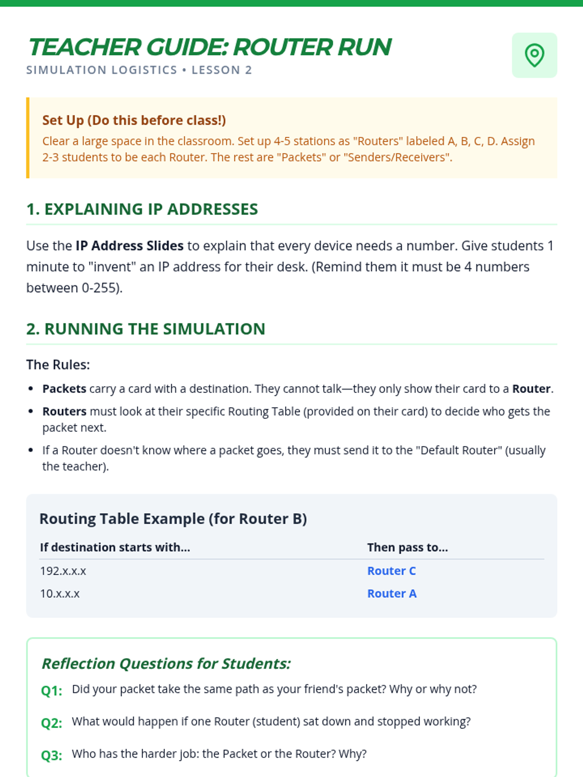 Students demystify how information travels across the internet by breaking it down into small chunks called packets. Through physical simulations and role-playing, they experience routing, congestion, and packet loss firsthand.