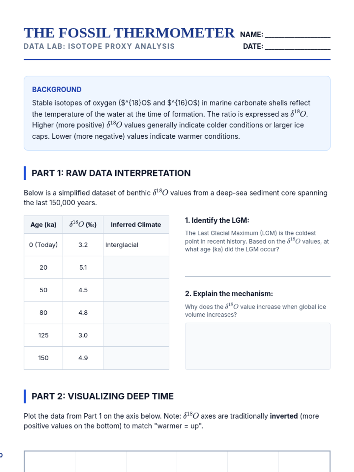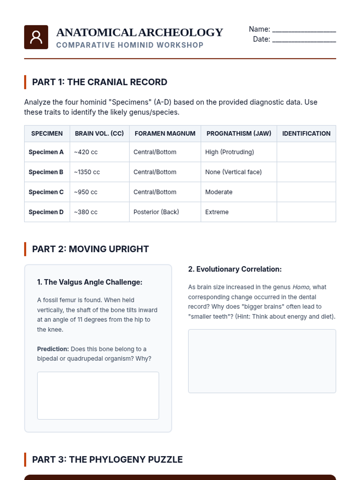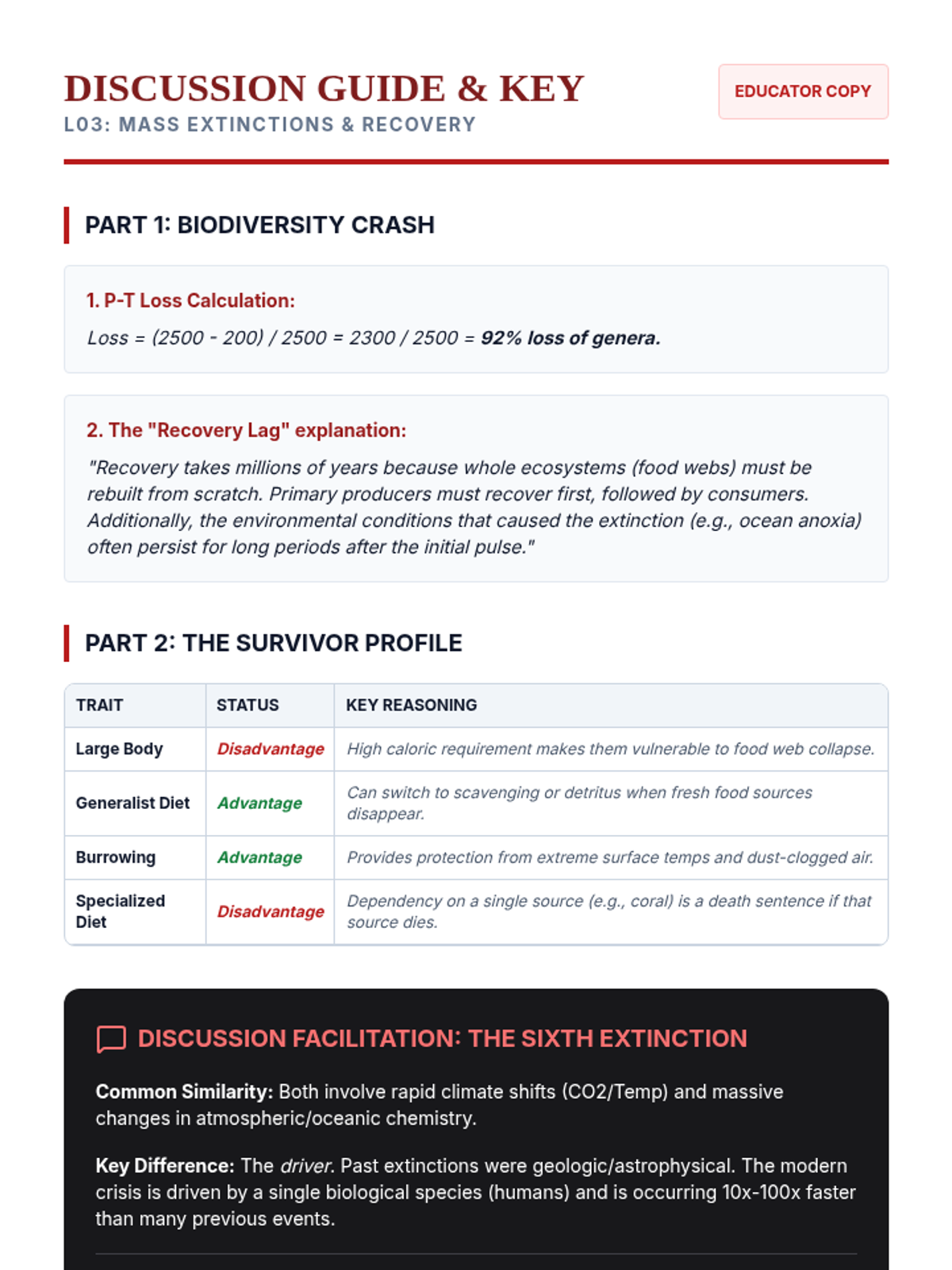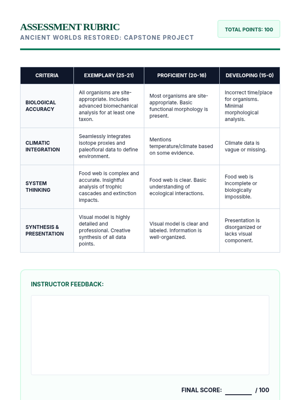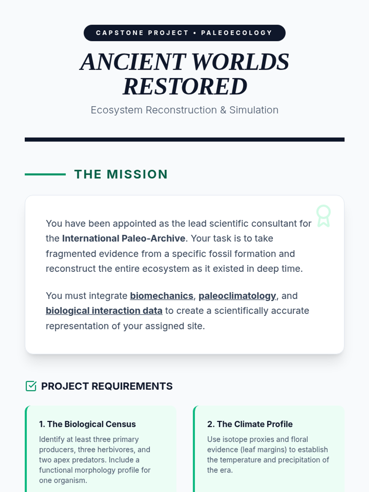 A high-level paleoecology sequence for 12th graders focusing on interpreting fossils as biological and environmental data. Students explore functional morphology, isotopic climate proxies, extinction dynamics, and hominid evolution to reconstruct ancient worlds.