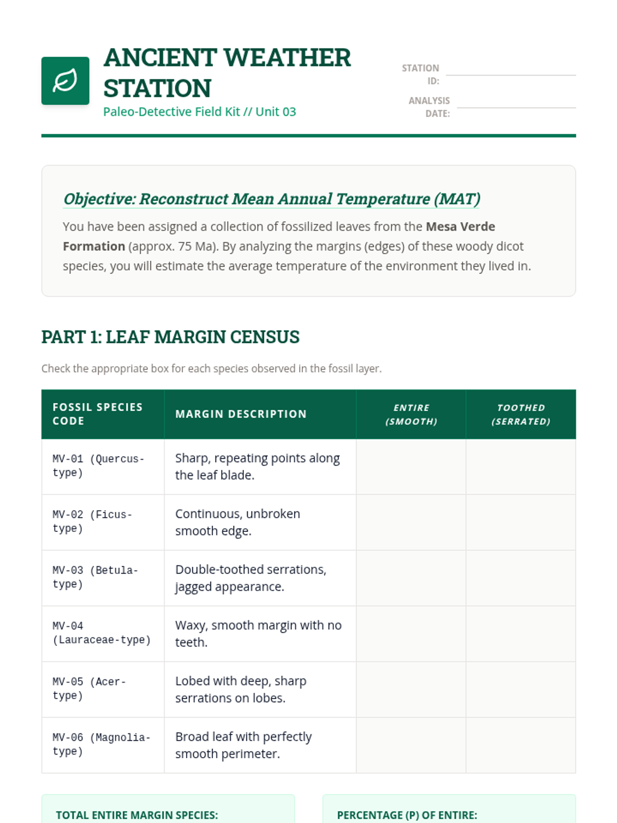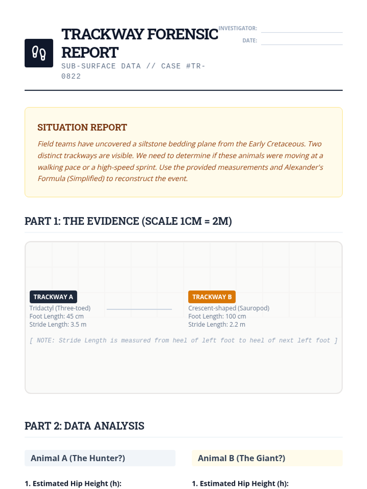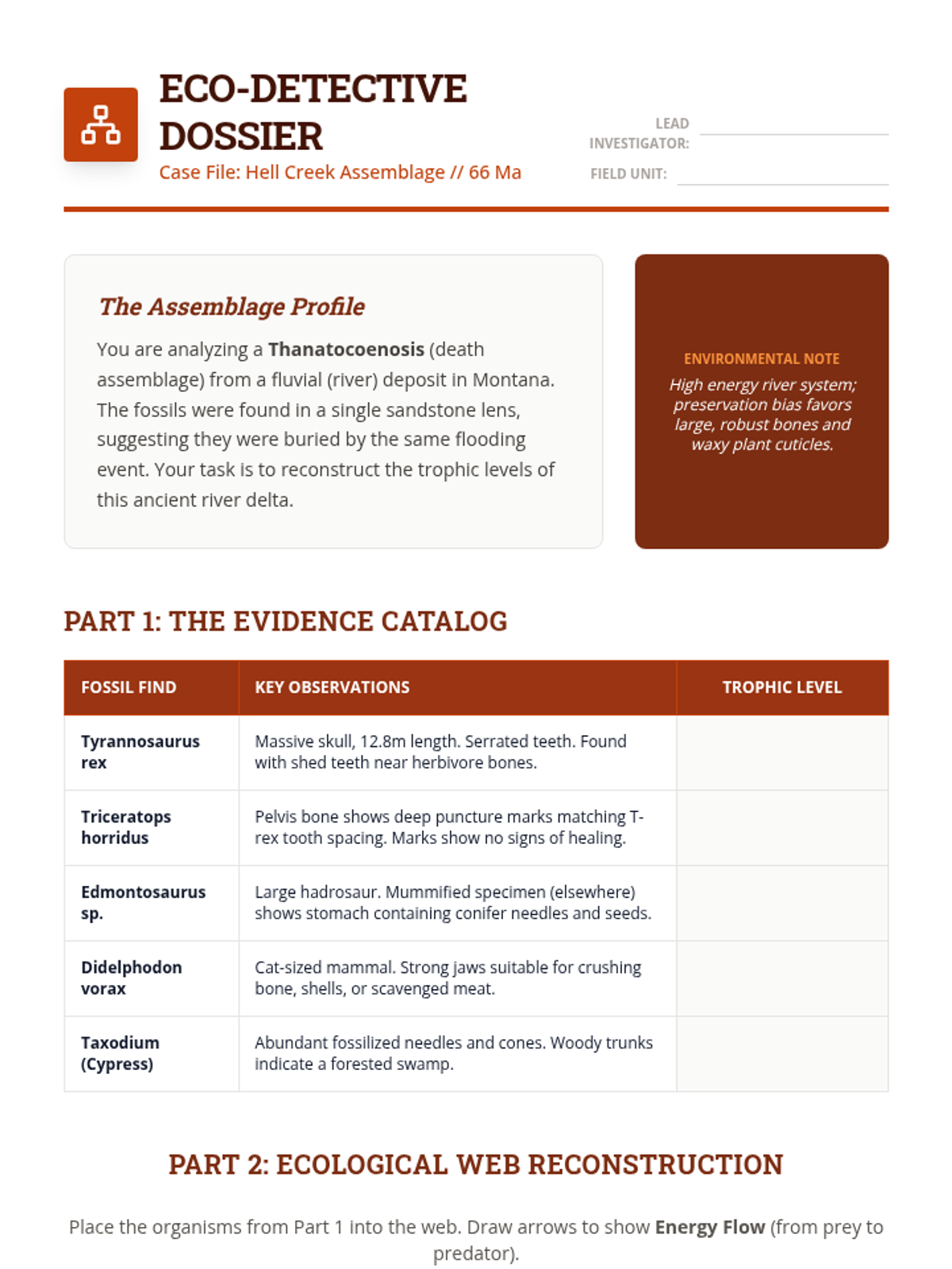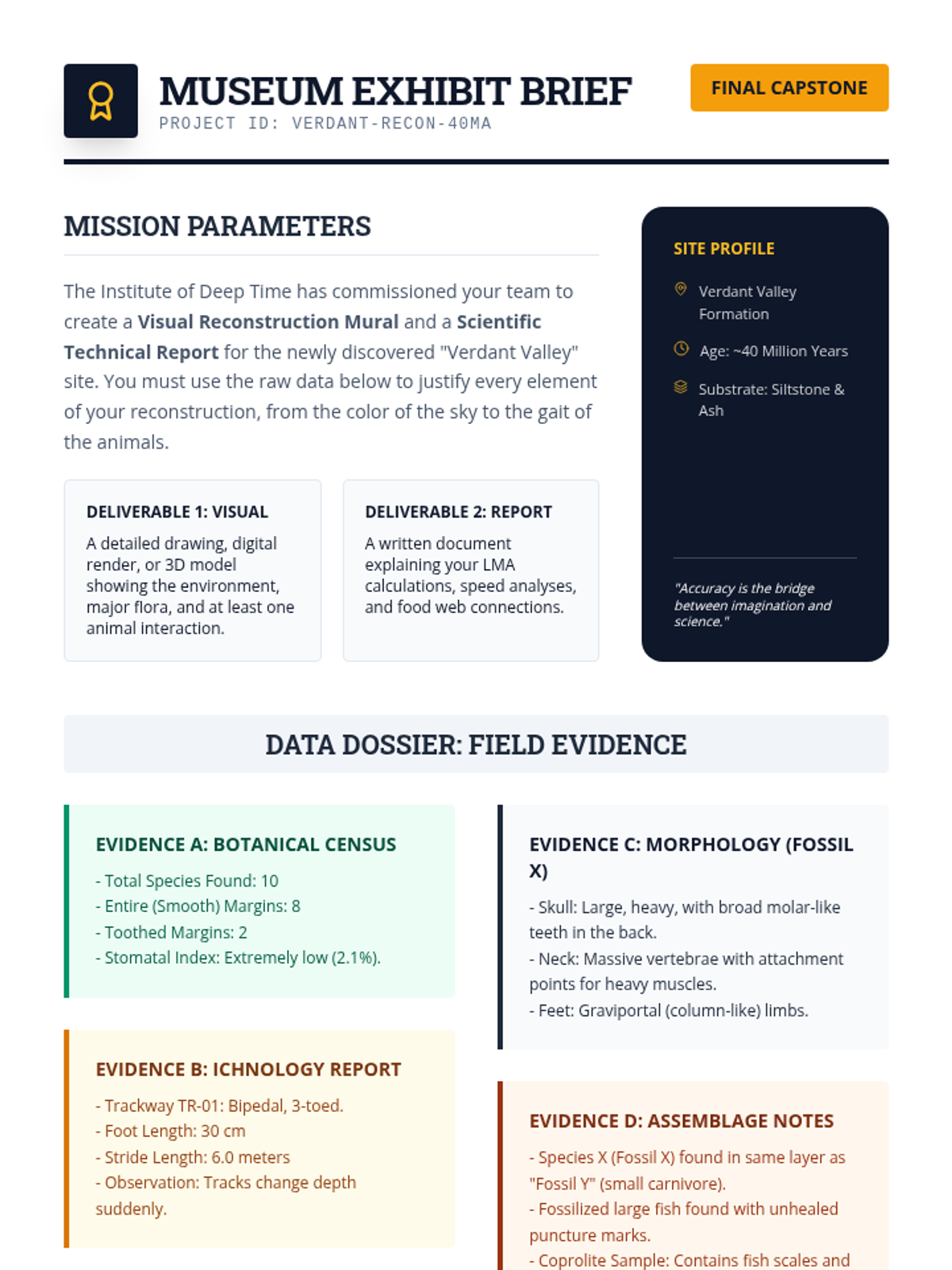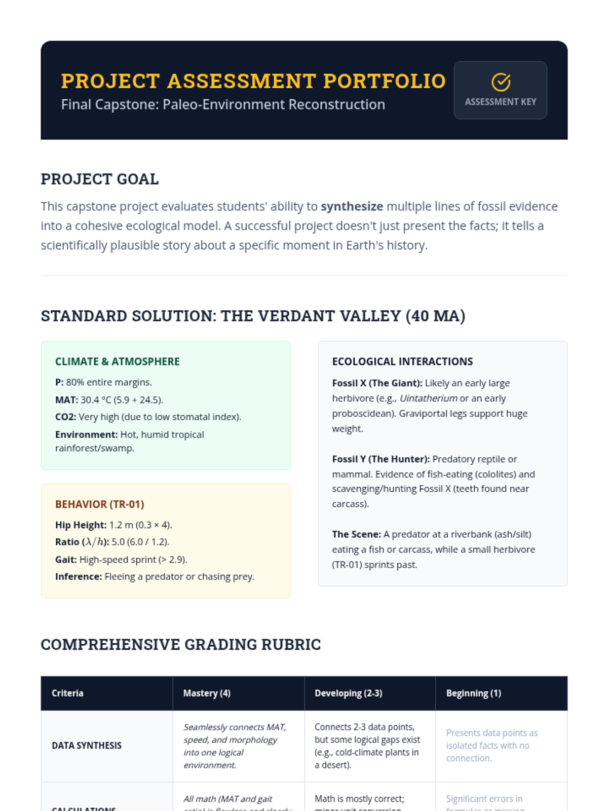 A 10th-grade project-based sequence exploring paleoecology. Students analyze fossil morphology, trace fossils, and plant proxies to reconstruct ancient environments, culminating in a comprehensive paleo-reconstruction project.