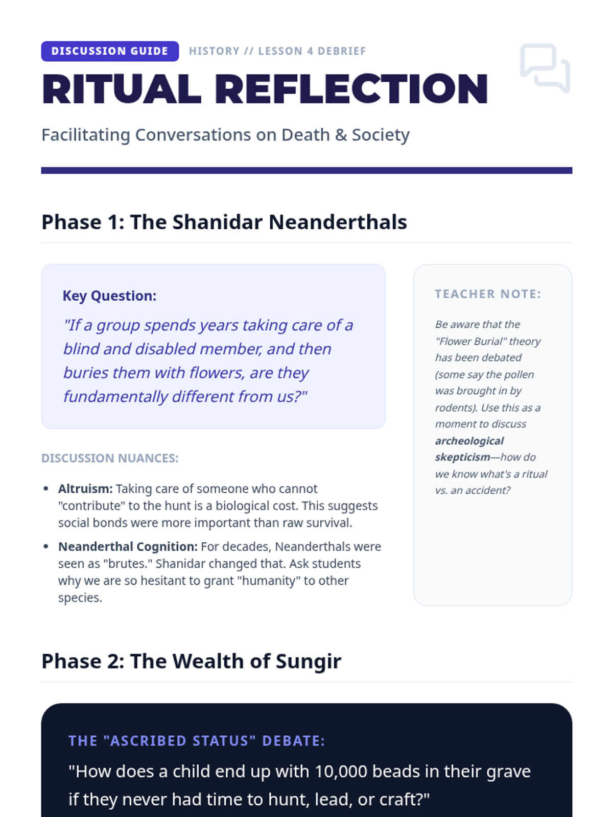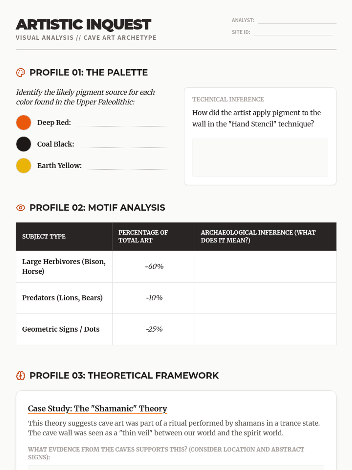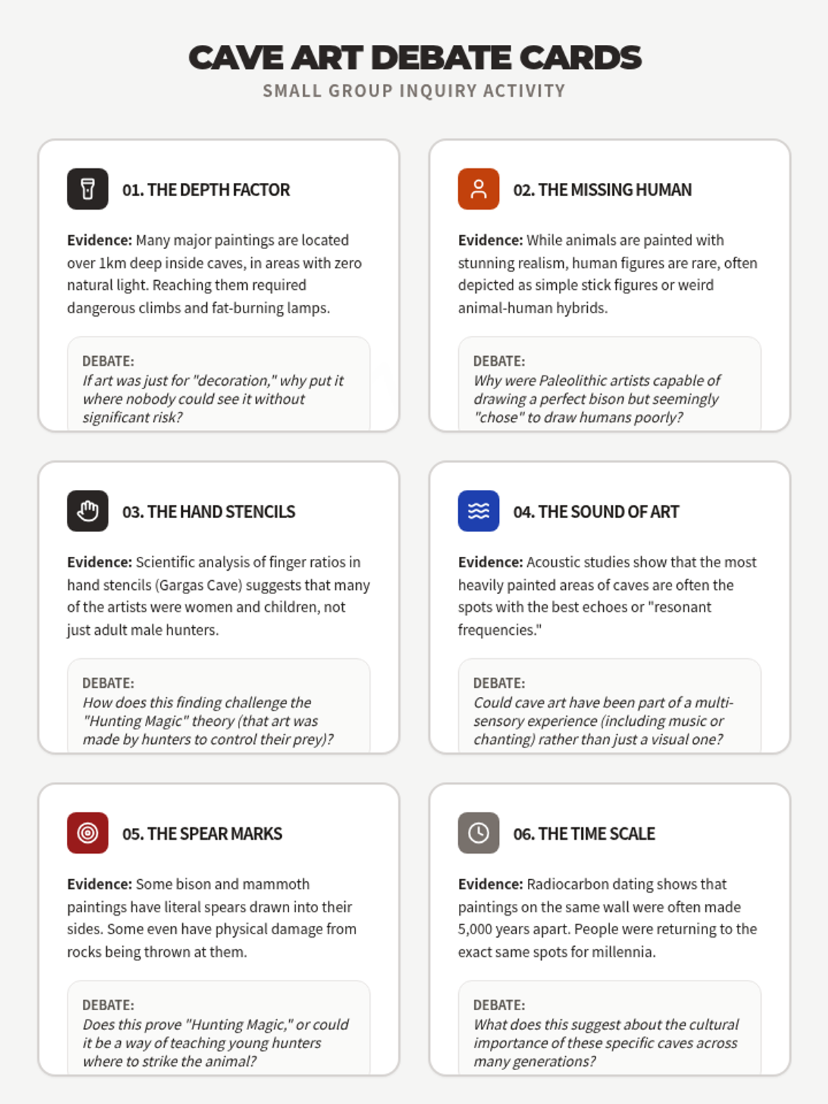 A comprehensive 10th-grade history sequence exploring the cognitive and cultural evolution of Paleolithic humans through their tools, art, and rituals. Students analyze the transition from survival technology to symbolic expression and spiritual belief.