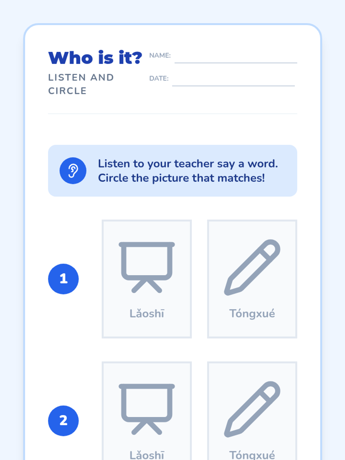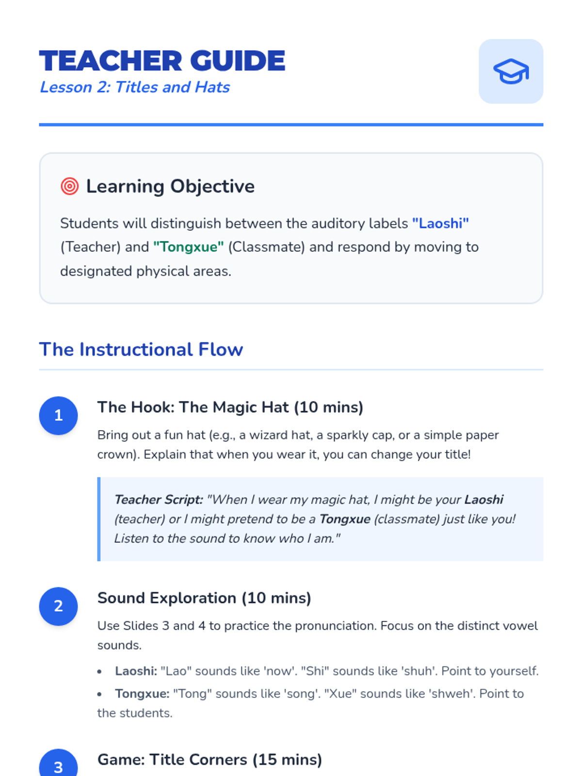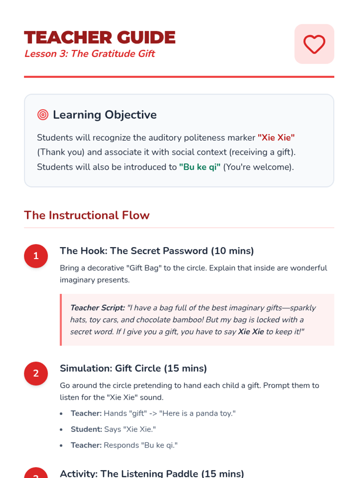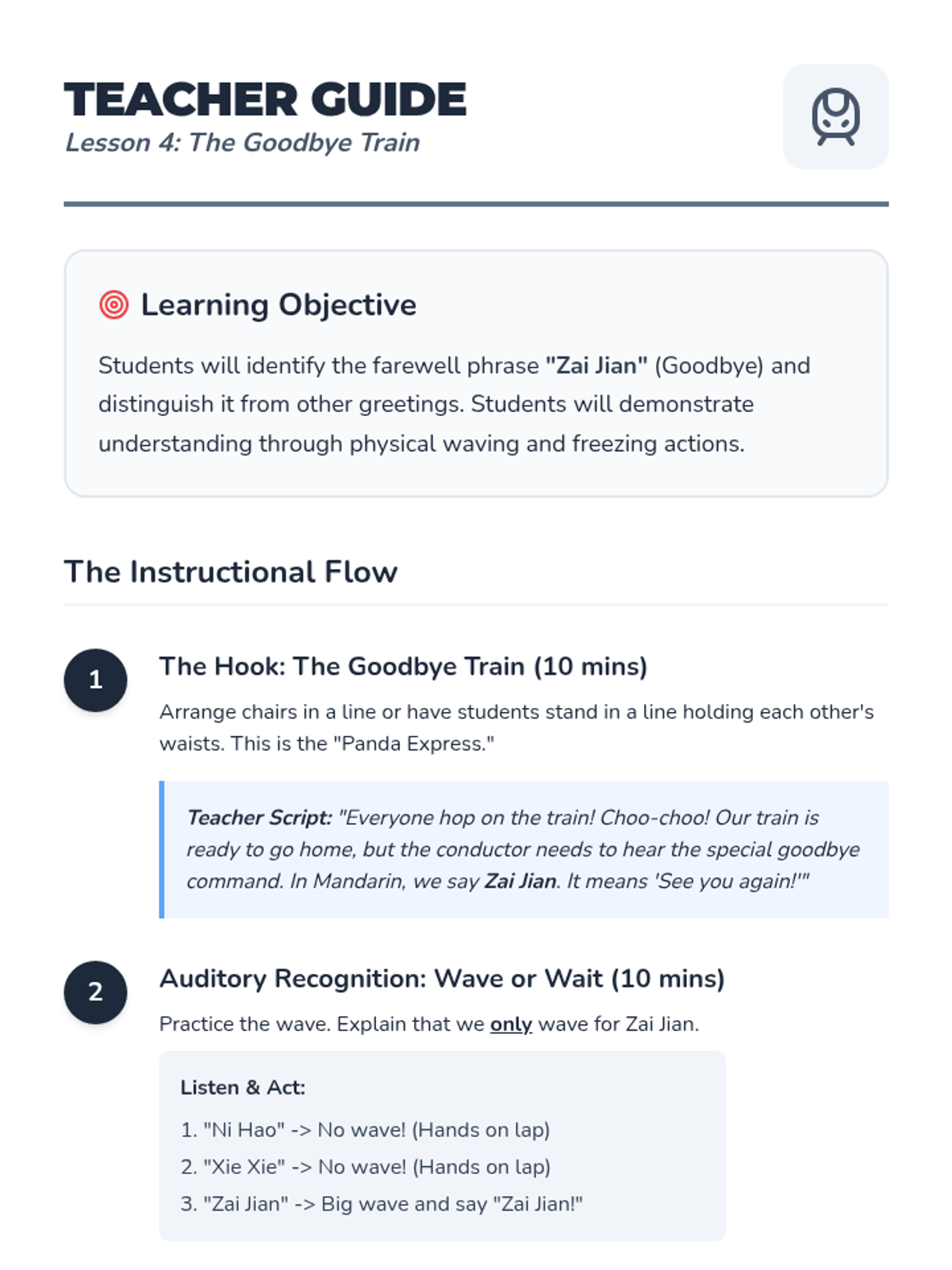 A Kindergarten sequence introducing Mandarin Chinese greetings and social courtesies through immersive listening, games, and role-play. Students learn to recognize Ni Hao, Laoshi, Tongxue, Xie Xie, and Zai Jian.
