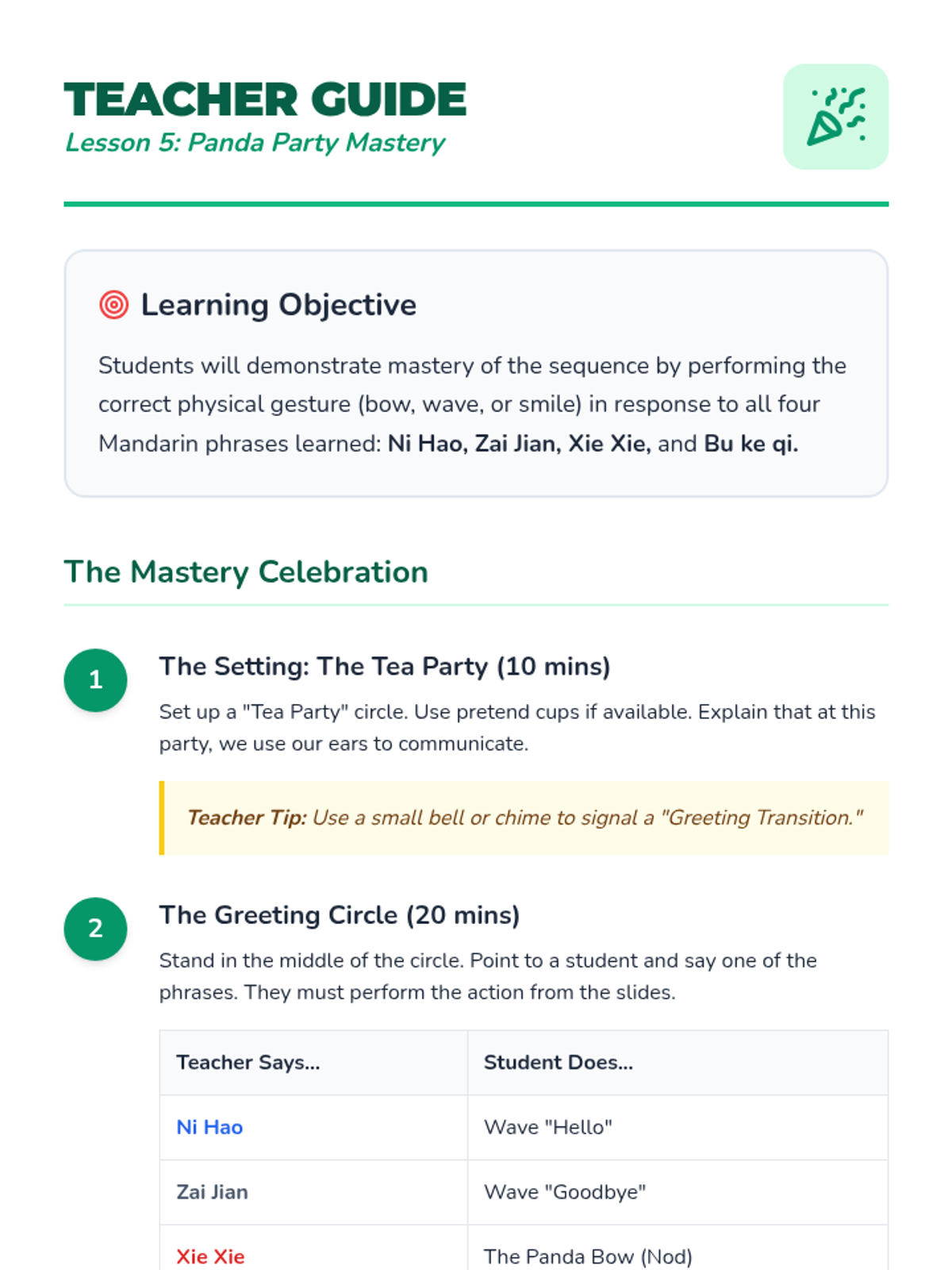A Pre-K sequence focused on teaching basic Mandarin greetings and social etiquette through play, puppets, and a final tea party synthesis. Students learn phrases for hello, goodbye, thank you, and sorry in a culturally immersive environment.