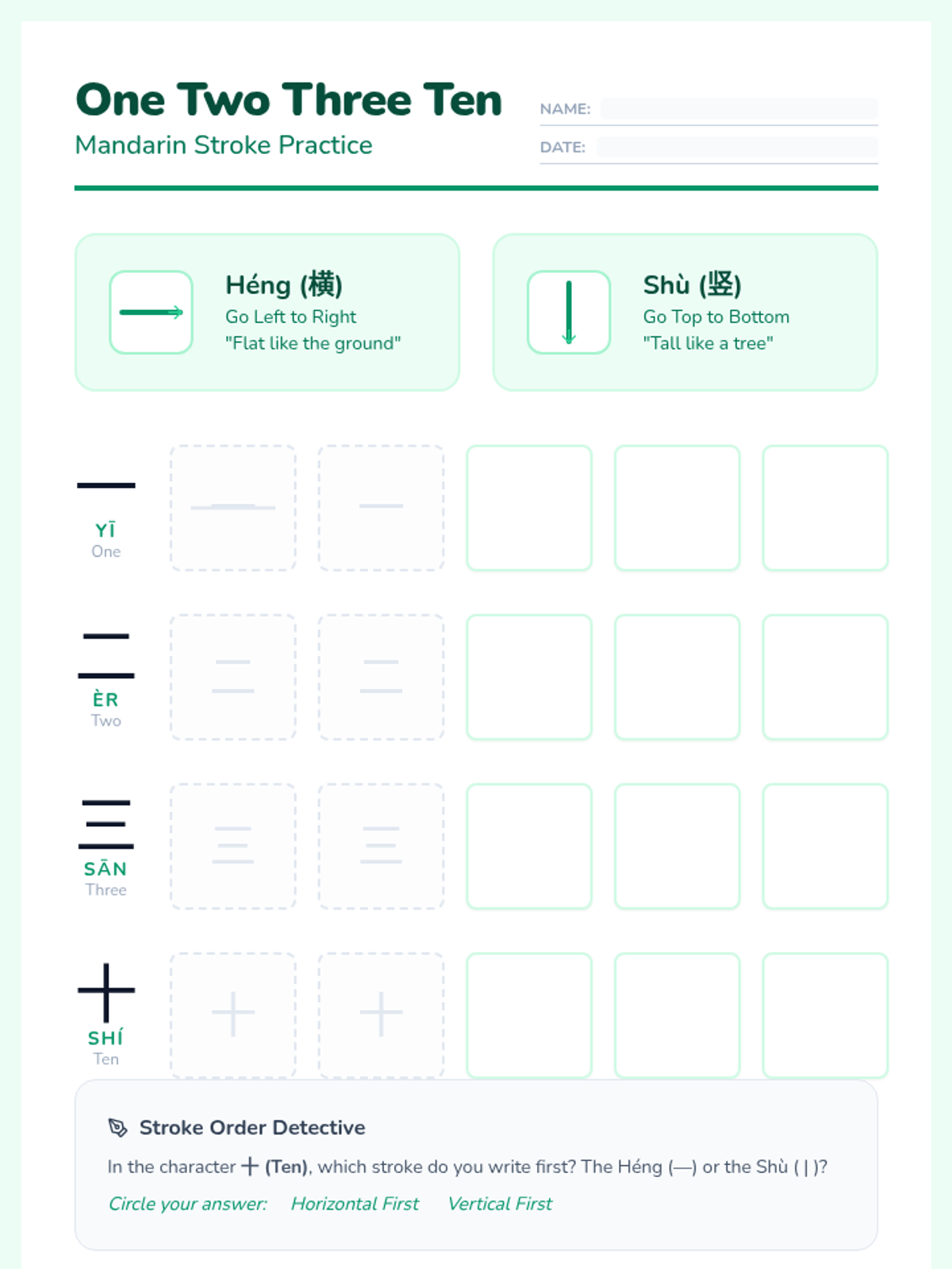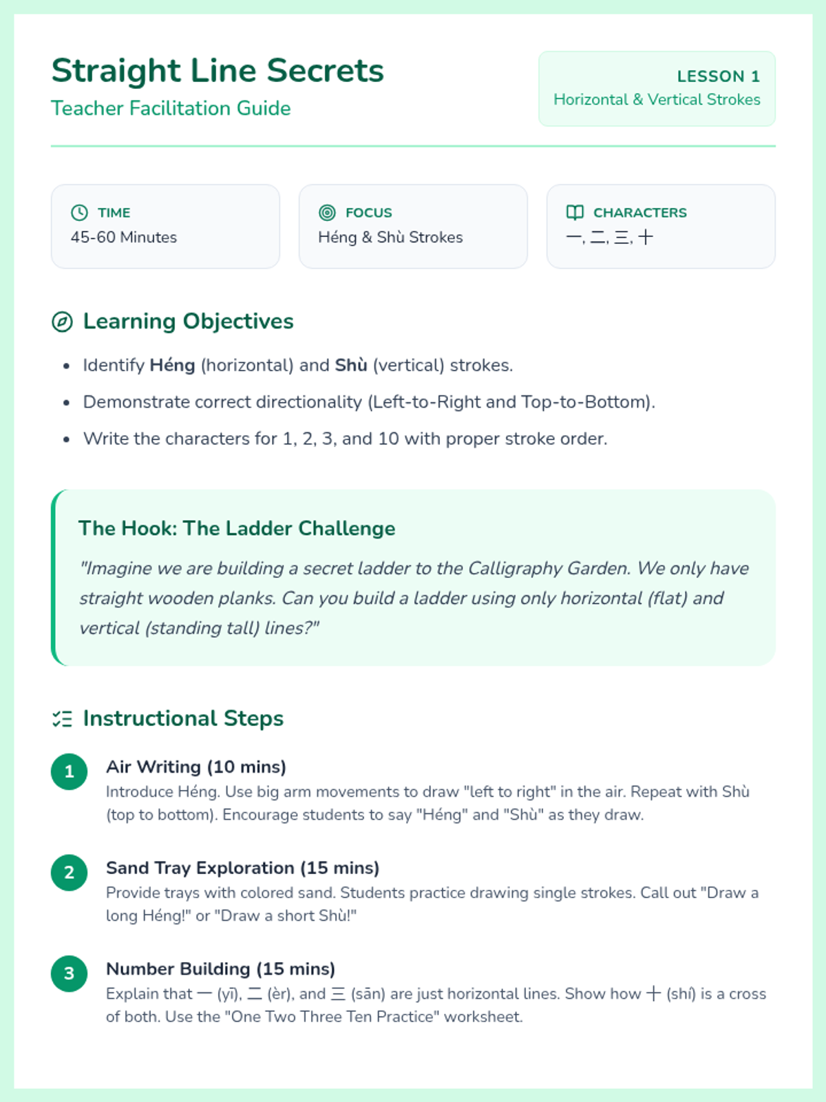 A comprehensive introduction to the foundational mechanics of Chinese calligraphy, focusing on the six basic strokes, the seven rules of stroke order, and numerical characters 1-10. Students develop fine motor skills and cultural appreciation through grid-based practice and traditional calligraphy techniques.
